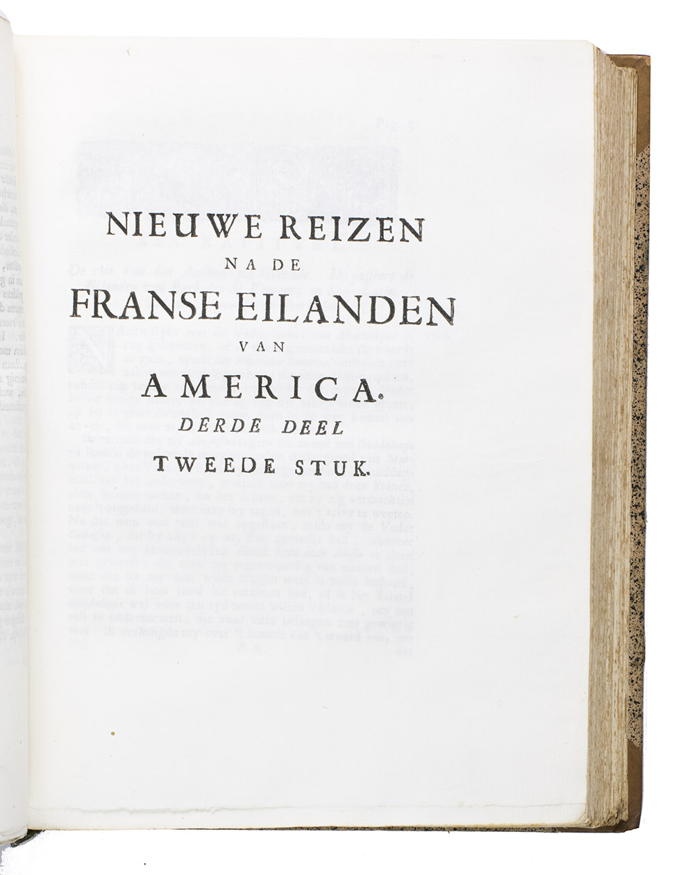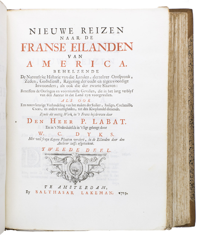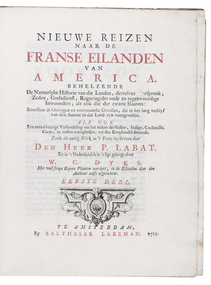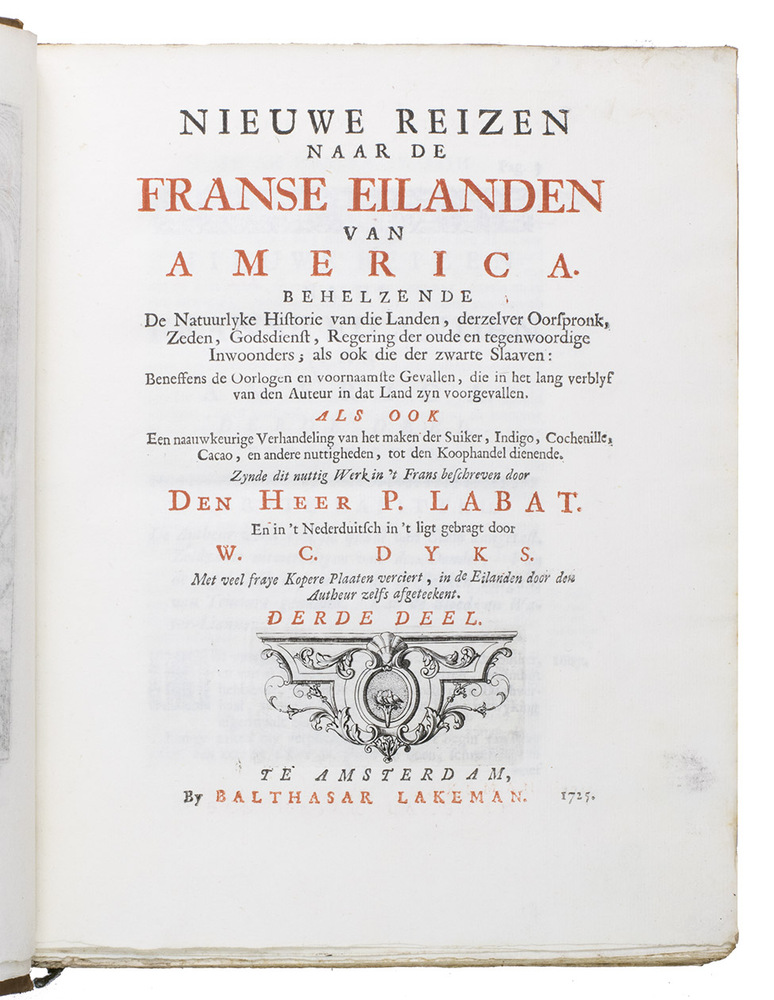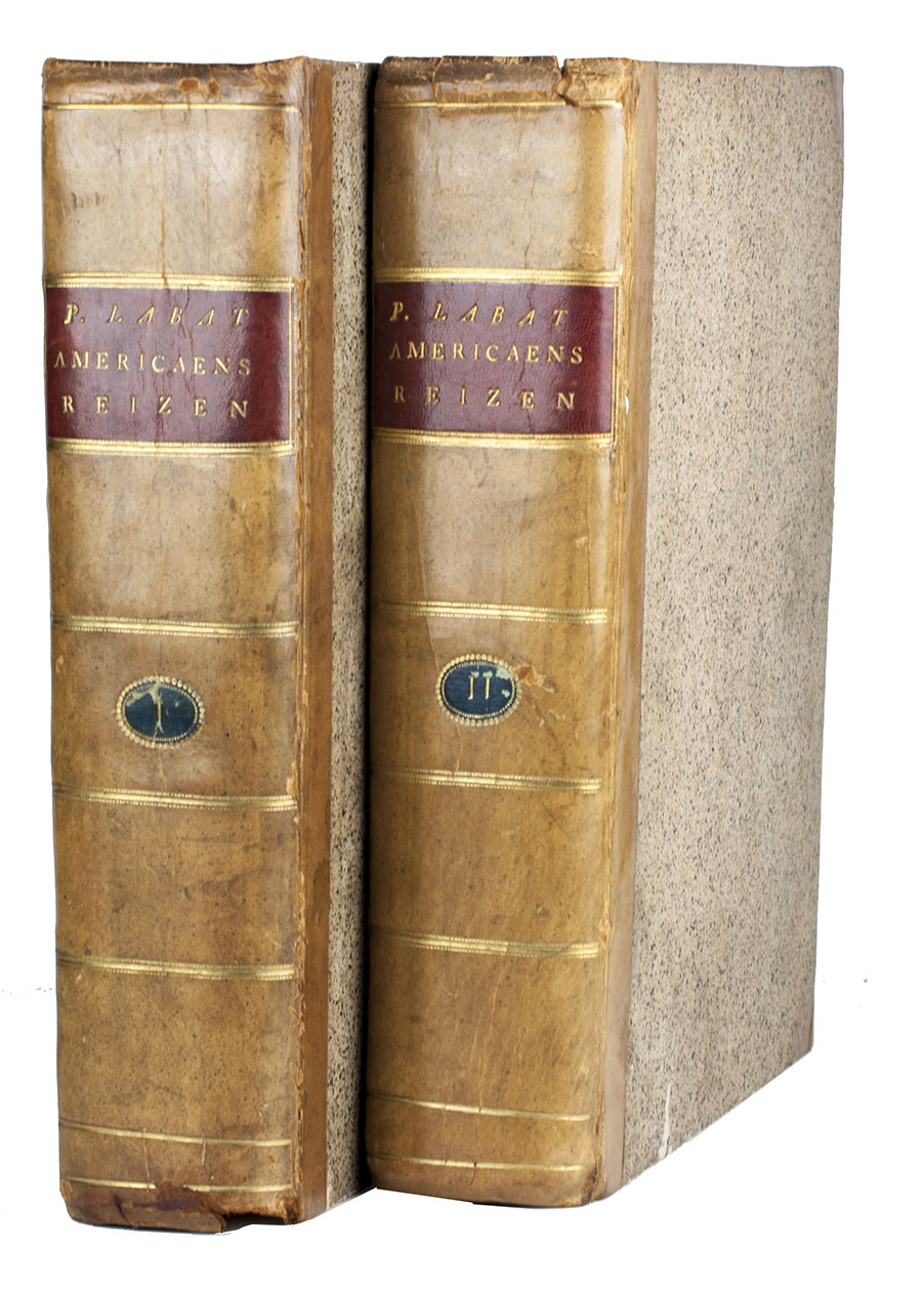 First Dutch edition of Labat's detailed journal recording his travels in the Caribbean. The work is replete with historical observations and contains important sociological, geographical, zoological, anthropological and gastronomic remarks, including an elaborate treatise on the cultivation of cocoa and the fabrication of chocolate. The maps depict North and part of South America with the Caribbean, the islands of Martinique, Barbados, Santa Domingo, etc.