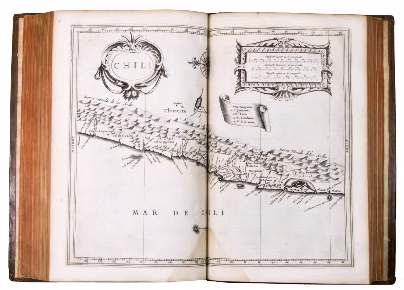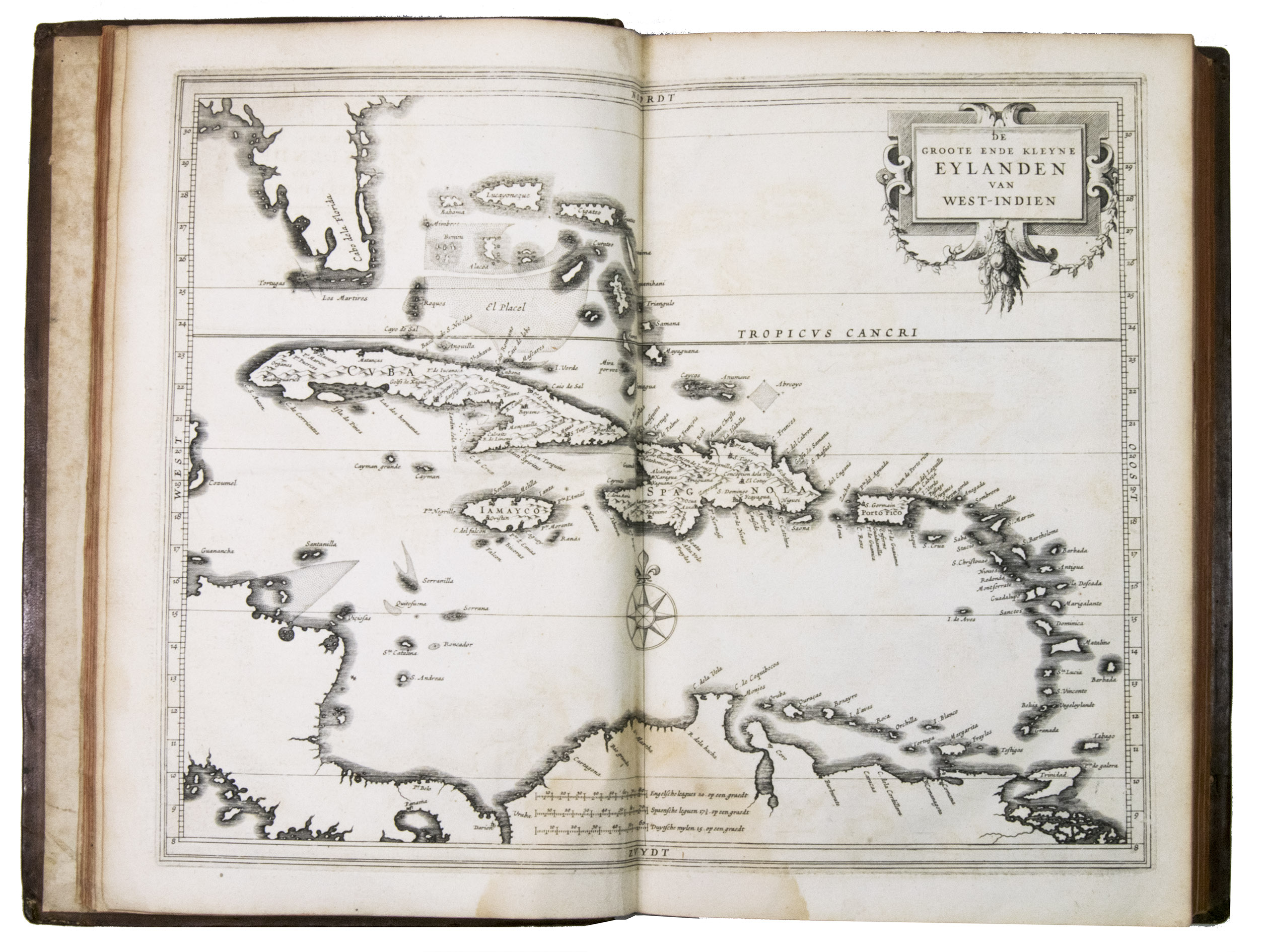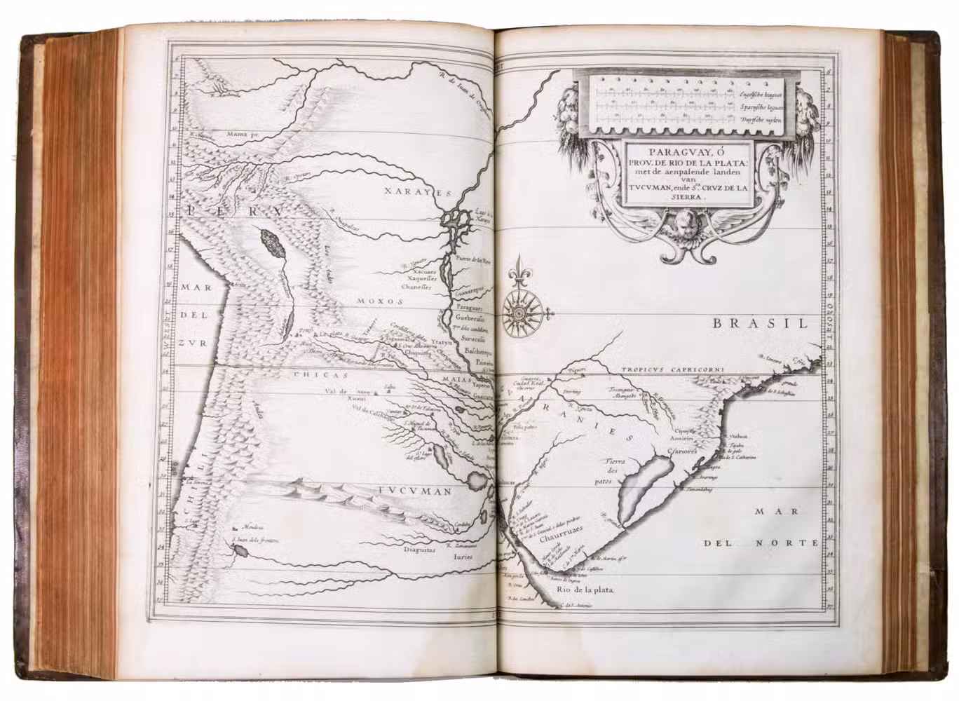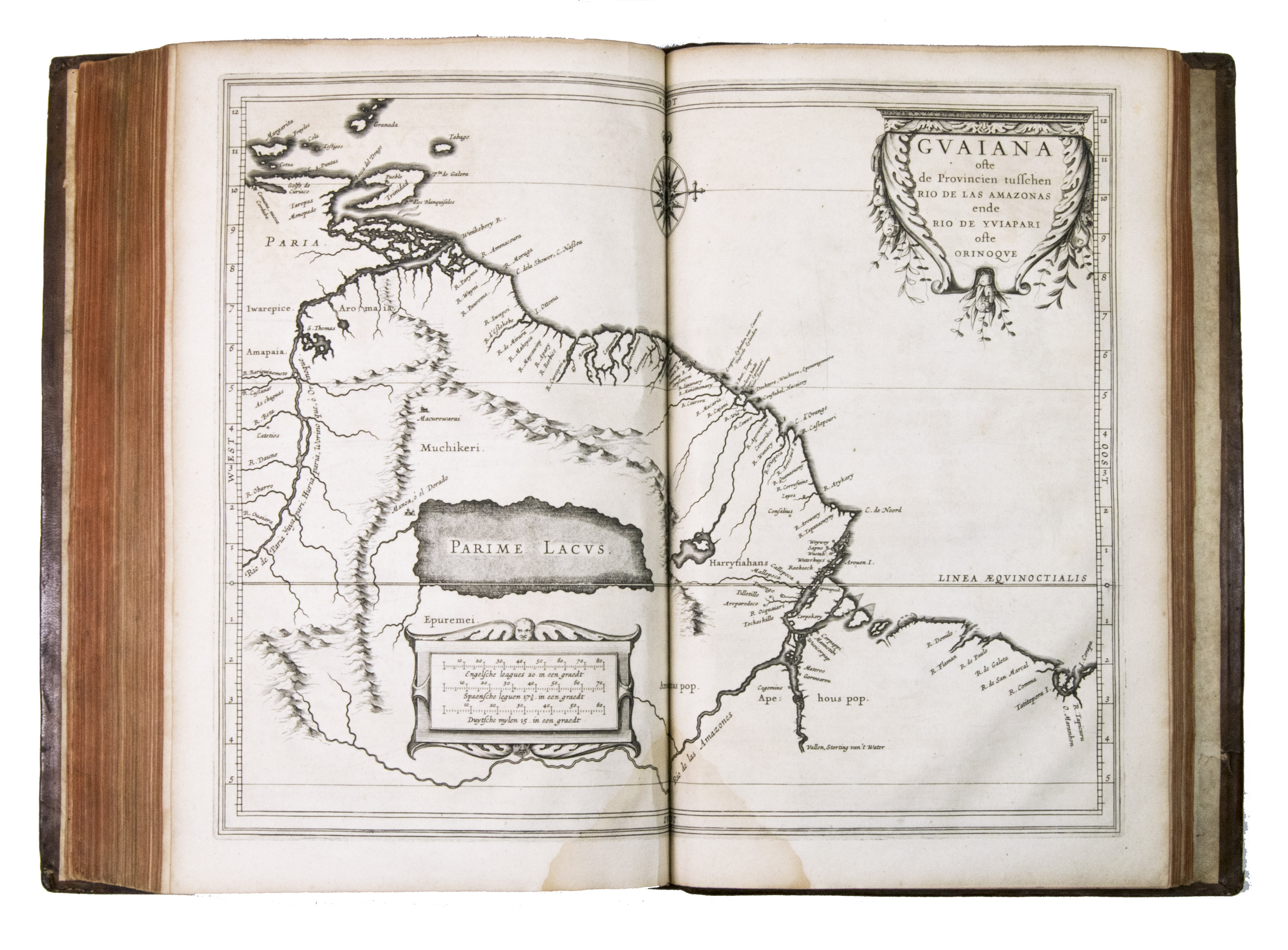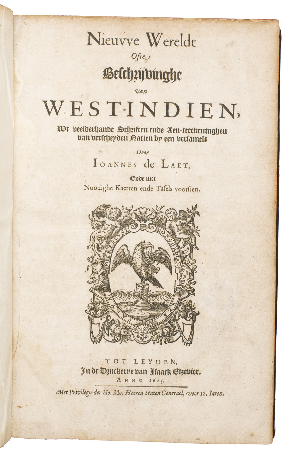With a 1793 owners signature of J.A. Valentyn. The binding has cracked at the hinges, but otherwise still good. Internally somewhat browned and occasionally spotted, with water stains in the gutter of many leaves, sometimes encroaching on the corner of the text or the bottom centre of the maps, missing the final blank leaf. Otherwise in good condition. The first edition of a classic, printed by Isaac Elzevier, showing European knowledge of the New World in 1625. Alden & Landis 625/125; Asher 1; Borba de Moraes I, p. 450; JCB II, p. 193; NNBW VIII, cols. 991-992; Nissen, ZBI 2359 (erroneously dated 1626); Phillips & LeGear 1147; Rahir, Les Elzevier 195; Sabin 38554; Tiele, Volkenkunde 626; Willems 230; cf. Bosch, Brasilien-Bibliothek 85 (French ed. 1640); Lande, Canadiana 492 (French ed. of 1640); Rodrigues, Bib. Brasiliense 1351 (2nd ed.).