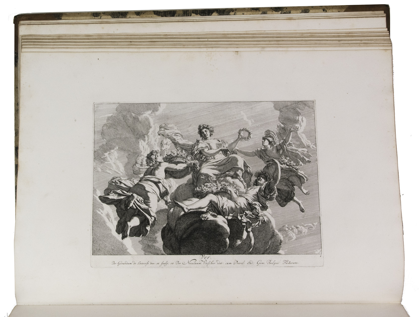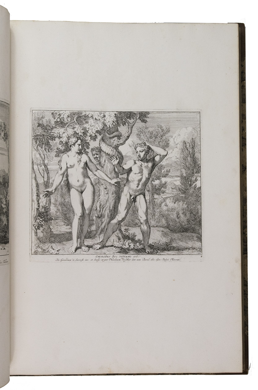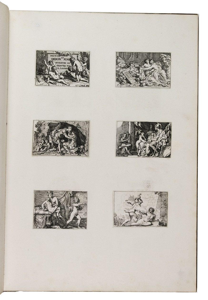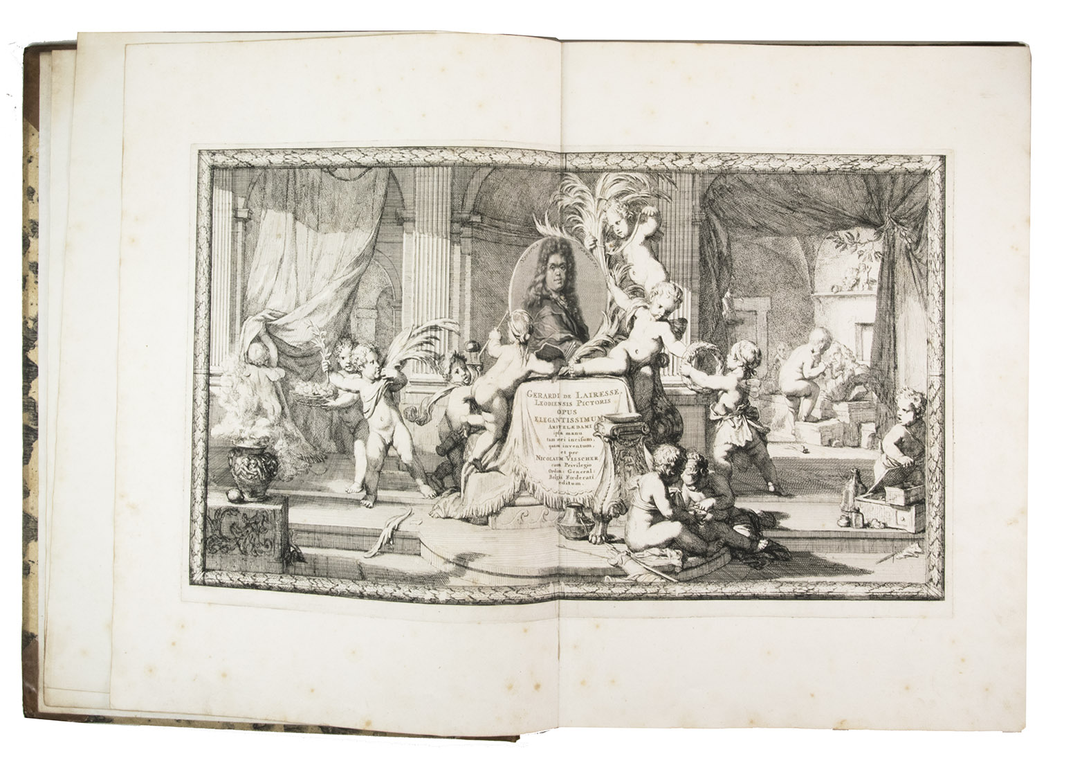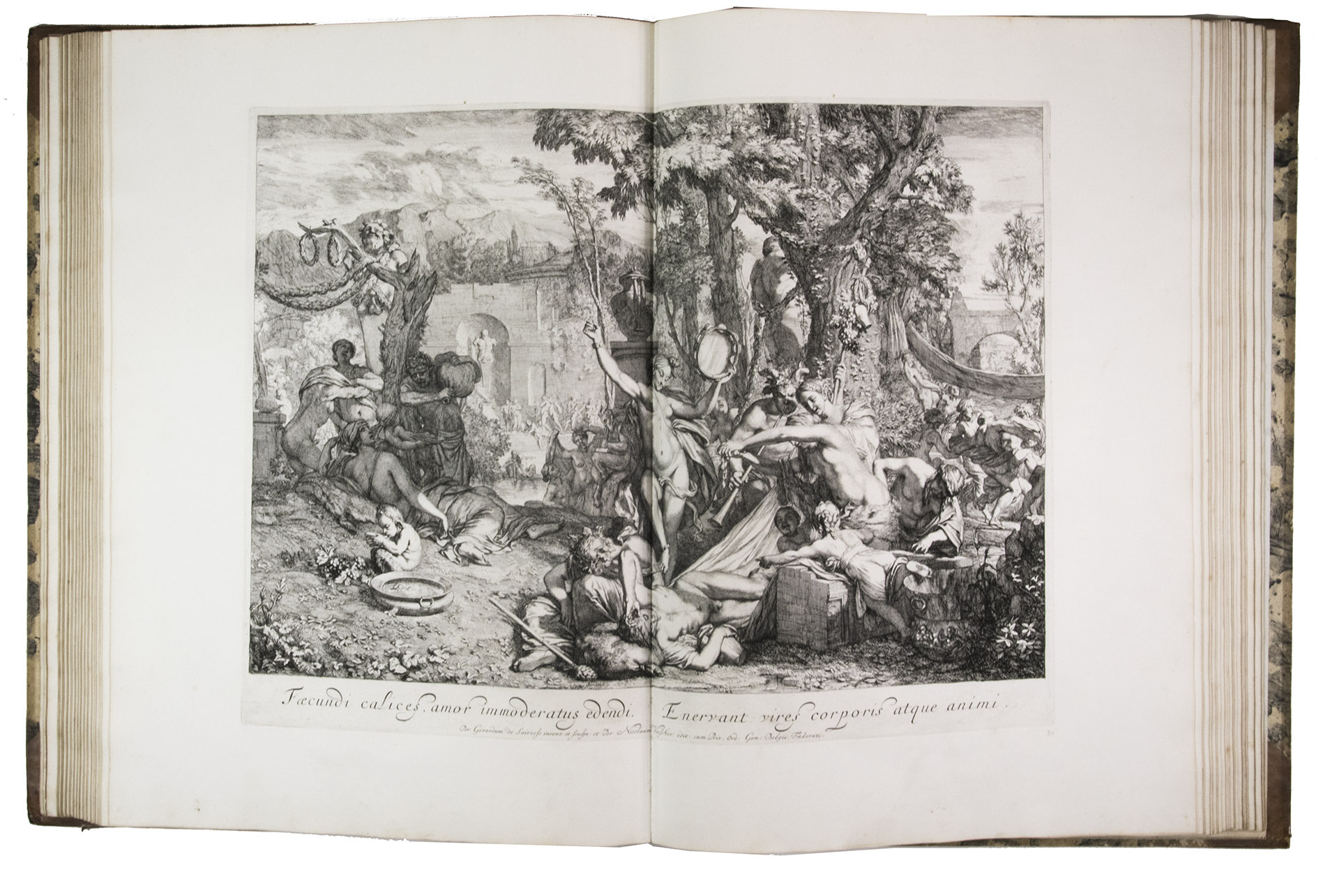 Beautiful set of engraved illustrations by the Dutch Golden Age painter and engraver Gerard de Lairesse (1641-1711) in its first state, with the engravings bearing the imprint of N. Visscher. Almost all known copies of the present work show differences in contents and order of the plates. The present copy contains the large double-page engraved title-page, the engraved title-page of the appendix and more than 100 engraved illustrations of varying sizes on 56 double-page leaves, including 31 large double-page illustrations.