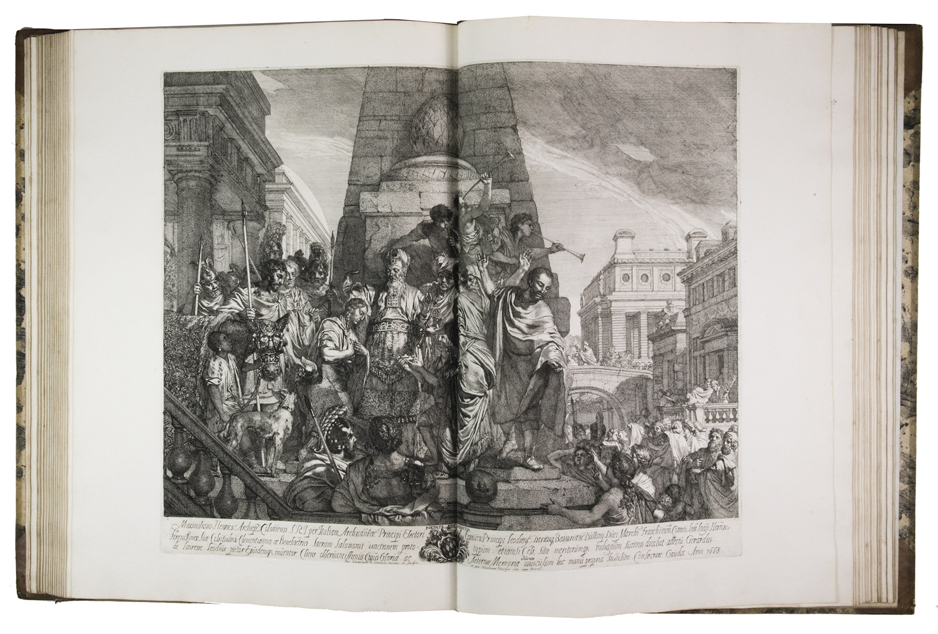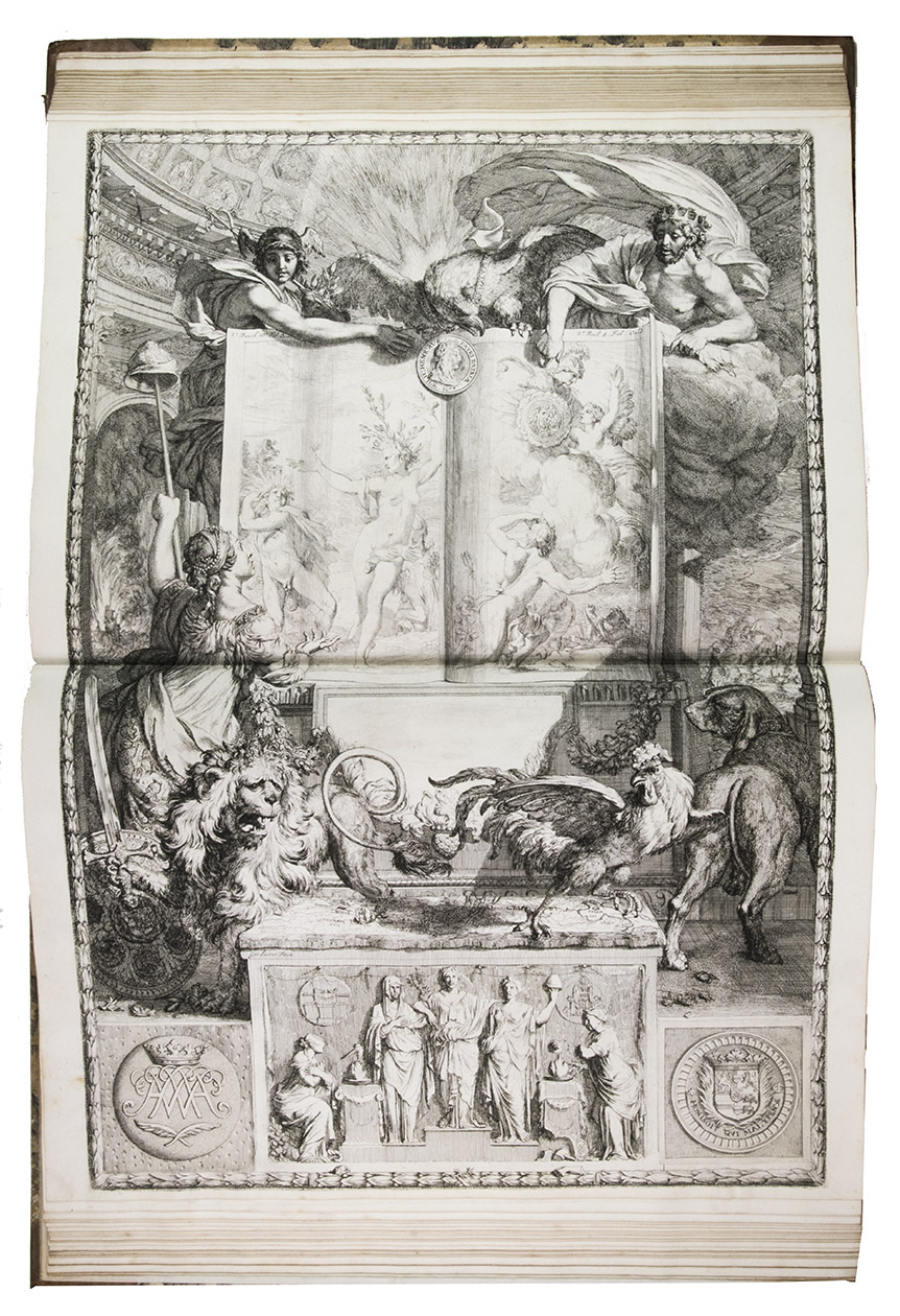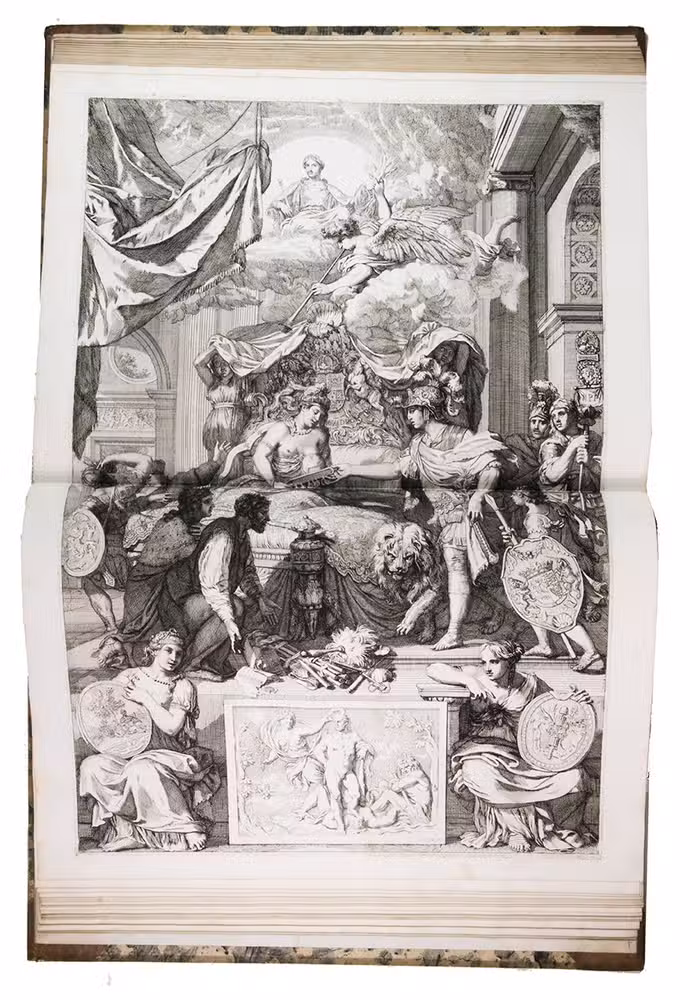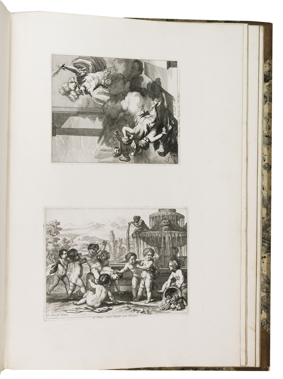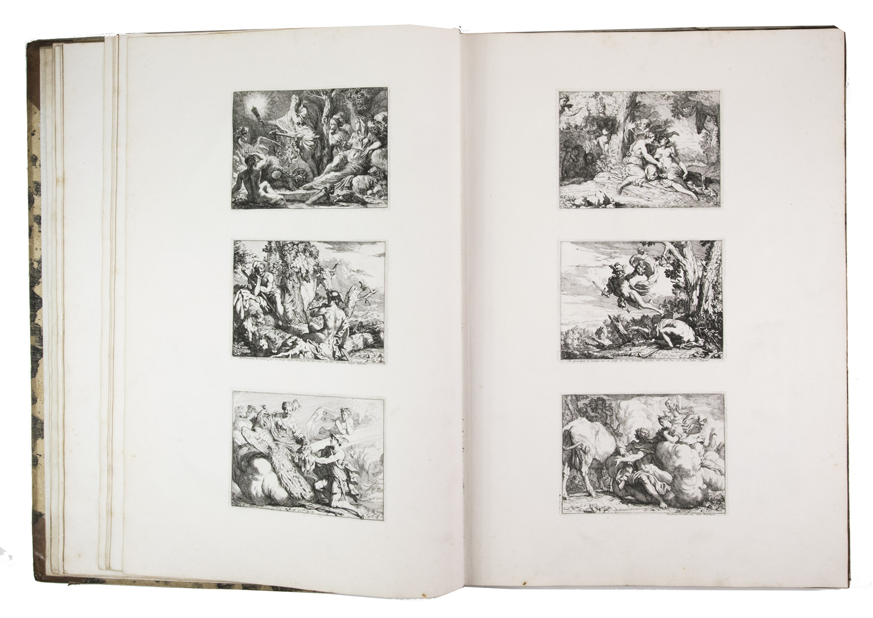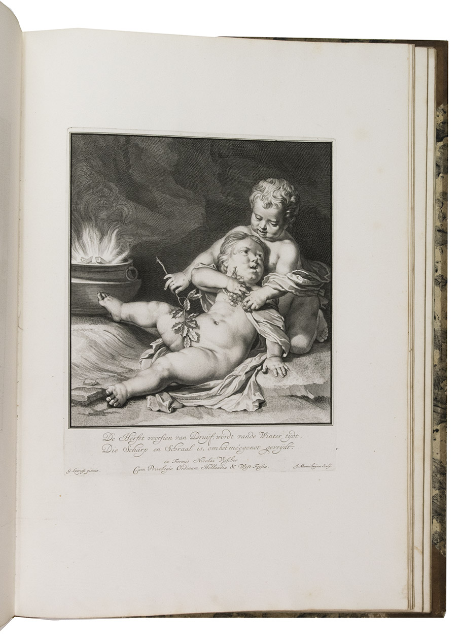 Beautiful set of engraved illustrations by the Dutch Golden Age painter and engraver Gerard de Lairesse (1641-1711) in its first state, with the engravings bearing the imprint of N. Visscher. Almost all known copies of the present work show differences in contents and order of the plates. The present copy contains the large double-page engraved title-page, the engraved title-page of the appendix and more than 100 engraved illustrations of varying sizes on 56 double-page leaves, including 31 large double-page illustrations.