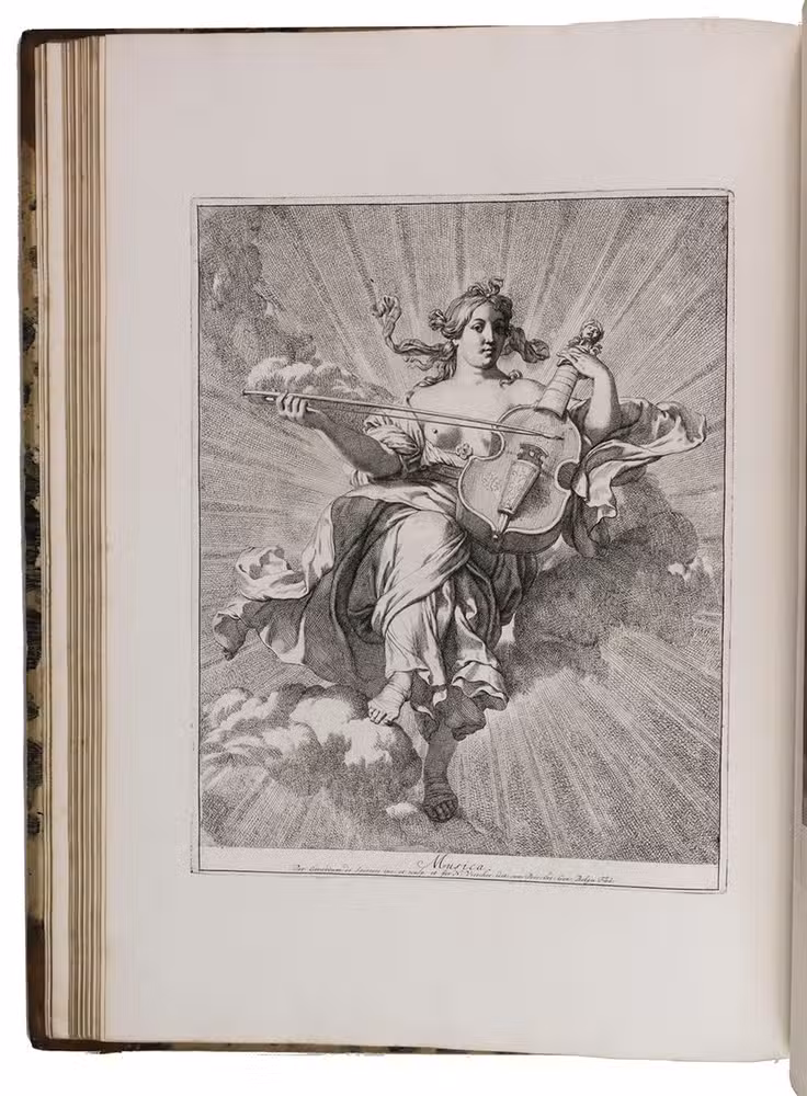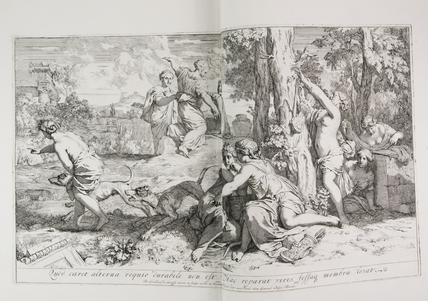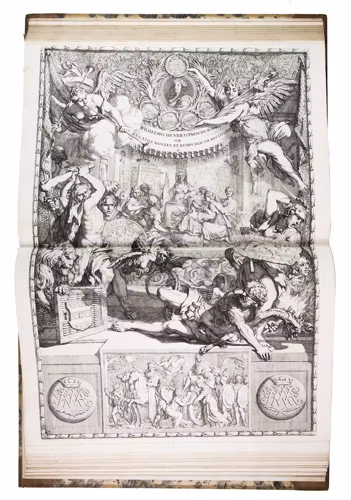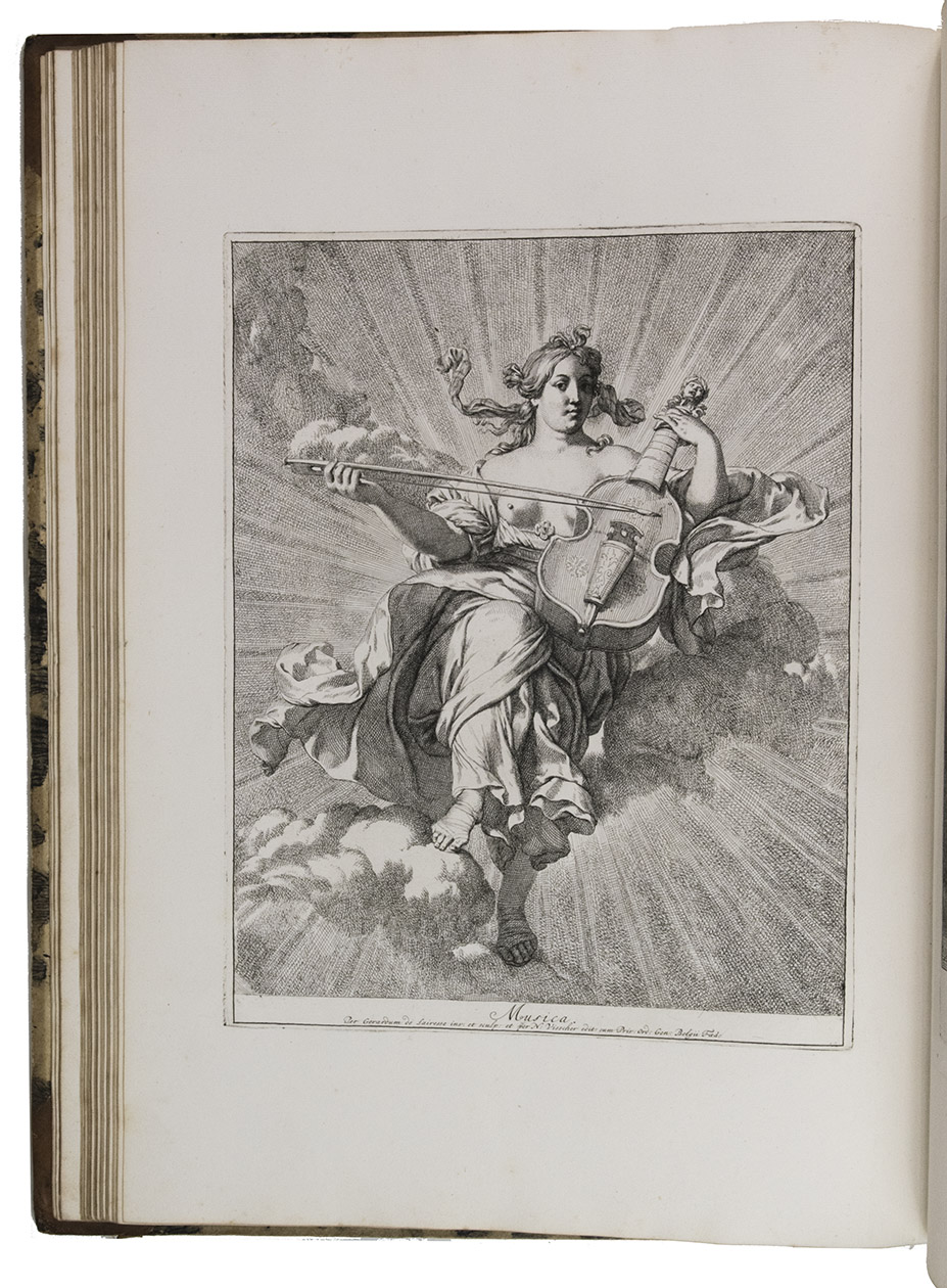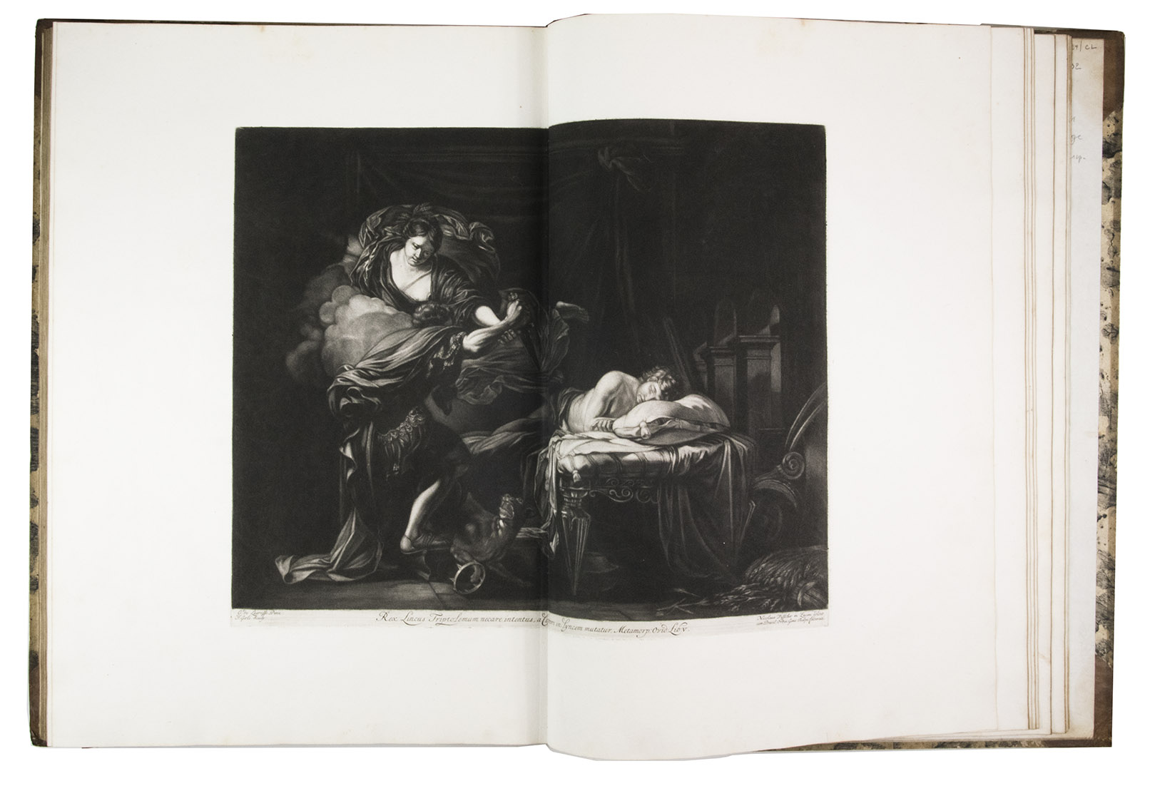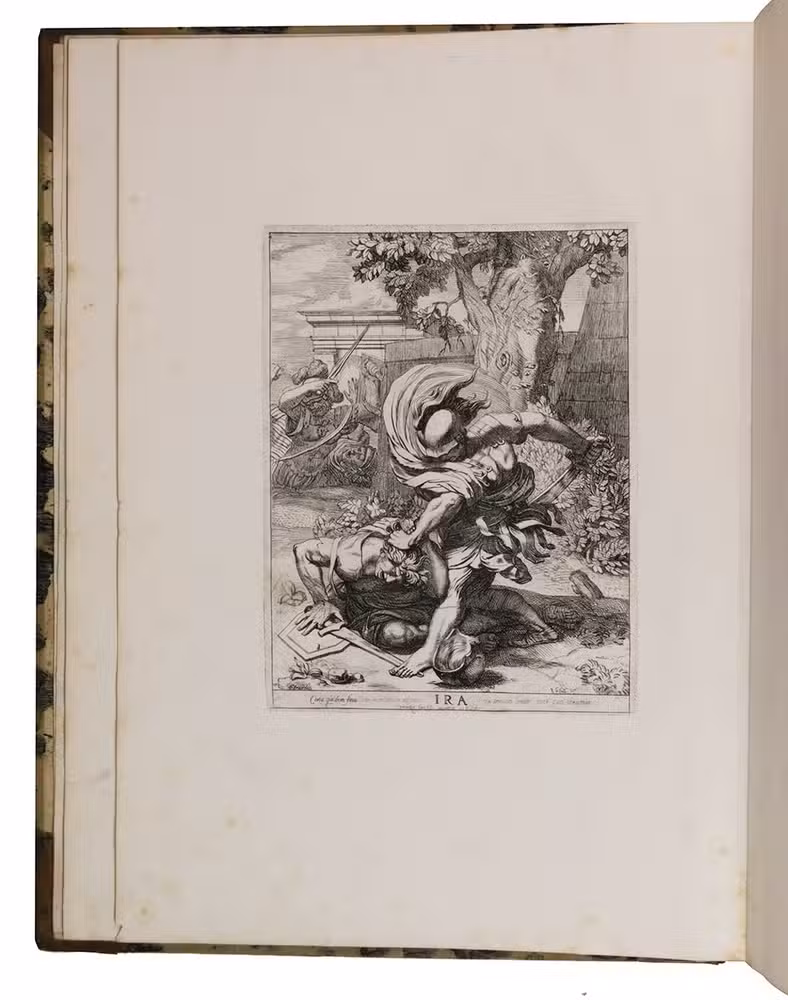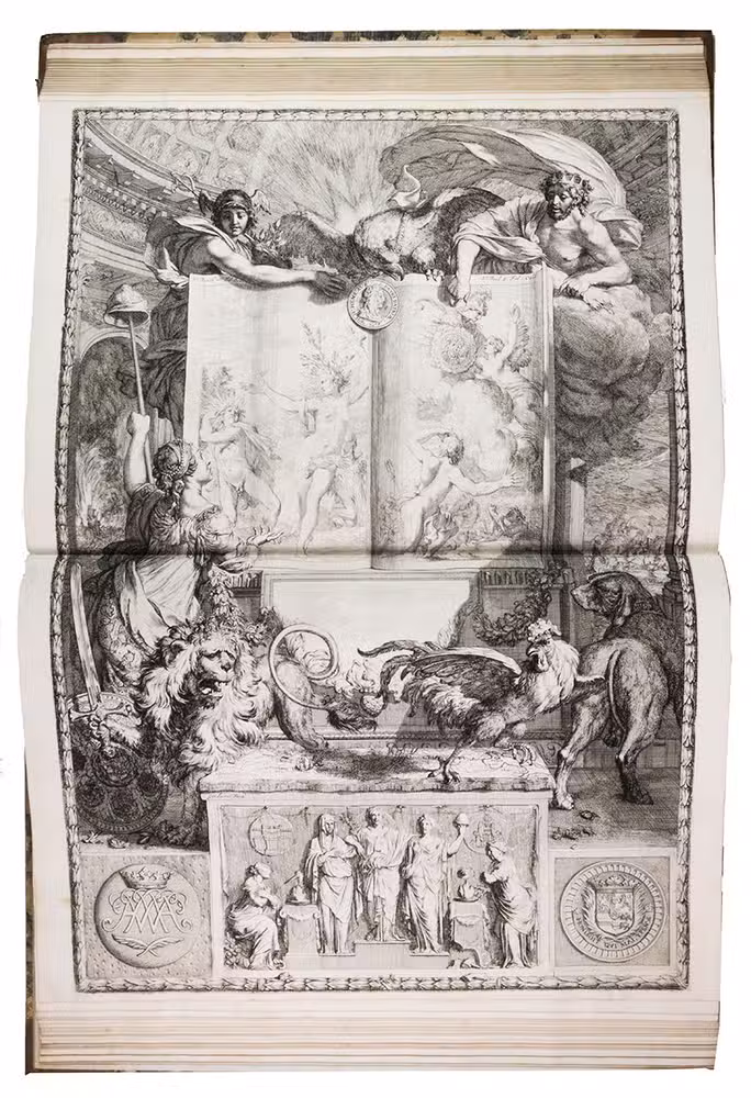 Beautiful set of engraved illustrations by the Dutch Golden Age painter and engraver Gerard de Lairesse (1641-1711) in its first state, with the engravings bearing the imprint of N. Visscher. Almost all known copies of the present work show differences in contents and order of the plates. The present copy contains the large double-page engraved title-page, the engraved title-page of the appendix and more than 100 engraved illustrations of varying sizes on 56 double-page leaves, including 31 large double-page illustrations.