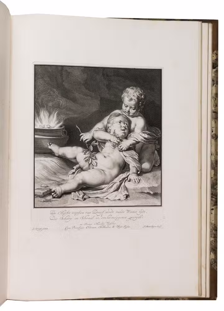 With the bookplate of the Dutch art collector Joseph Augustin Brentano (1753-1821) on the front paste-down, with his signature at the foot of the bookplate in brown ink "J. A. Brentano".The binding shows slight signs of wear, slight foxing to the first few leaves and very slight foxing to the edges of the leaves throughout, the illustrations remain fine and clean. Overall in very good condition. STCN 317791346 (3 copies); Timmers, Gérard Lairesse, 24; WorldCat 22670296 (4 copies); 900782756 (4 copies, incl. 1 the same as STCN); 740253279 (2 copies, same as STCN); 54212851 (1 copy); 835994396 (5 copies). For De Lairesse: Thieme Becker 22, p. 233-237.