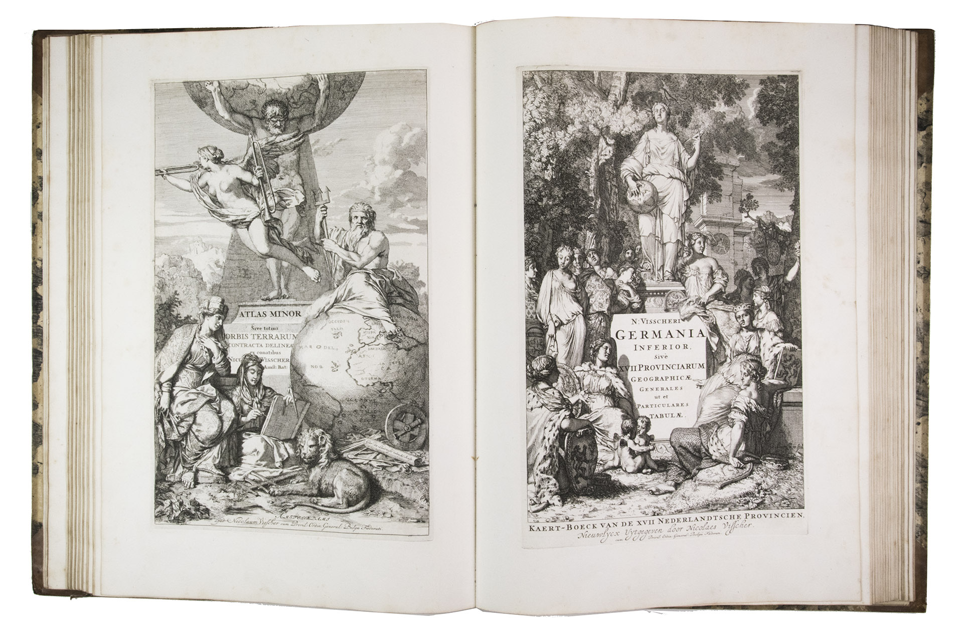 [Amsterdam], [Nicolaas Visscher II], [ca. 1690?]. 1mo (52 x 39 cm). With a double-page engraved title-page, an engraved title-page of the appendix and more than 100 engraved illustrations on 56 large double leaves, including 31 double-page engravings. 18th-century half gold-tooled, sprinkled calf, decorated paper over boards, with a gold-tooled red morocco title-label on the spine. [50]; [8] double ll.