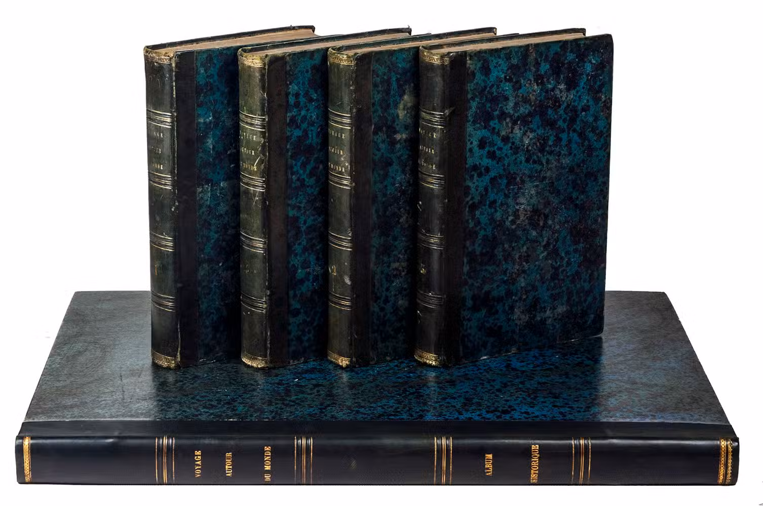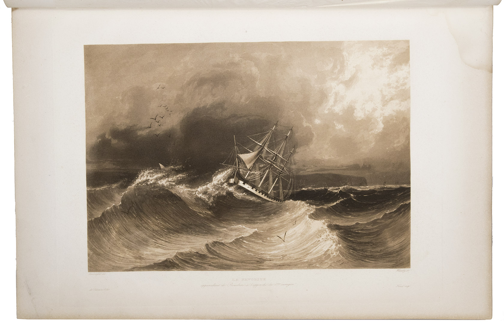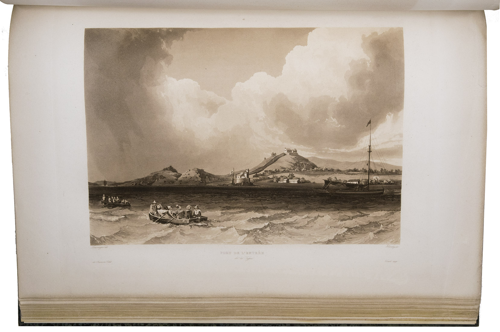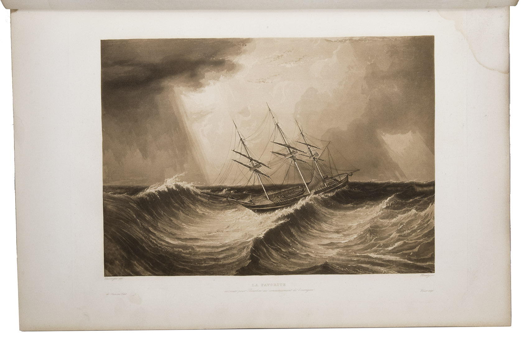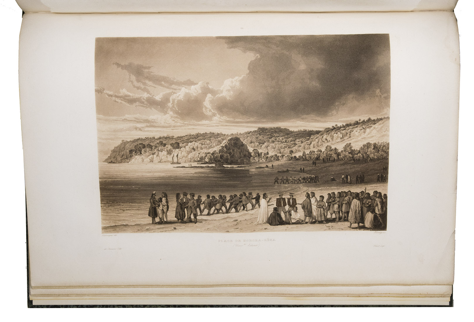 Paris, Imprimerie Royale (views volume: Arthus Bertrand; map volume: Dépôt-Générale de la Marine), 1833-1835. 4 text volumes (8vo), 1 views volume (folio) and 1 atlas volume (1mo, 66 x 51 cm). With 1 folding engraved map in the first text volume, 2 full-page maps and 10 maps on 9 double-page plates in the "atlas hydrographique", and 72 extraordinary aquatint plates (ca. 27 x 36 cm) in the "album historique", most of them with the blind-stamped image of the ship La Favorite (15 x 28 mm). Contemporary half dark green calf, gold-tooled spines. [4], XLI, 558, [2]; [4], 481, [1]; [4], 510, [2]; [4], 480; [4] pp.
