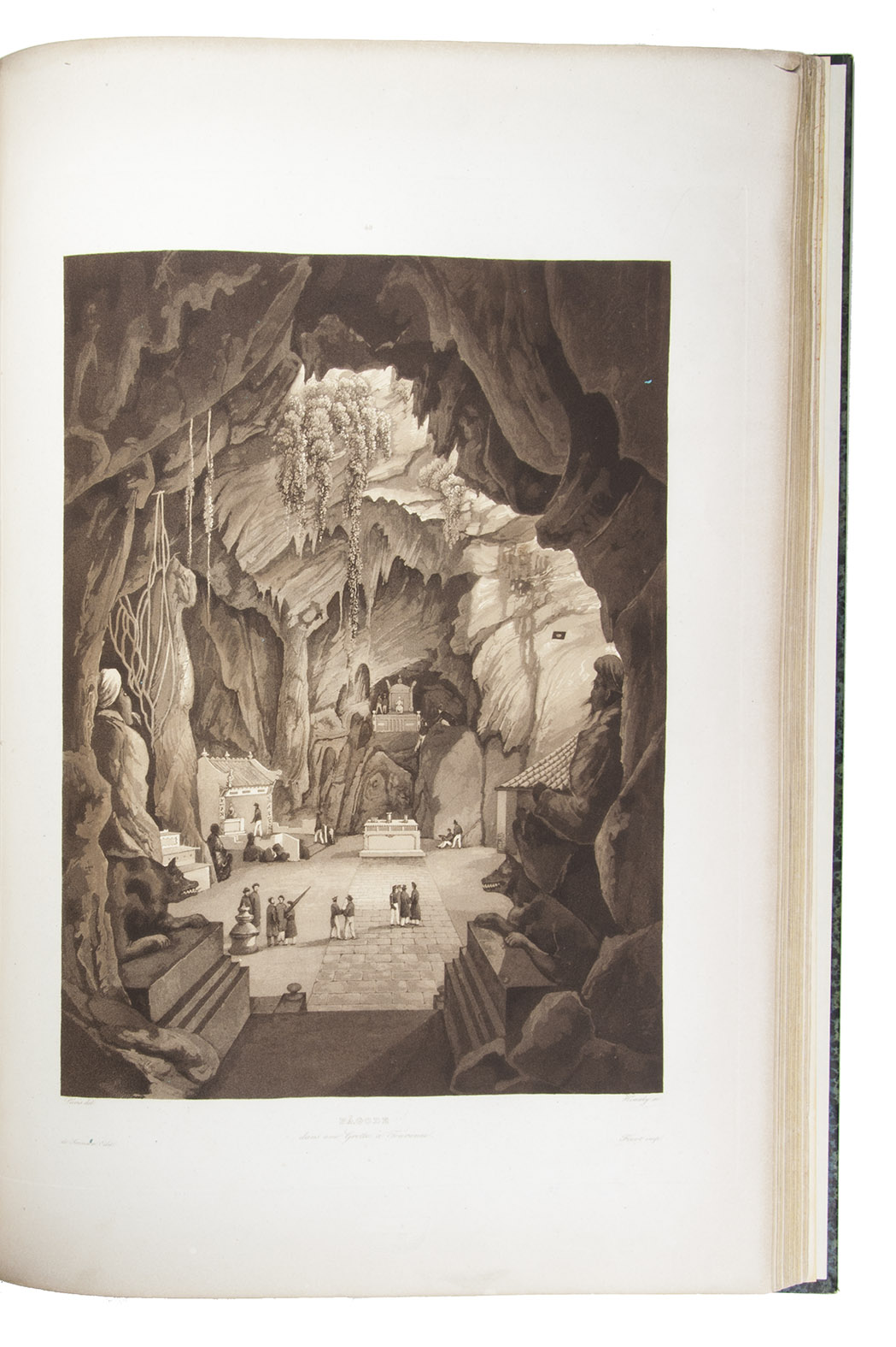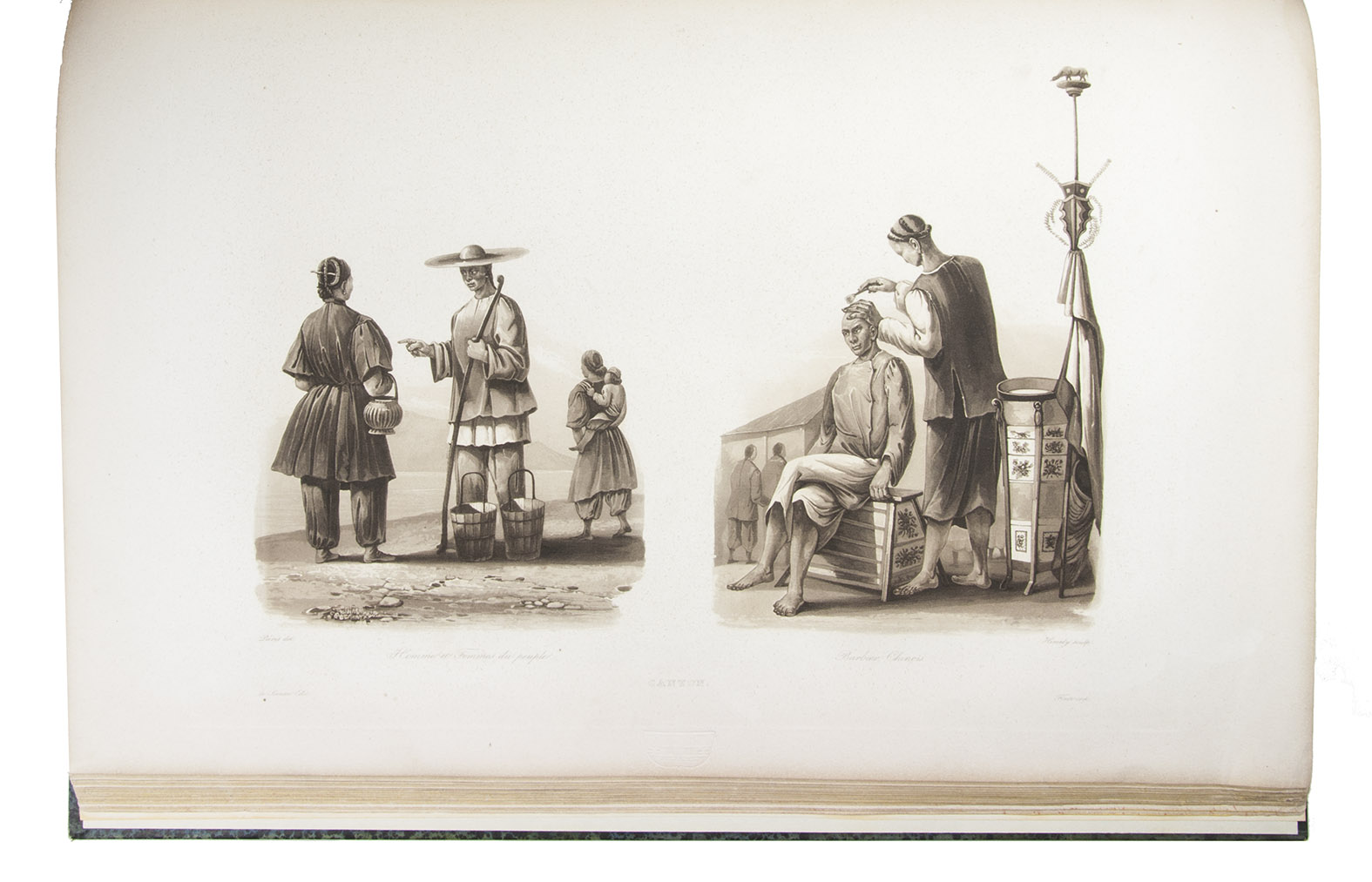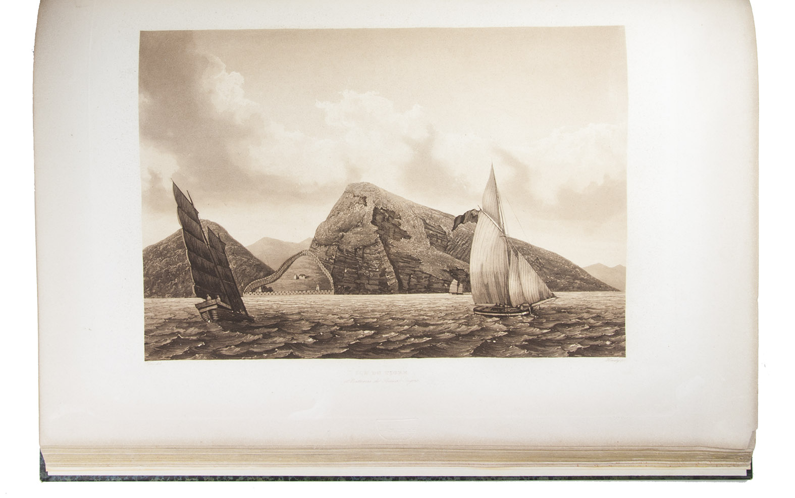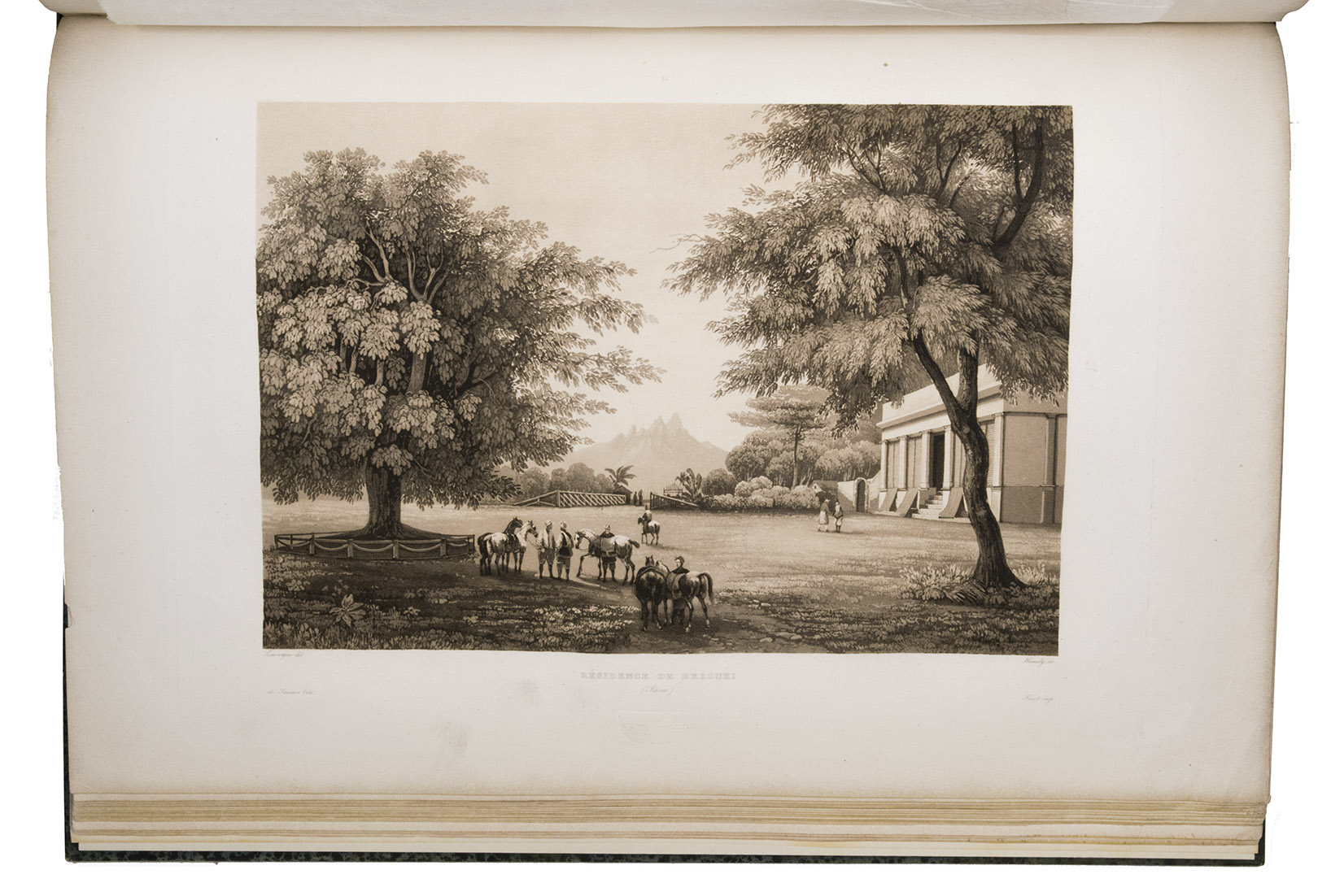 Paris, Imprimerie Royale (views volume: Arthus Bertrand; map volume: Dépôt-Générale de la Marine), 1833-1835. 4 text volumes (8vo), 1 views volume (folio) and 1 atlas volume (1mo, 66 x 51 cm). With 1 folding engraved map in the first text volume, 2 full-page maps and 10 maps on 9 double-page plates in the "atlas hydrographique", and 72 extraordinary aquatint plates (ca. 27 x 36 cm) in the "album historique", most of them with the blind-stamped image of the ship La Favorite (15 x 28 mm). Contemporary half dark green calf, gold-tooled spines. [4], XLI, 558, [2]; [4], 481, [1]; [4], 510, [2]; [4], 480; [4] pp.