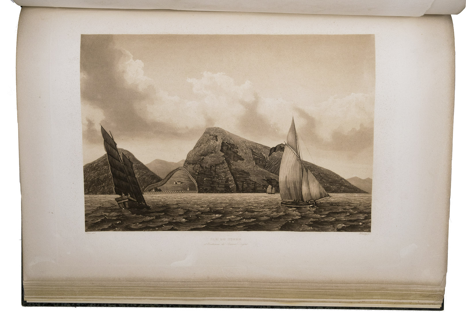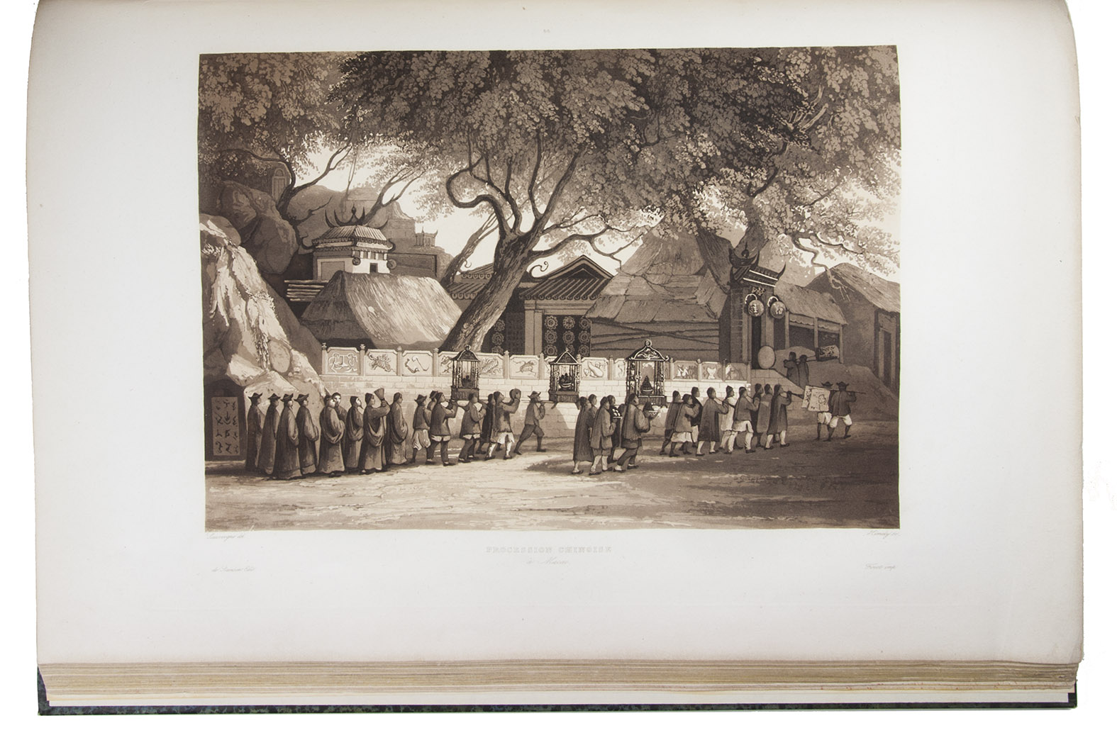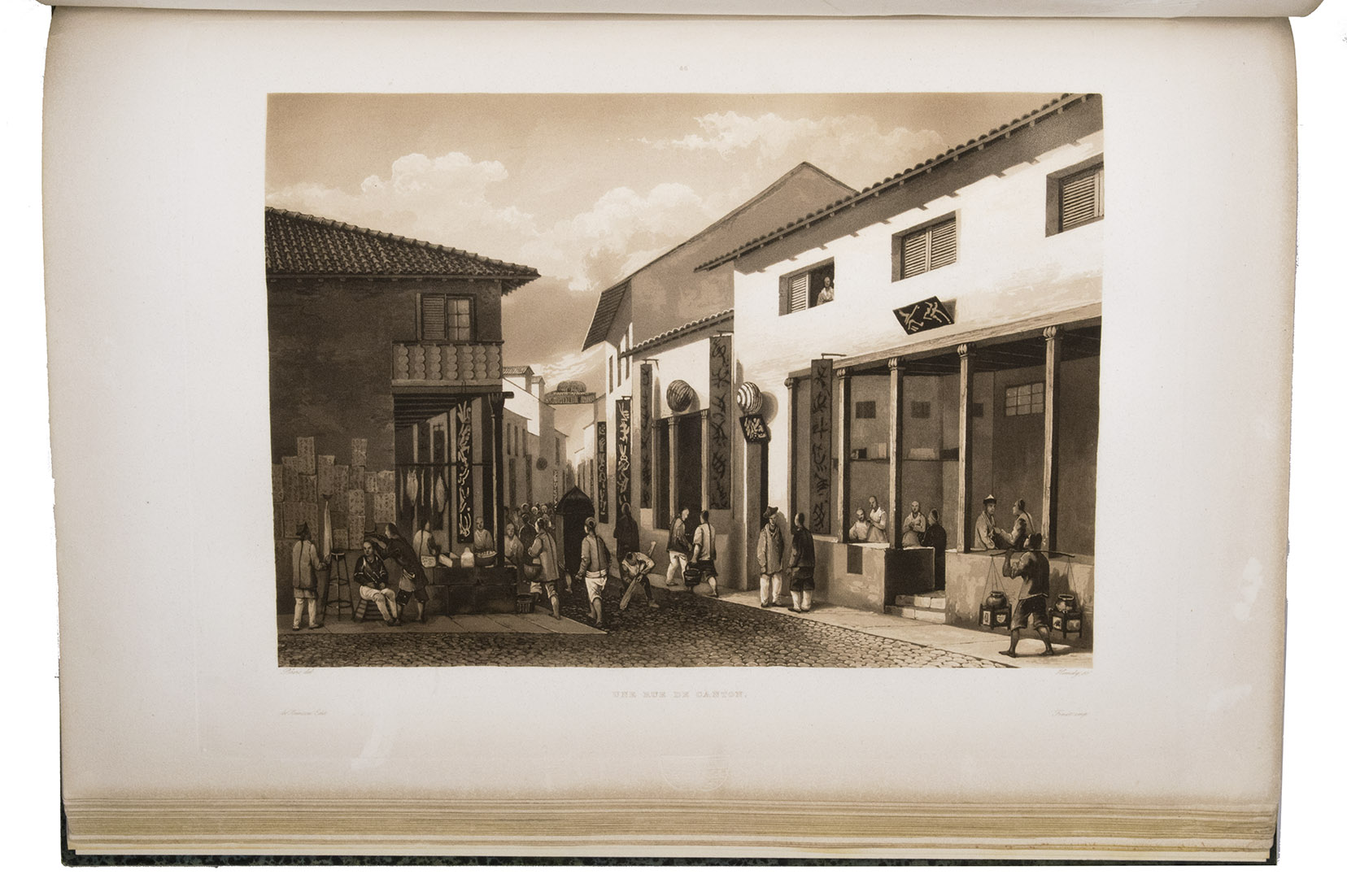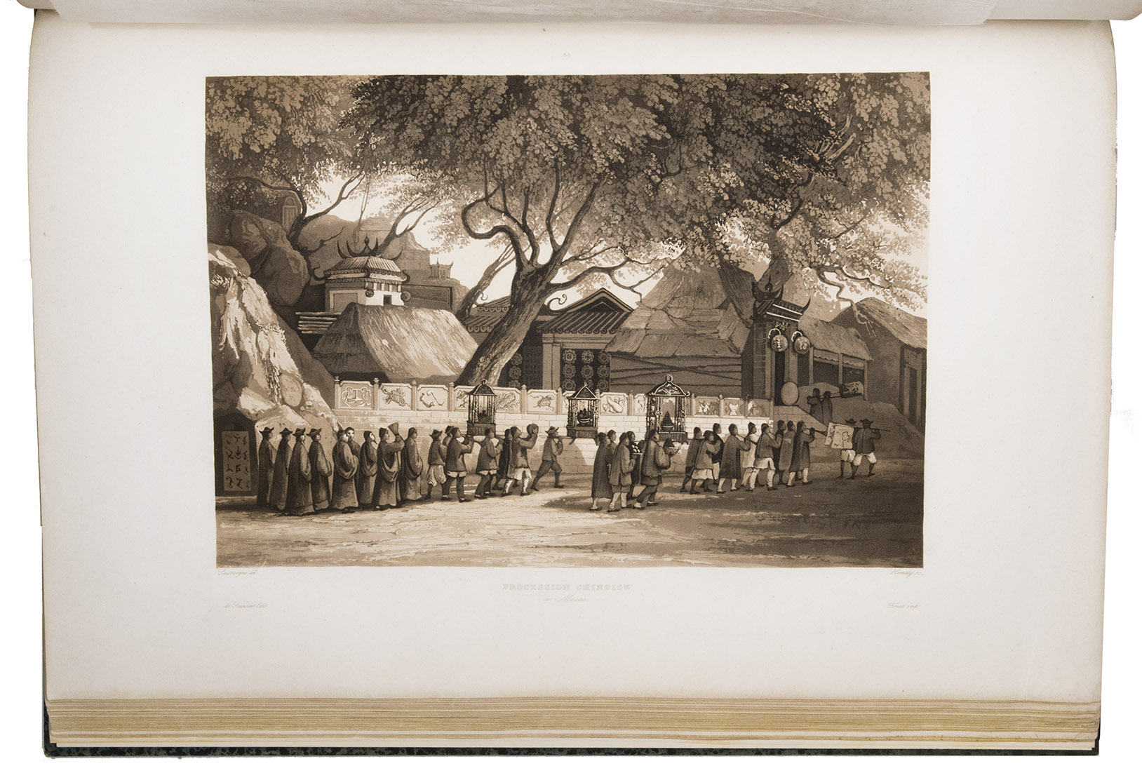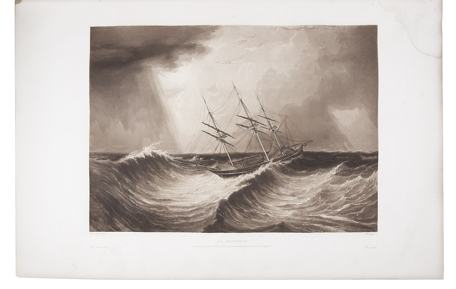 Paris, Imprimerie Royale (views volume: Arthus Bertrand; map volume: Dépôt-Générale de la Marine), 1833-1835. 4 text volumes (8vo), 1 views volume (folio) and 1 atlas volume (1mo, 66 x 51 cm). With 1 folding engraved map in the first text volume, 2 full-page maps and 10 maps on 9 double-page plates in the "atlas hydrographique", and 72 extraordinary aquatint plates (ca. 27 x 36 cm) in the "album historique", most of them with the blind-stamped image of the ship La Favorite (15 x 28 mm). Contemporary half dark green calf, gold-tooled spines. [4], XLI, 558, [2]; [4], 481, [1]; [4], 510, [2]; [4], 480; [4] pp.