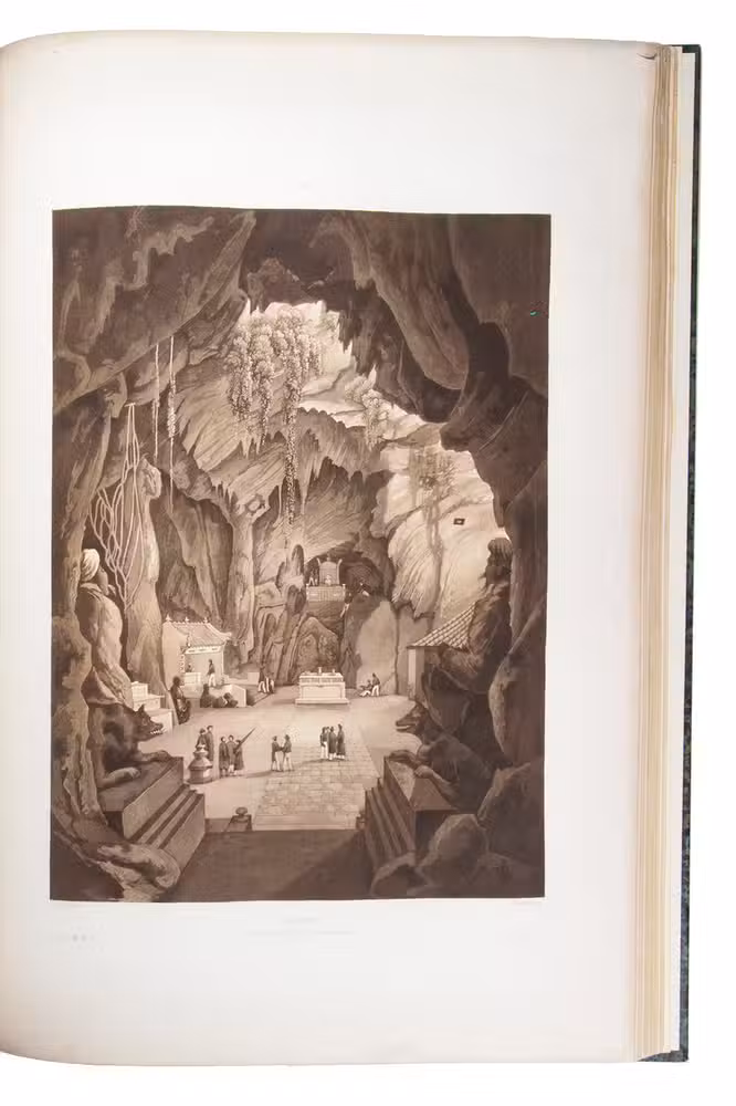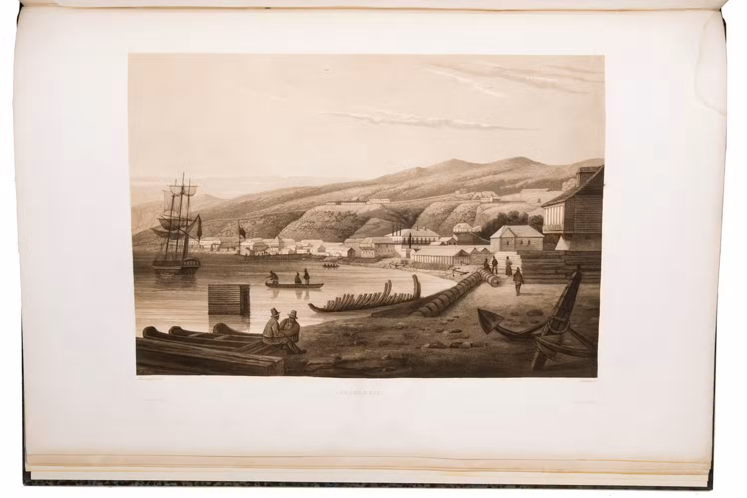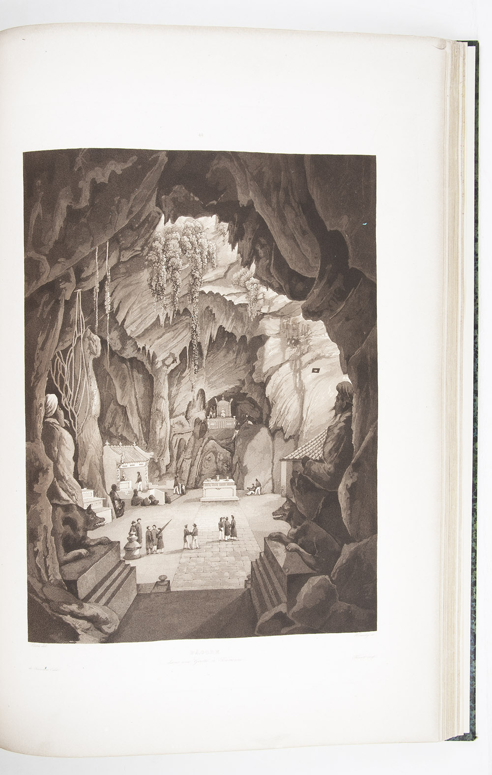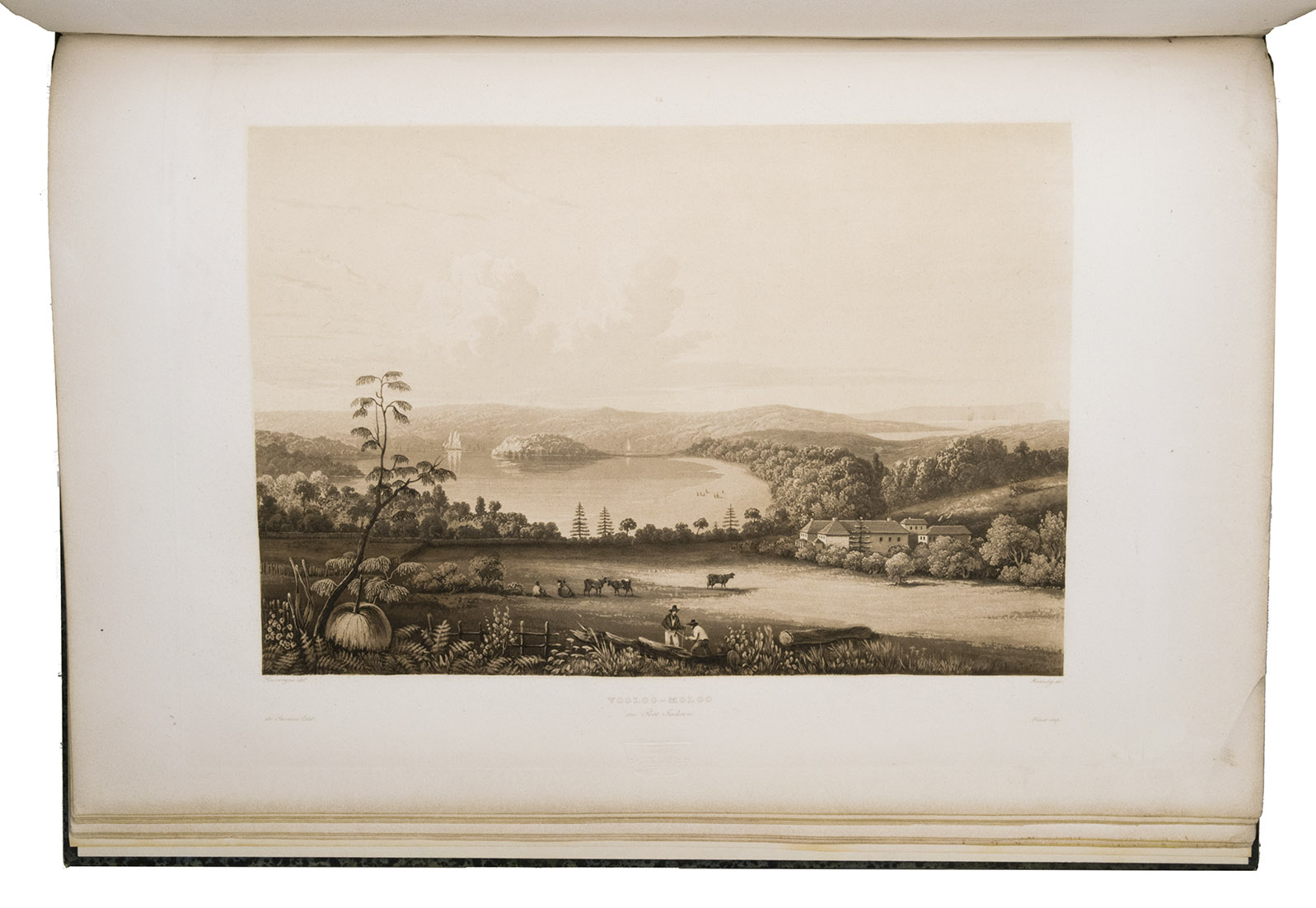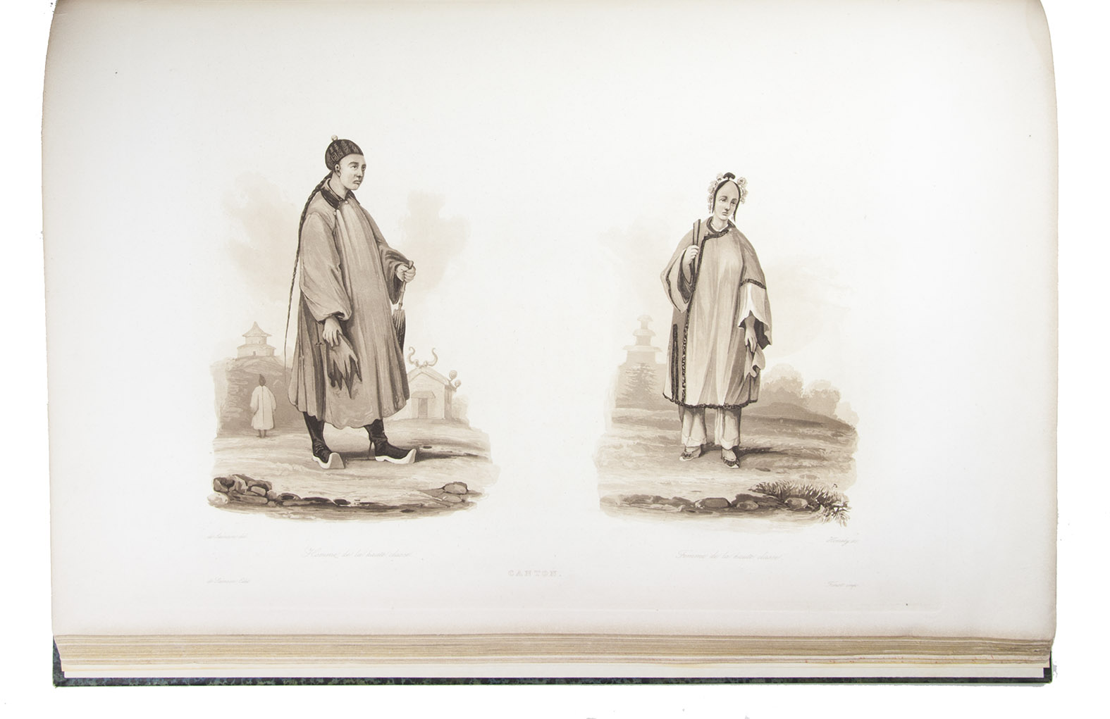 Paris, Imprimerie Royale (views volume: Arthus Bertrand; map volume: Dépôt-Générale de la Marine), 1833-1835. 4 text volumes (8vo), 1 views volume (folio) and 1 atlas volume (1mo, 66 x 51 cm). With 1 folding engraved map in the first text volume, 2 full-page maps and 10 maps on 9 double-page plates in the "atlas hydrographique", and 72 extraordinary aquatint plates (ca. 27 x 36 cm) in the "album historique", most of them with the blind-stamped image of the ship La Favorite (15 x 28 mm). Contemporary half dark green calf, gold-tooled spines. [4], XLI, 558, [2]; [4], 481, [1]; [4], 510, [2]; [4], 480; [4] pp.