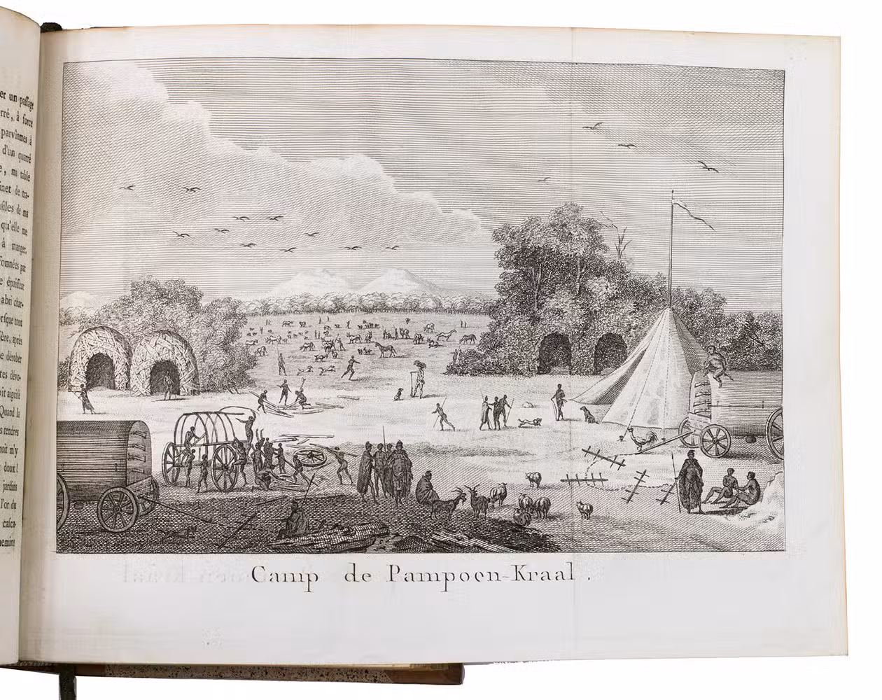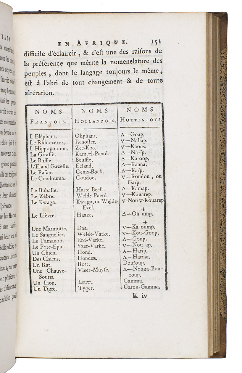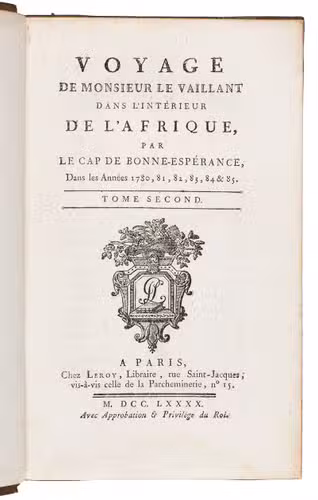 First edition (in octavo: a quarto edition appeared simultaneously) of Le Vaillant's account of his first expedition into the interior of South Africa. Le Vaillant (1753-1824) embarked on a first excursion on 18 December 1781, advancing as far as the Great Fish River. After returning to Cape Town, he undertook a second excursion during which he travelled beyond the Orange River. His engaging narrative of the expedition contains valuable ornithological information and interesting notes on the peoples he encountered, including the Khoikhoi ("Hottentots") and the Xhosas. Plate VII, a portrait of a naked "Hottentote" woman that was later suppressed, is present here and the censors have not tampered with it. The octavo edition is typographically superior to the quarto edition.