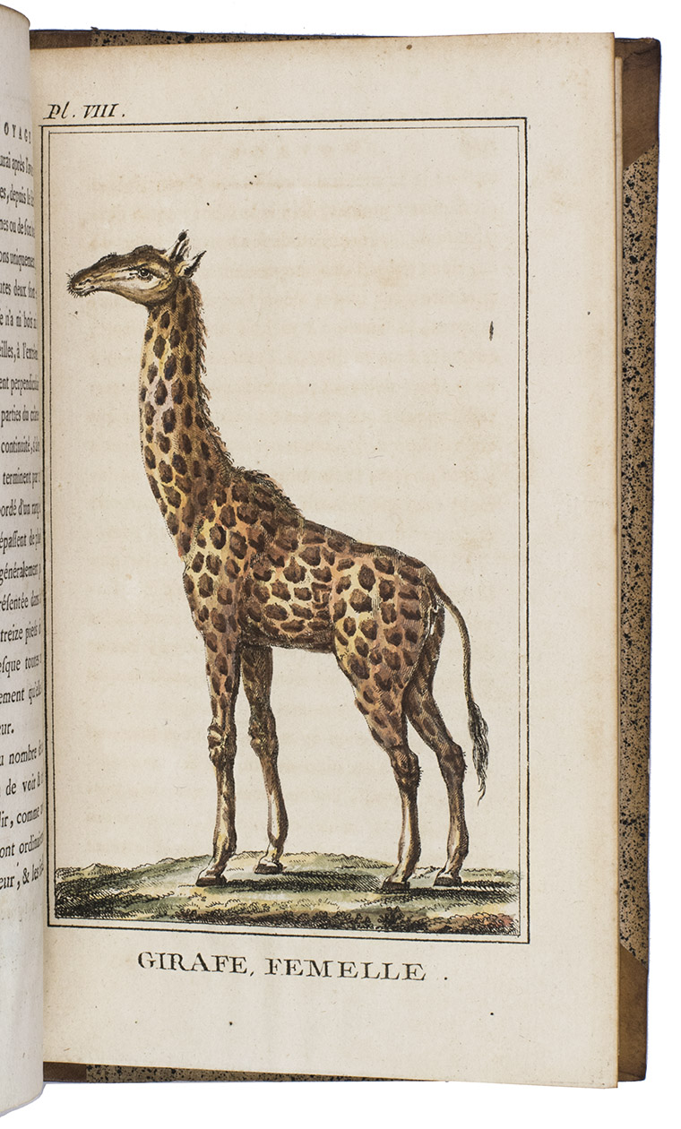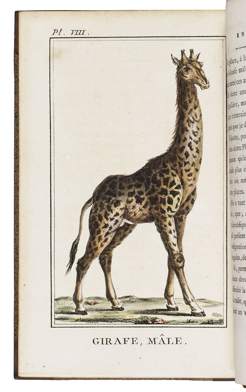 Paris, Leroy (colophon vol. 2: printed by Lottin l'aîné & Lottin), 1790. 2 volumes. 8vo. With the publisher's woodcut device on each title-page, engraved frontispiece, 2 folding engraved views and 9 numbered engraved plates (7 costume figures of indigenous Africans and 2 illustrations of giraffes).With the 9 numbered plates coloured by a contemporary hand. Contemporary half calf, richly gold-tooled flat spines. XXIV, 383; 403 pp.