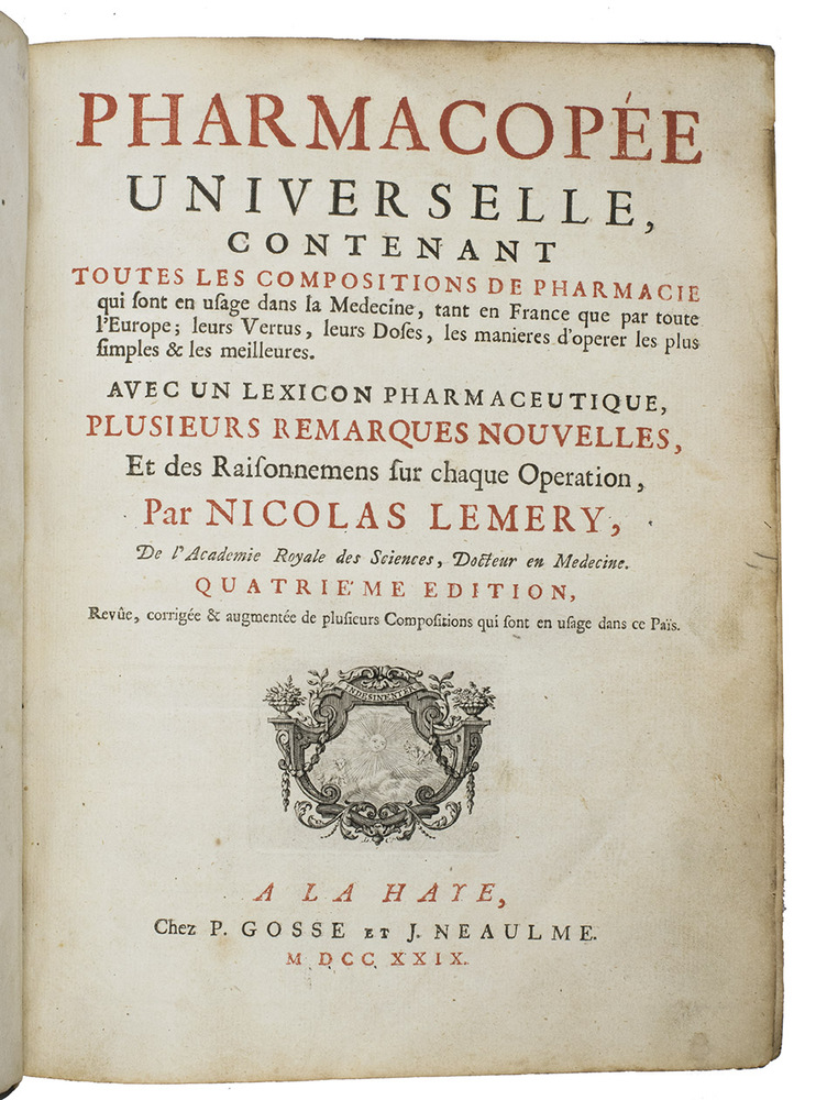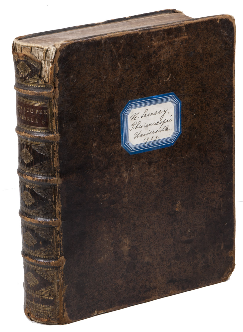 With the bookplate of A. de Kluijs and his owner's stamp on the front paste-down and the first free endpaper and a handwritten poem on the three faces of physicians on the verso of the first free endpaper in a 18th-century hand. Head and bottom of the spine damaged, binding a little worn, corners bumped, otherwise in good condition. Encycl. Britt. 16 (11th. Ed.), p. 410; J.C. Powers, "Ars sine arte": Nicolas Lémery and the end of alchemie in 18th-century France, in: Ambix, 45 (3), pp. 163-189; Cowen & Helfand, Pharmacy, p. 112.