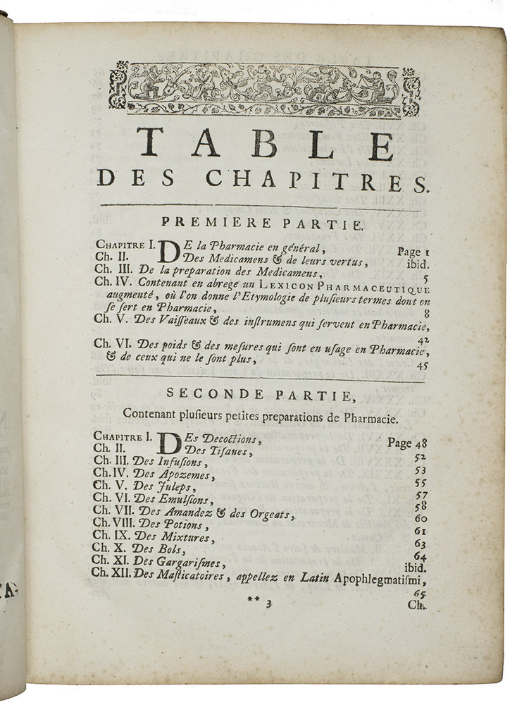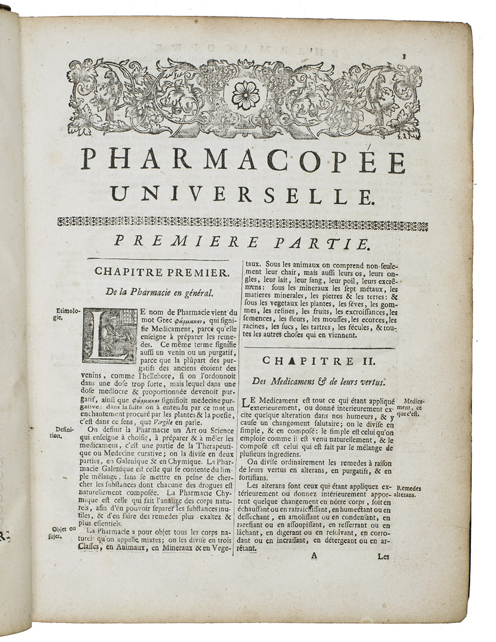 One of the many editions of one of the most authoritative pharmacopoeia of 18th-century Europe. The first edition was published in Paris in 1697, many editions followed (our copy: 4th ed.).