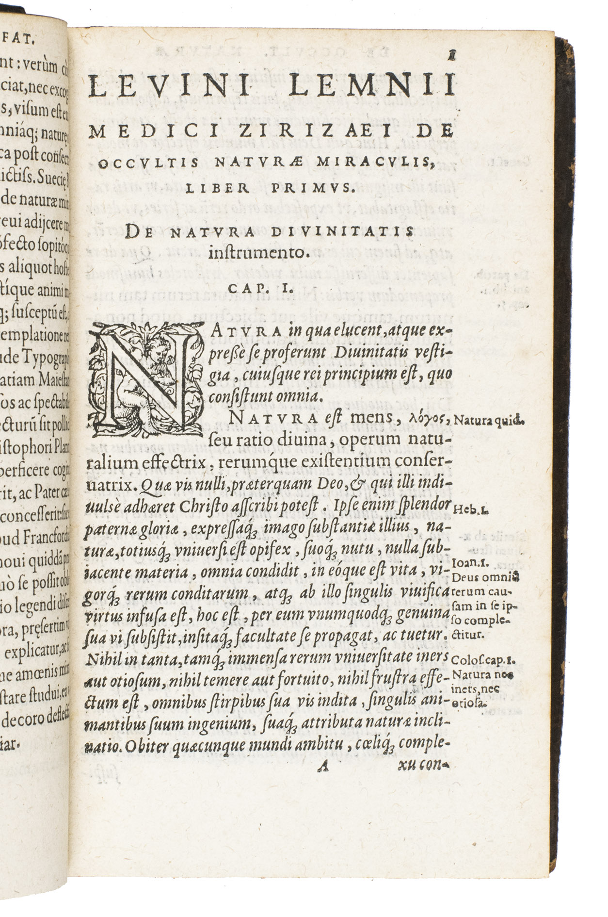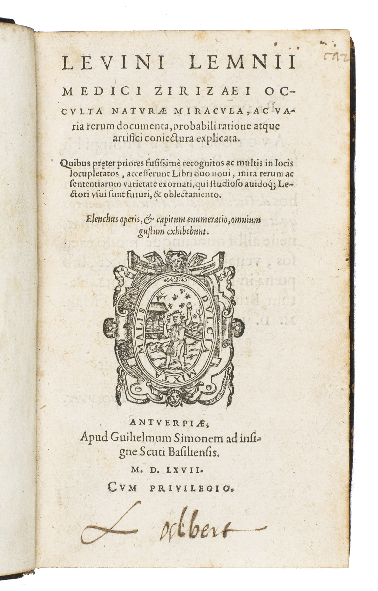 Enlarged, first Plantin edition of a very popular work of the secrets of nature, considering physiological, physical, medical, religious and moral topics. Guided by the Hippocratic Corpus, Aristotle, natural philosophy, Christianity, and the four humors, the author wrote a complicated treatise that covers reproduction, hygiene, demonology, diet, the use of alcohol, the influence of the stars, natural history, pregnancy, and much more. It was republished numerous times, and versions of it were read well into the 20th century. The work "was often cited by subsequent learned authors, and the numerous editions and translations of it show that is was well suited to the taste of the time" (Thorndike).