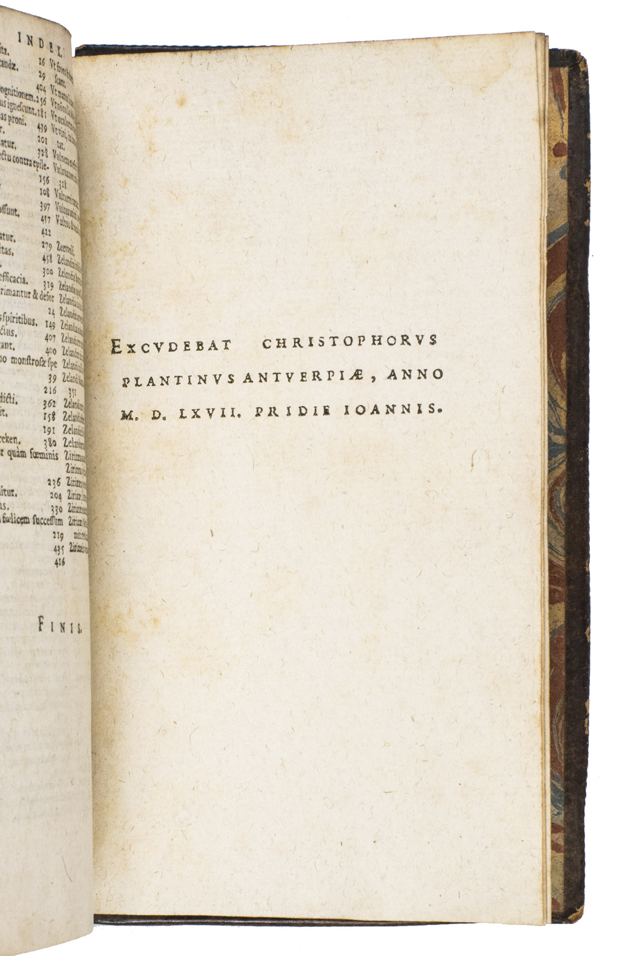With an annotation ("SS:HH:") on the first free flyleaf, and another ("L Albert") on the title page. The edges and corners of the boards are somewhat scuffed, the joints are weakened, but the structural integrity of the binding is still intact. The work is lightly browned throughout. Otherwise in good condition. Belg. Typ. 1850; Coumont L51b.4; Ferguson, supplement III, p. 31; Selleslach, K., and Loon, Z. van., The Plantin Press online, cp010502; STCV 12917184 ; USTC 404536 (29 copies); Voet III, 1513; cf. Durling 2770-2776 (other eds.); Caillet 6480 (other eds.); Thorndike VI, pp. 393-394.
