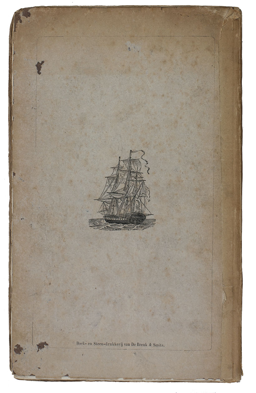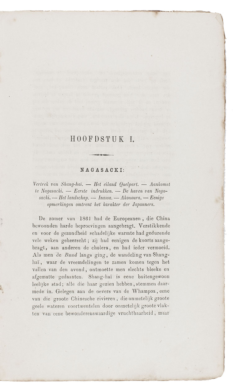 Leiden, De Breuk & Smits, 1865. 8vo. With lithographed title-page including a tinted lithographic view of a Japanese house and 6 people, after a photograph (protected by a tissue guard, tipped in). Original publisher's letterpress-printed boards. VII, [1 blank], 264 pp. plus lithographed title-page.