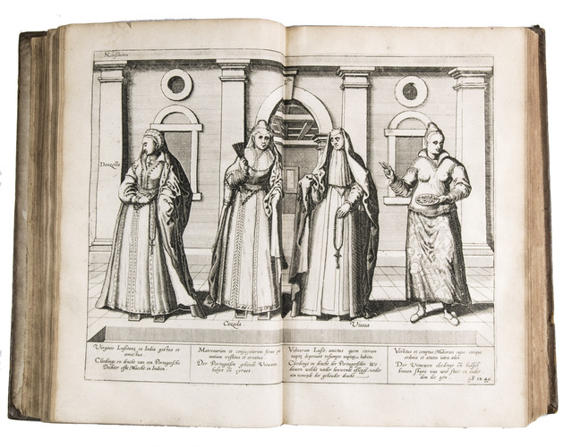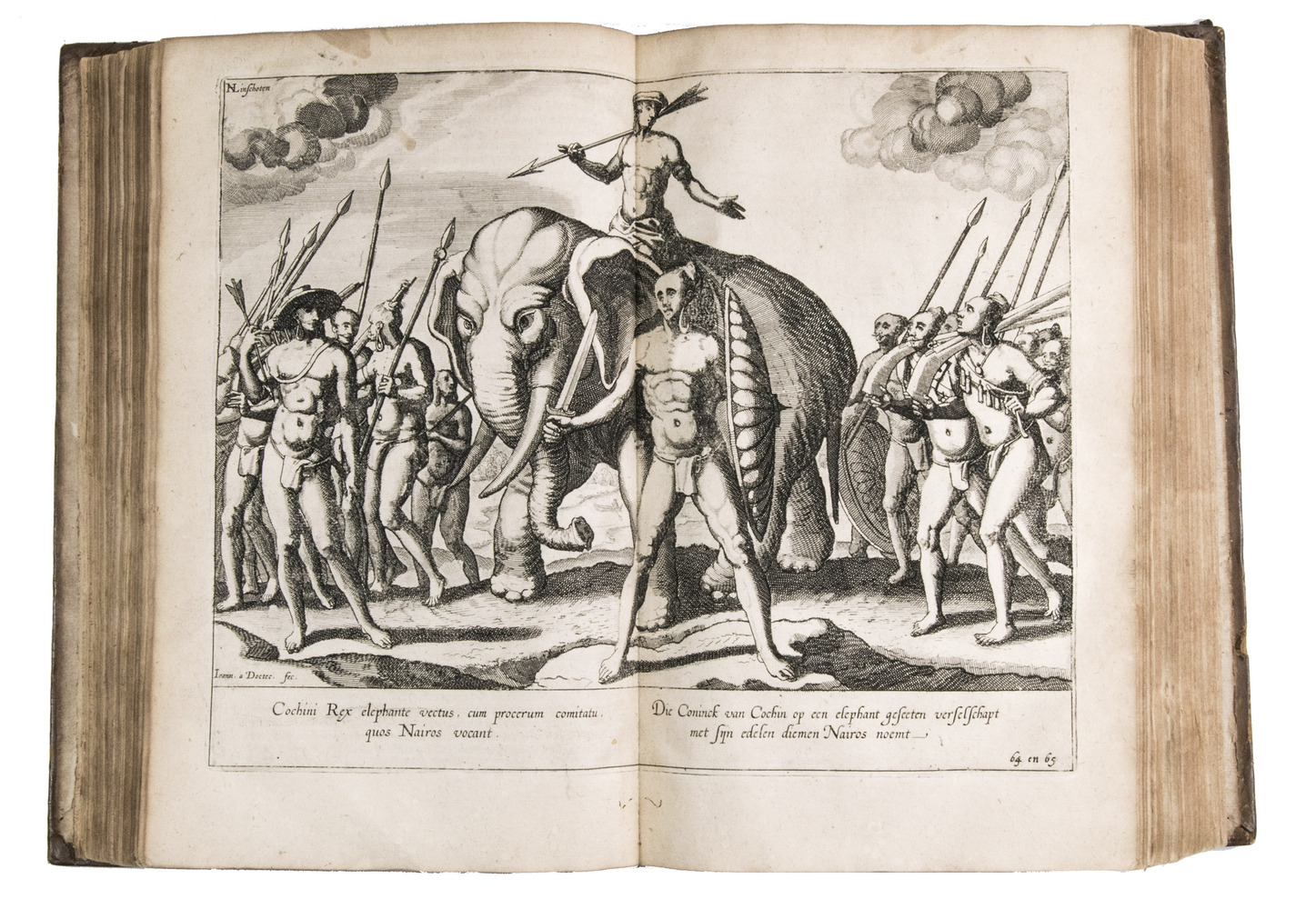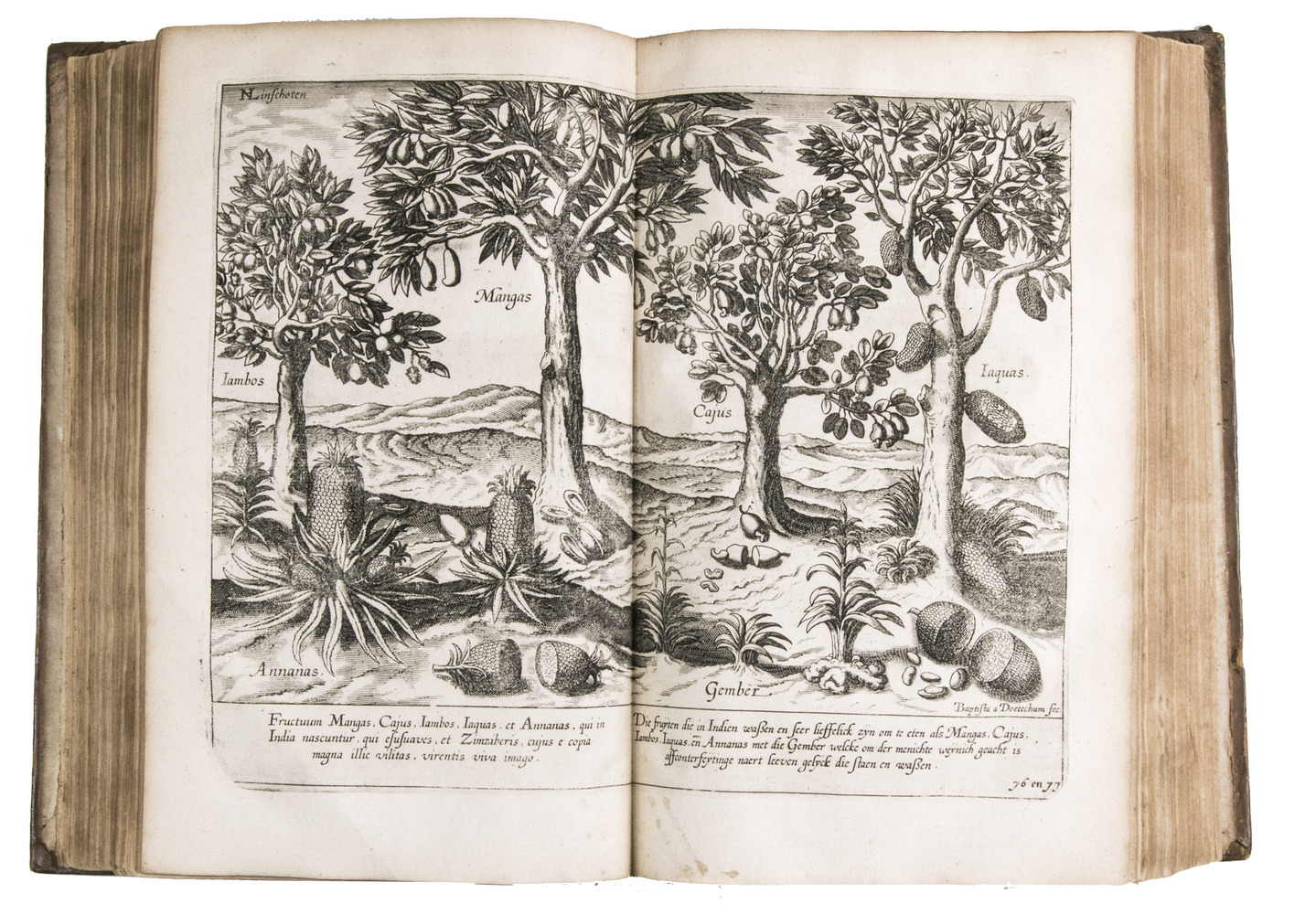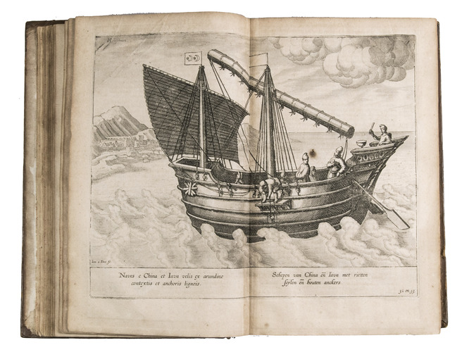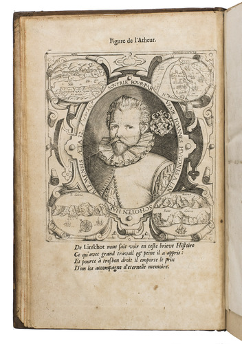 The work was first published in Dutch in 1595/96 followed by Latin and English translations in 1598. The first French edition appeared in 1610, but its plates are copies of a reduced version and derive from De Bry. The second and third French editions return to the original large plates of the Dutch edition and add Bernardus Paludanus annotations. The 1619 and 1638 editions are accordingly the most desirable. Although the present title page describes this edition as augmented, that is with respect to the first: the second and third editions contain the same plates and have the same collation, with little change to the text. The head- and tailpieces and decorated initials (cast from woodcut patterns) are mostly those best known from their use by William Brewsters so-called Pilgrim Press in Leiden in the years 1616-1619, ornaments II and III and the initials in fig. 33 of Harris & Jones, The Pilgrim Press, 2nd ed., 1987. The pagination in part 3 erroneously omits the numbers 61-66, but no leaves are lacking.
