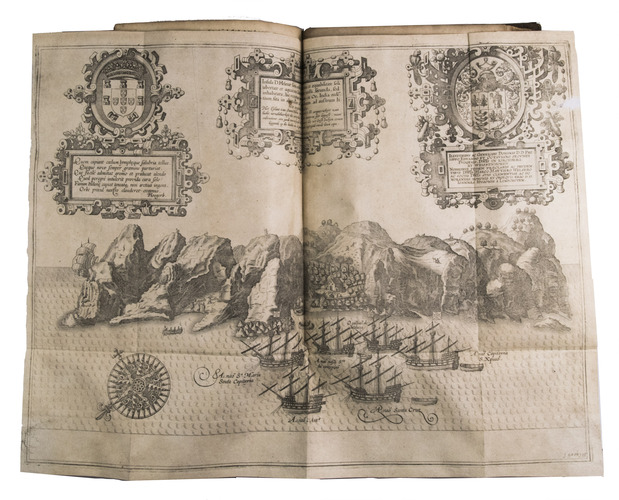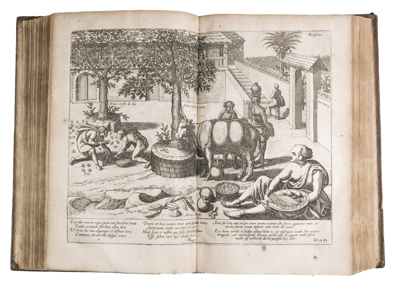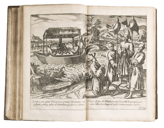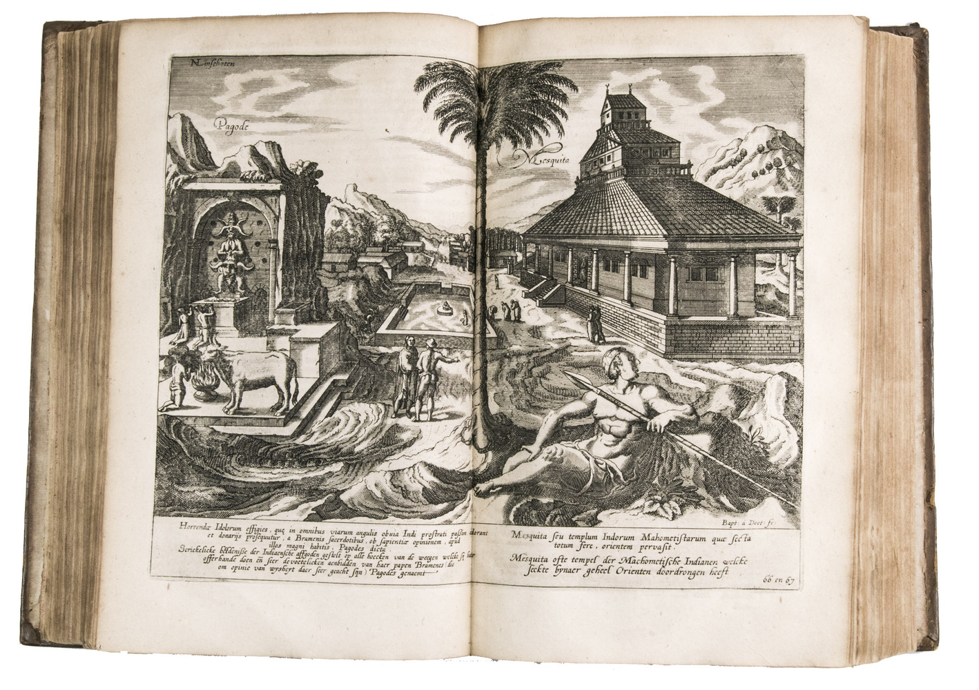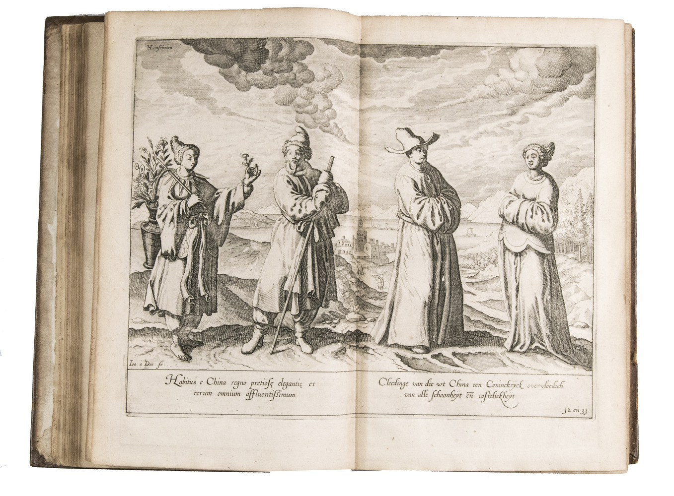 The work was first published in Dutch in 1595/96 followed by Latin and English translations in 1598. The first French edition appeared in 1610, but its plates are copies of a reduced version and derive from De Bry. The second and third French editions return to the original large plates of the Dutch edition and add Bernardus Paludanus annotations. The 1619 and 1638 editions are accordingly the most desirable. Although the present title page describes this edition as augmented, that is with respect to the first: the second and third editions contain the same plates and have the same collation, with little change to the text. The head- and tailpieces and decorated initials (cast from woodcut patterns) are mostly those best known from their use by William Brewsters so-called Pilgrim Press in Leiden in the years 1616-1619, ornaments II and III and the initials in fig. 33 of Harris & Jones, The Pilgrim Press, 2nd ed., 1987. The pagination in part 3 erroneously omits the numbers 61-66, but no leaves are lacking.