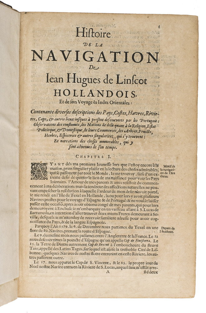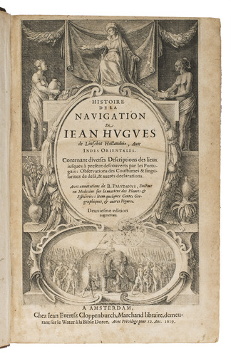 The second French edition of Linschoten's classic illustrated guide for travellers to the East and West Indies, termed by Lach ''the most important of the first-hand accounts published independently of the great travel collections'' (I.198). No other book contained so much useful intelligence on the East and West Indies. Unhindered by the censorship that constrained writers from the Iberian peninsula (details of seas and coasts in Asia and the Americas were military secrets), he included such information as sailing directions, physical descriptions of countries, and statistics on commerce and trade. The work was held in such high regard that for nearly a century, every Dutch ship sailing to Africa and Asia carried a copy of a Dutch edition of Linschoten. The 42 plates, including 11 large folding plates, are especially noteworthy, including 6 maps and several birds-eye views, many with coats of arms of the regions shown and of the colonial powers that controlled parts of them, as well as richly decorated cartouches and other functional and decorative elements.