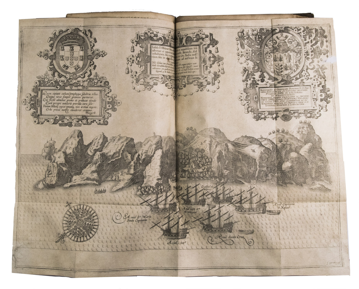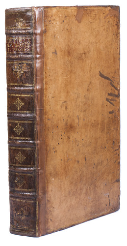 Amsterdam, Evert Cloppenburg, 1619. 3 works in 1 volume, the first in 2 parts. Folio (31 x 21 cm) With an engraved title page for each work, 42 engraved plates (31 double-page and 11 folding), including 6 maps, and a full-page portrait of the author within collation. Including: LINSCHOTEN, Jan Huyghen van. Le grand routier de mer, ...