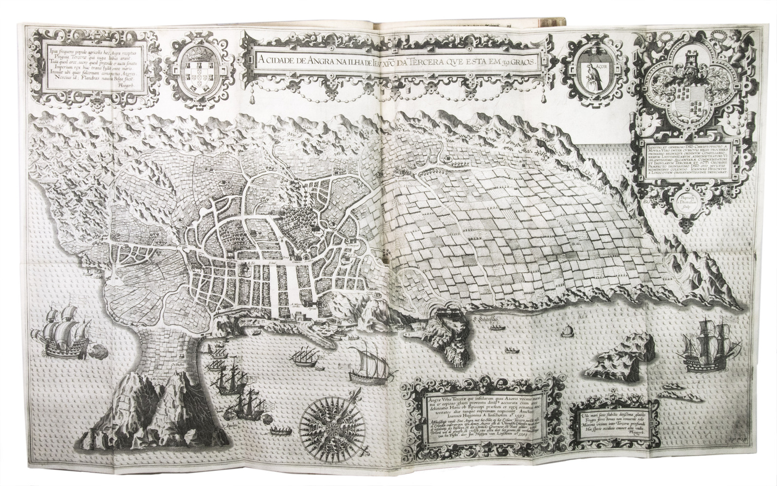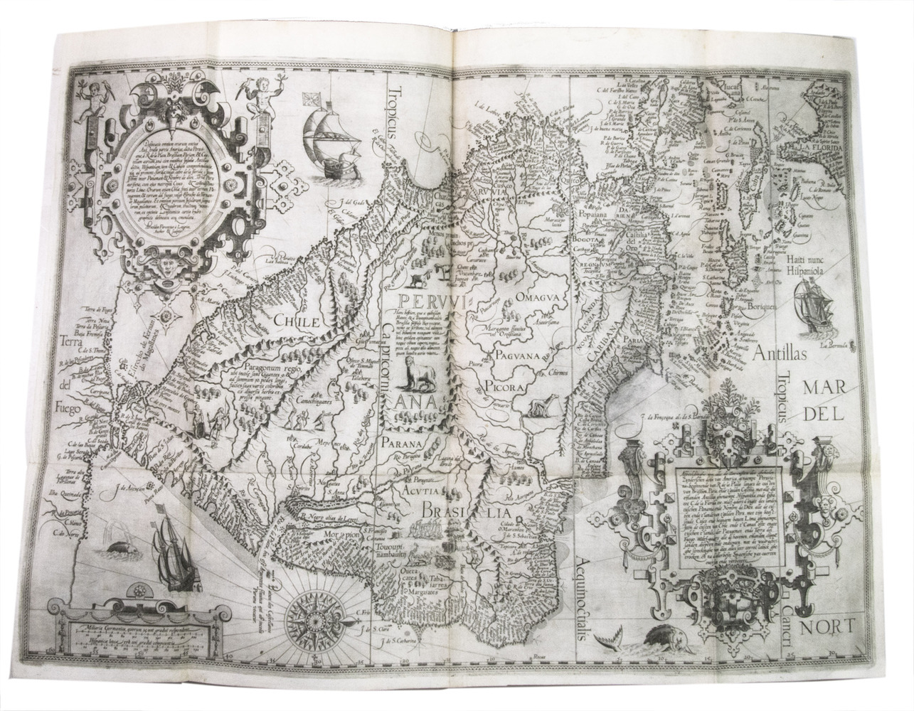 Amsterdam, Cornelis Claesz., 1596. 4 parts in 1 volume. Small folio (ca. 31 x 21 cm). With 6 folding maps, 36 folding or double-page plates, a full-page author's portrait, and a large illustration on each of the 4 divisional title pages, all engraved. Contemporary blind-tooled vellum over modern boards (?), with the manuscript author, title, and year of publication on the spine, red and blue sprinkled edges. [8], 160; 134, [4], 135-147; [82], [2 blank], [8] pp.