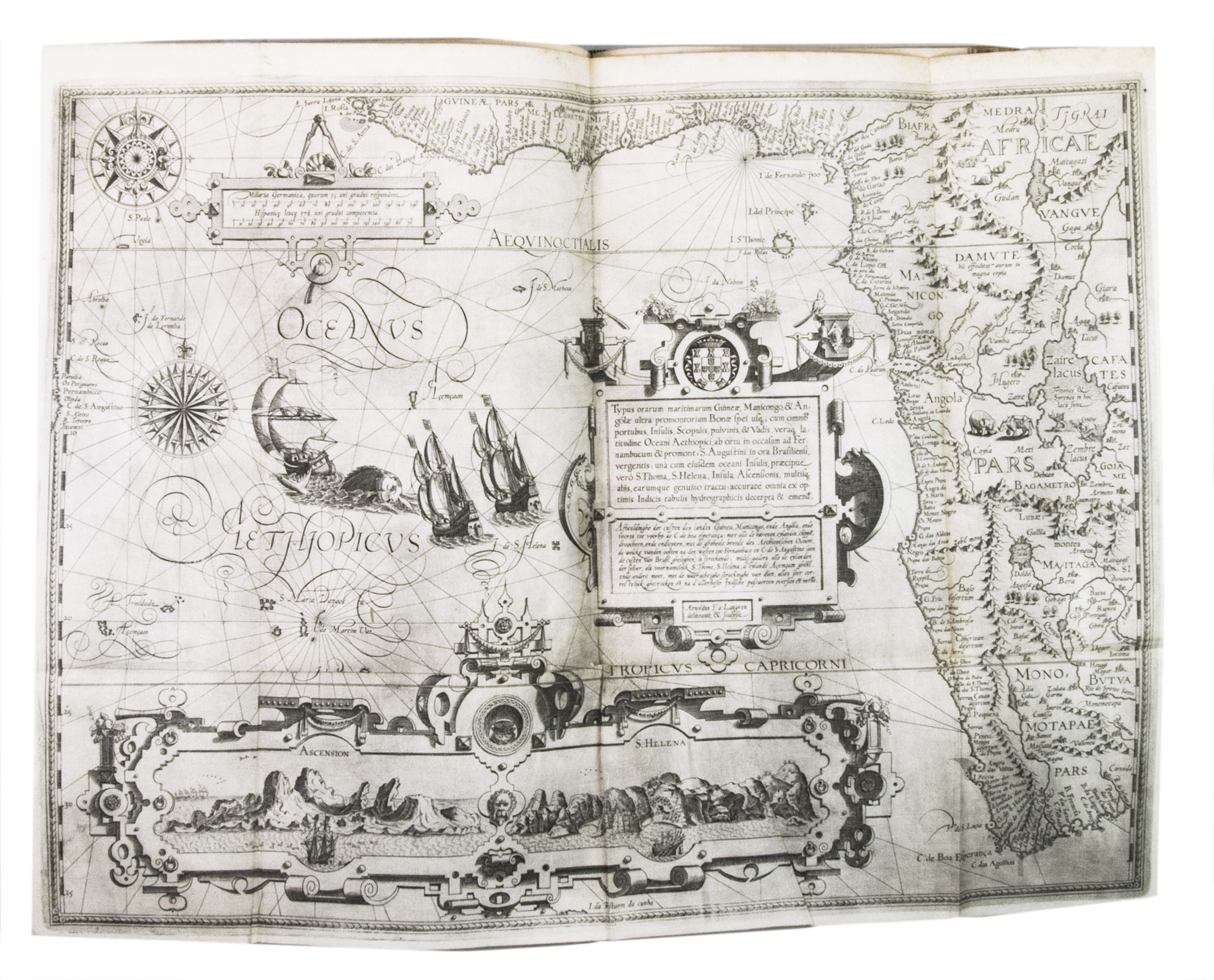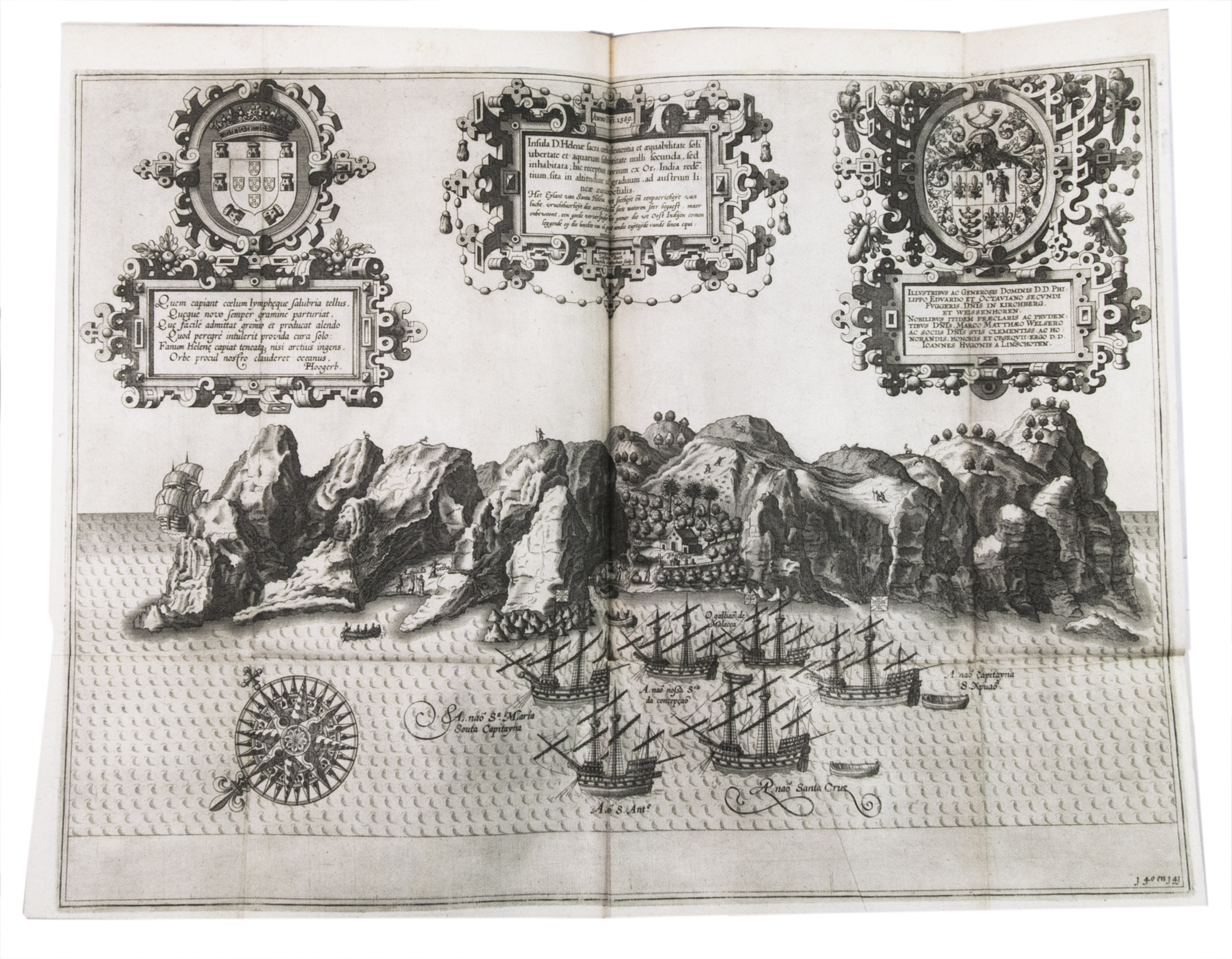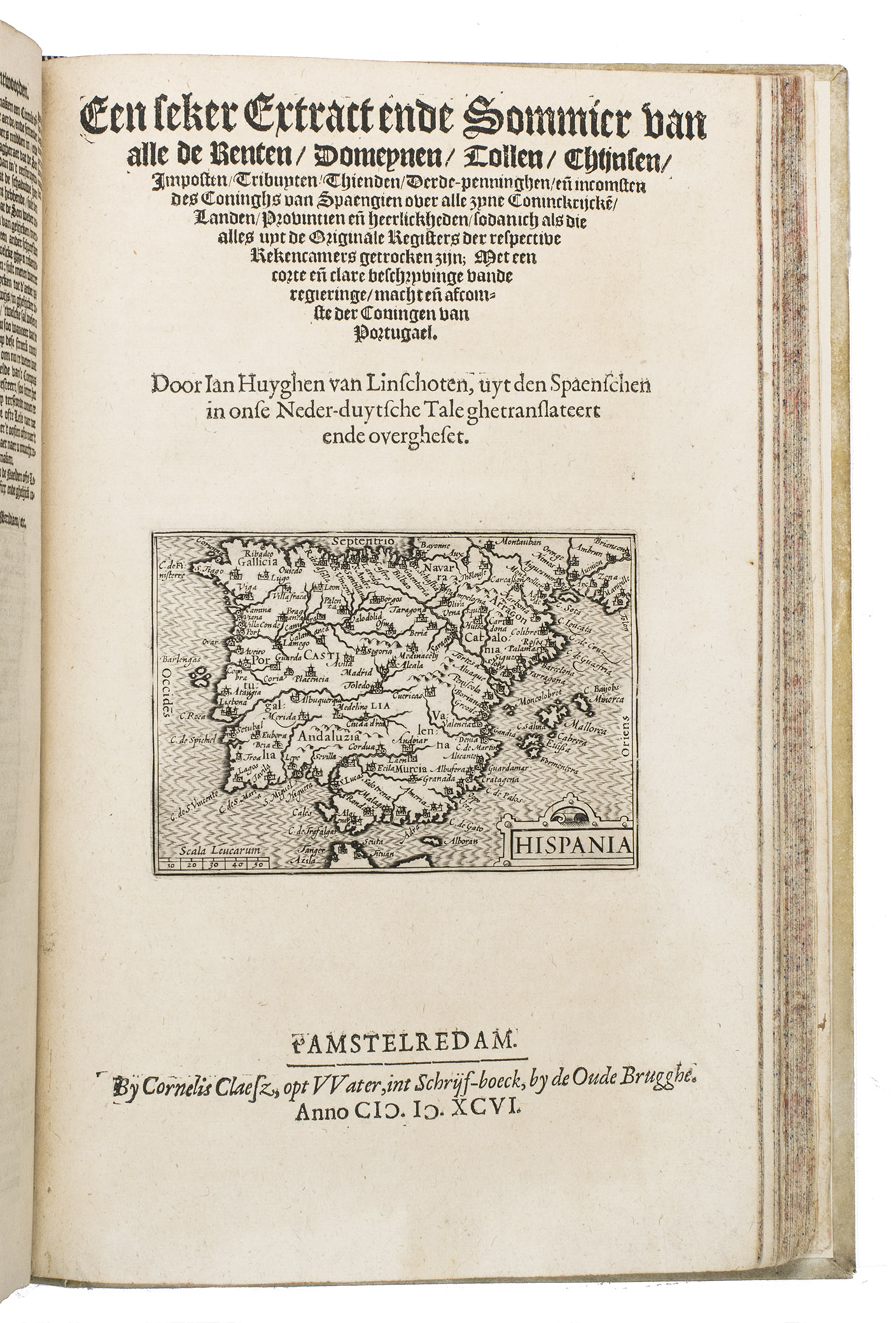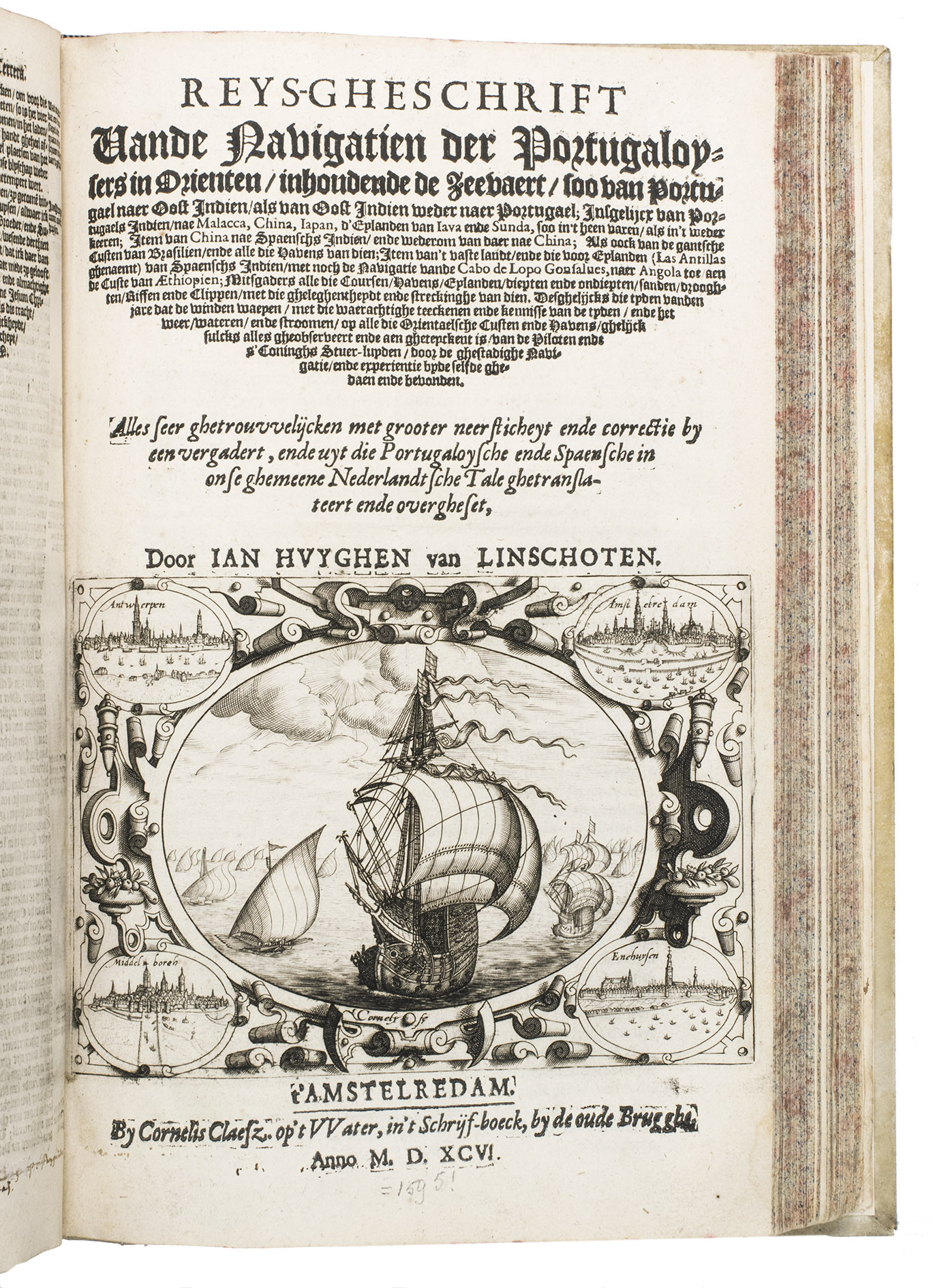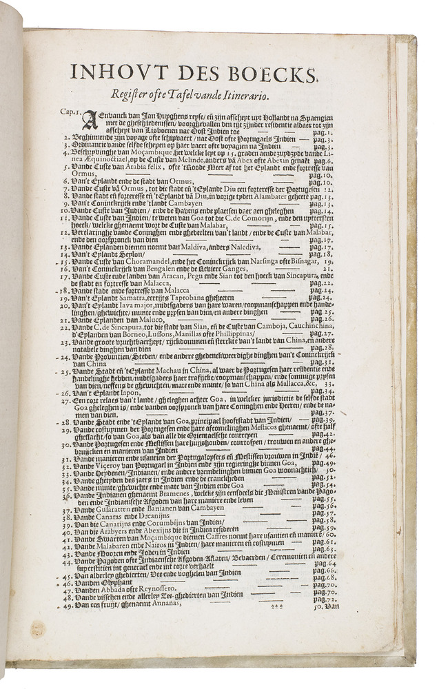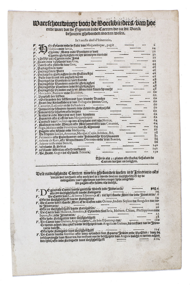 First edition in the original Dutch of one of the most important travel books ever produced. Also known as "The key to the East", it was the first printed work to include precise sailing instructions for the East Indies. This opened the way for both the Dutch East India Company (VOC) and the British East India Company (EIC), ending the Portuguese monopoly on the East Indian trade. "... this important work contains all the knowledge and learning related to the East and West Indies and navigation to those parts that was available at the end of the sixteenth century. It was held in such high esteem that for nearly a century a copy was given to each ship sailing to India as a guide to the sailing directions. The fact that most copies were in continual use is no doubt the reason that fine copies, especially with all correct plates and maps, are so very rare" (Hill). The present copy is complete with all maps and plates, and even includes the often missing instructions for the bookbinder.