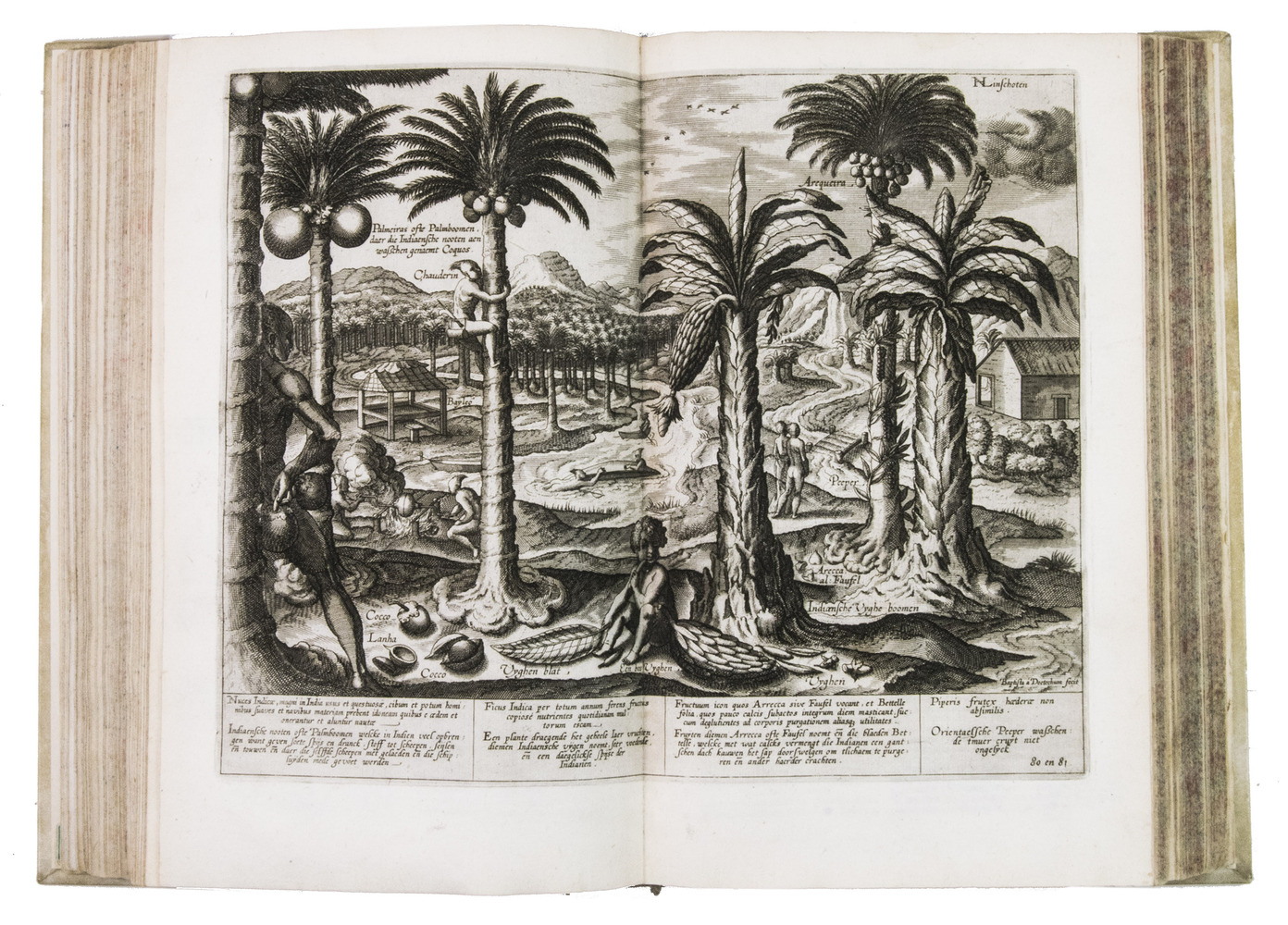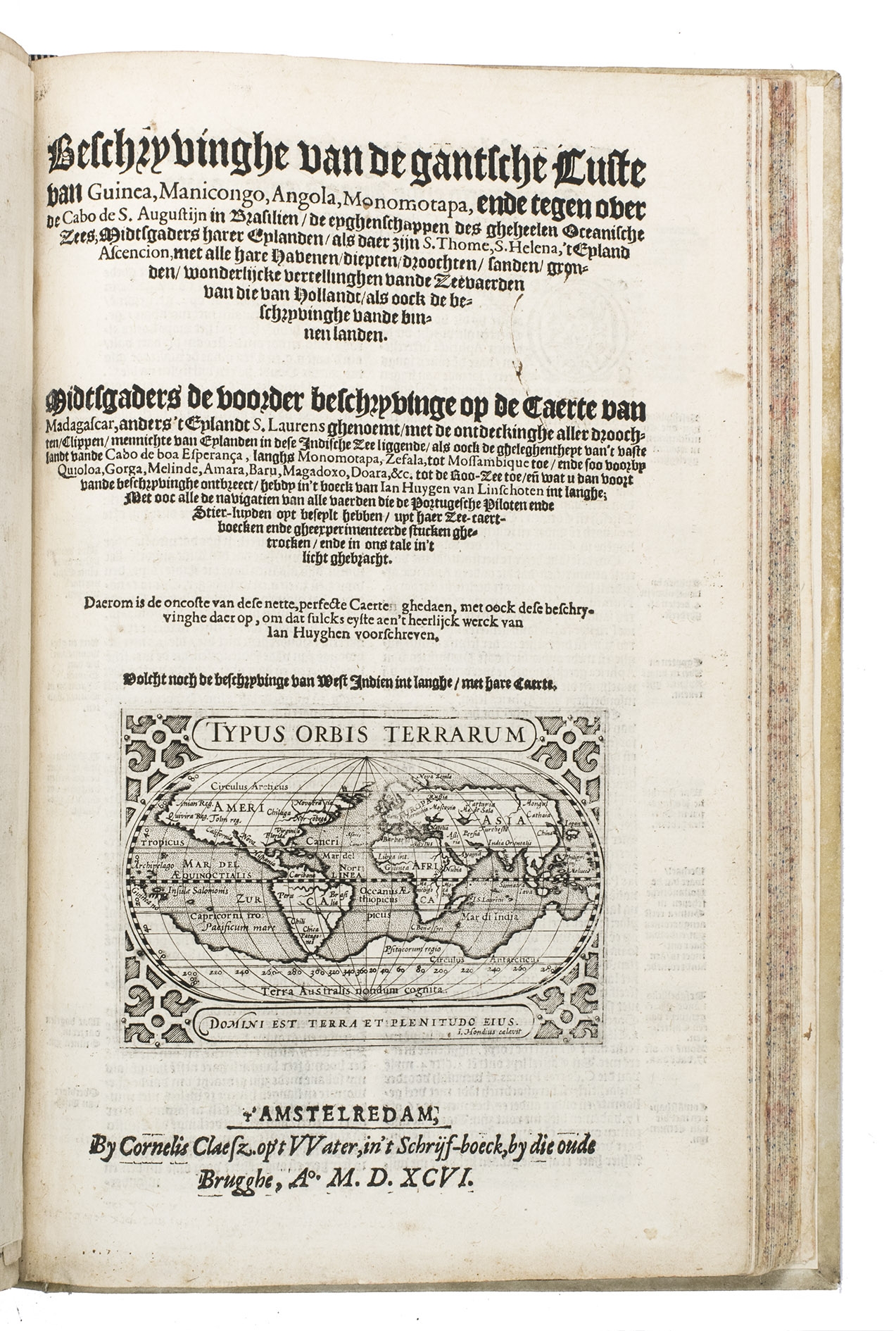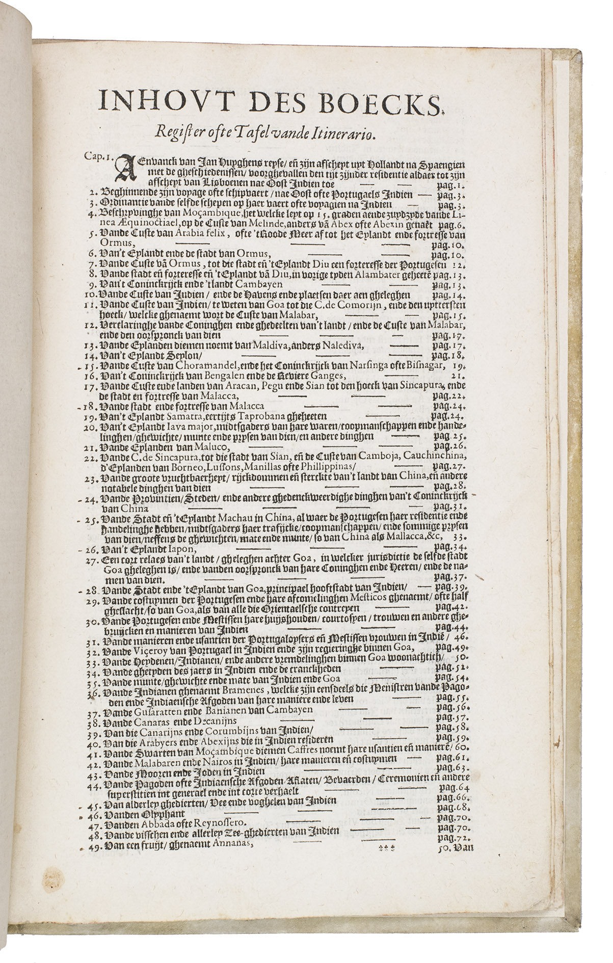 With the bookseller's label of R. W. P. de Vries in Amsterdam mounted at the foot of the front pastedown, and the rare "Waerschouwinge voor de boekbinders" loosely inserted in the back. The work has been recased with new endpapers and supports, small restorations on the head and foot of the spine. The work is slightly browned throughout, part 3 (ads 2a and 2b) has been bound before part 2 (ad 3), small restorations at the bottom outer corner of some of the leaves, small tears in the folds of some of the maps, mostly in the margins, contemporary annotations in the margins of some of the leaves and on the verso of some of the plates, the chapter titles on page 12-20 and 31-34 in ad 1 have been corrected with a small strip of paper glued on top, the leaves of ad 3 have been numbered by hand. Otherwise in good condition. Alden & Landis 596/63; Borba de Moraes, pp. 486-487; Church 252; Howgego, L131-132; Parker, Books to build an empire, pp. 159-161; Sabin 41356; STCN 853189978 (9 copies); cf. Hill 1025 (English ed.); Nave, Philologia Arabica 22 (1623 ed.); for the map of Arabia, Persia and India: Tibbets 46 & pp. 23.