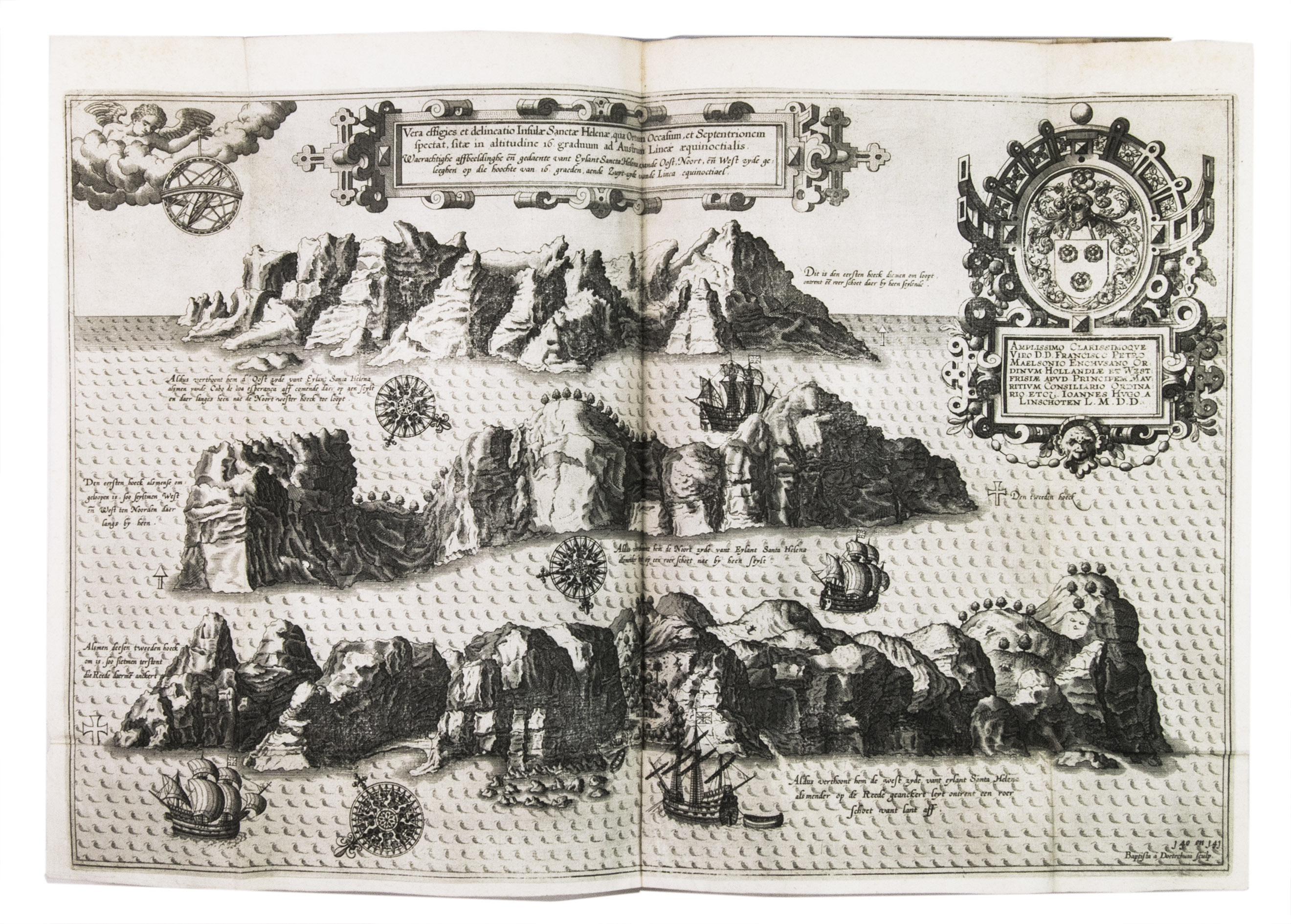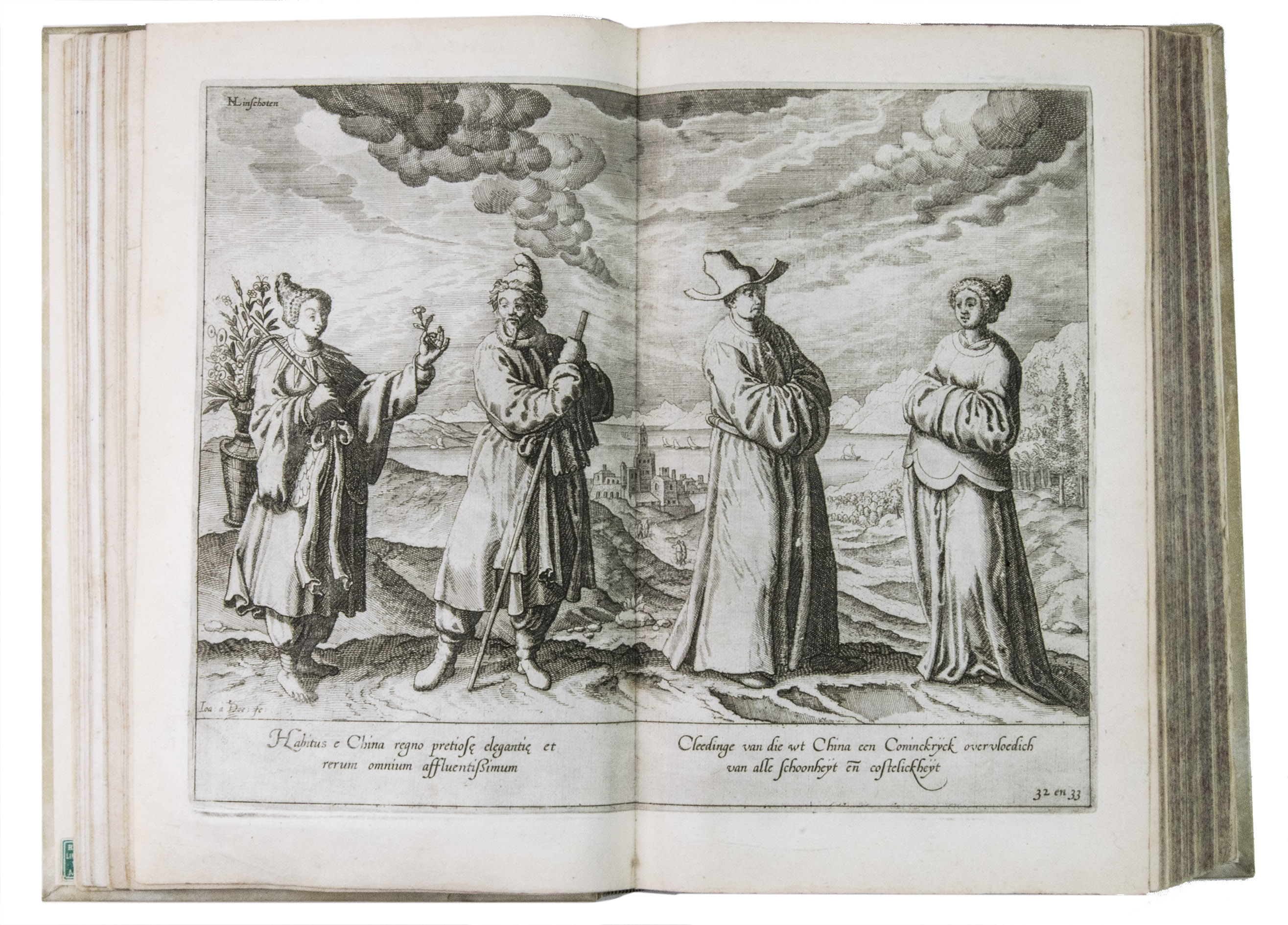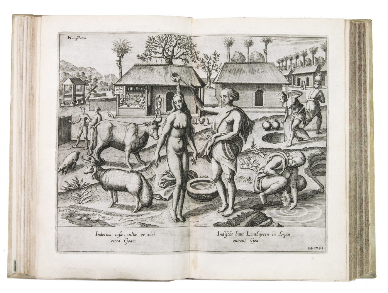 With the bookseller's label of R. W. P. de Vries in Amsterdam mounted at the foot of the front pastedown, and the rare "Waerschouwinge voor de boekbinders" loosely inserted in the back. The work has been recased with new endpapers and supports, small restorations on the head and foot of the spine. The work is slightly browned throughout, part 3 (ads 2a and 2b) has been bound before part 2 (ad 3), small restorations at the bottom outer corner of some of the leaves, small tears in the folds of some of the maps, mostly in the margins, contemporary annotations in the margins of some of the leaves and on the verso of some of the plates, the chapter titles on page 12-20 and 31-34 in ad 1 have been corrected with a small strip of paper glued on top, the leaves of ad 3 have been numbered by hand. Otherwise in good condition. Alden & Landis 596/63; Borba de Moraes, pp. 486-487; Church 252; Howgego, L131-132; Parker, Books to build an empire, pp. 159-161; Sabin 41356; STCN 853189978 (9 copies); cf. Hill 1025 (English ed.); Nave, Philologia Arabica 22 (1623 ed.); for the map of Arabia, Persia and India: Tibbets 46 & pp. 23.