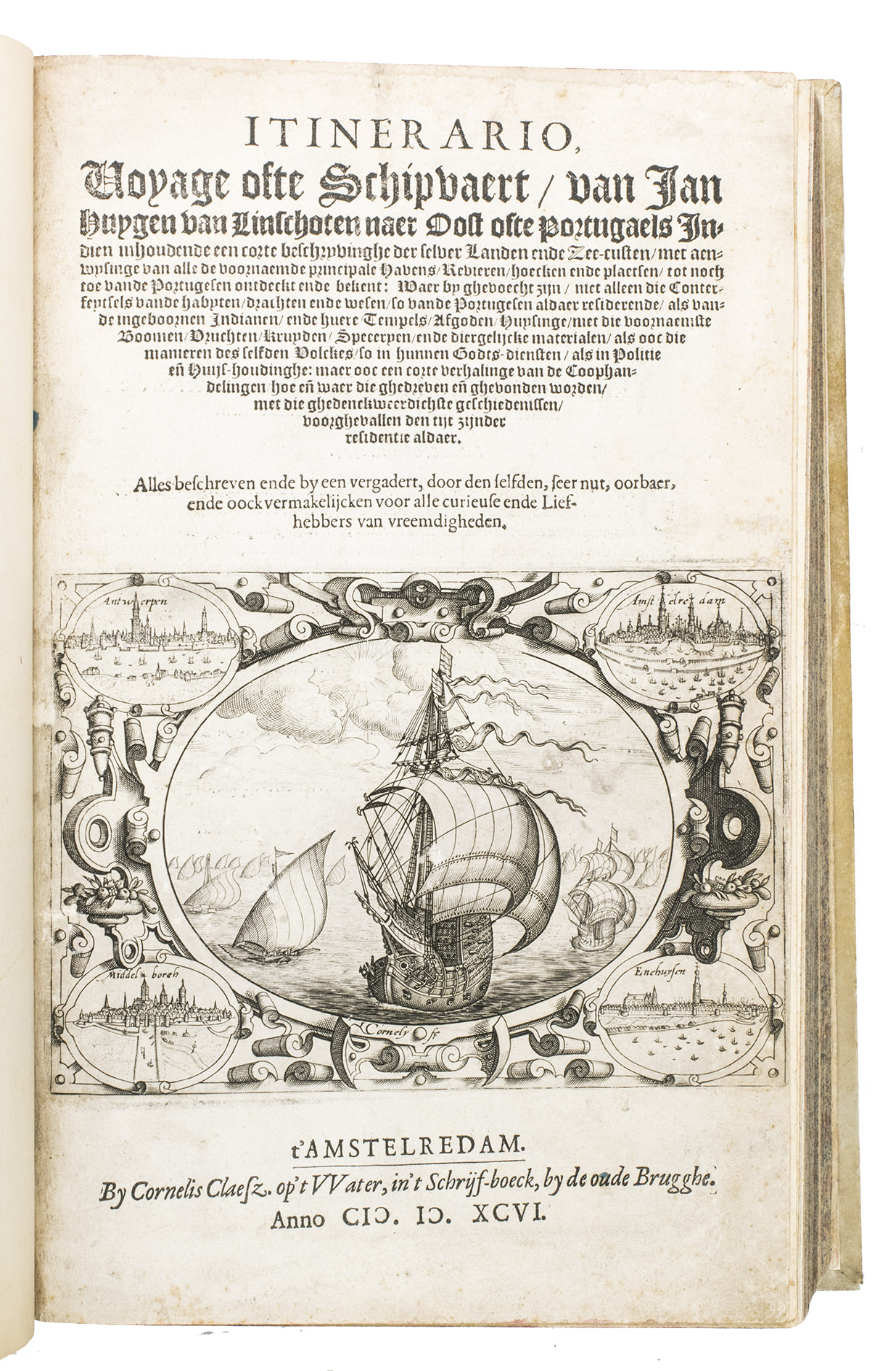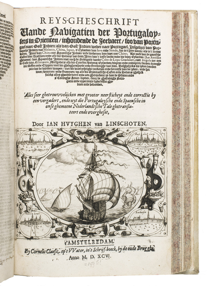 Van Linschoten sold the story of his travels to the Amsterdam bookseller and publisher Cornelis Claesz, who had specialised in shipping, geography and travels, and who published it in 1596 (this copy), containing Van Linschoten's personal experiences and travels, and, among very many other things, the commercially sensitive information to which he had had access to in Goa. The work provided the Dutch with valuable information regarding Portuguese sea routes to the East, their resupply points around Africa and their trading stations in the East, as well as important navigational data about currents, deeps and the location of islands and sandbanks, being absolutely vital for safe navigation. Thus, the greatly coveted shipping route to the East Indies and the route between the Asiatic sea ports came within reach, offering the missing link to the search into itineraries and trade routes to the Indonesian archipelago. Linschoten also gives detailed descriptions of the Portuguese territories and how they were administrated, including descriptions of spice trees and spice growing areas.The work was immediately a great success and went into many editions in Dutch over the course of the next fifty years. In 1598 a German edition appeared, and in the same year an English translation was published in London, entitled: John Huighen van Linschoten his discours of voyages into ye Easte & West Indies. French editions followed in 1610, 1619 and 1638. A Latin edition was published in 1599 without the maps.