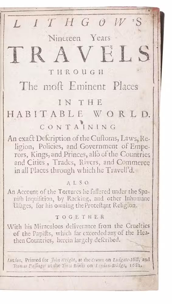 Third complete edition (the first under the present title) of a classic account of three voyages by the Scotsman William Lithgow (1582-1645?), mostly on foot, from Rome to Greece, Crete, Turkey, Cyprus, the Holy Land, Egypt and Malta, continental Europe and North Africa, and through the British Isles and the Iberian peninsula. He gives the earliest clear account of coffee drinking in Europe, describes Turkish baths and long Turkish tobacco pipes, pigeon post between Aleppo and Bagdad and the hatching of chicken eggs by artificial incubation.