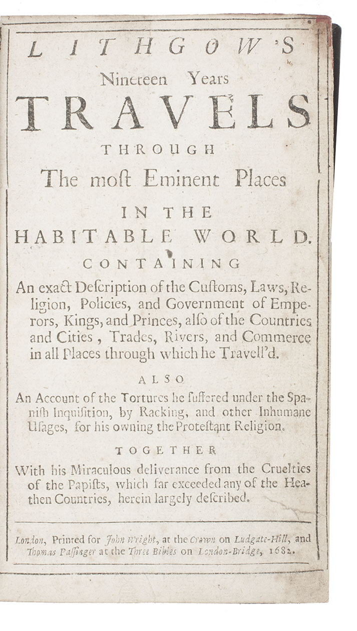 Some plates bound at wrong position. With an occasional small tear or hole; trimmed, occasionally shaving a running head; and with the frontispiece backed with later paper. A pioneering travel account, including detailed observations of life in the Ottoman Empire, Egypt and other parts of the Middle East. ESTC R28791; Howgego, to 1800, L134; Wing L2541; cf. Blackmer 1021 (1640 ed.); for Lithgow: DNB XXXIII, p. 361.