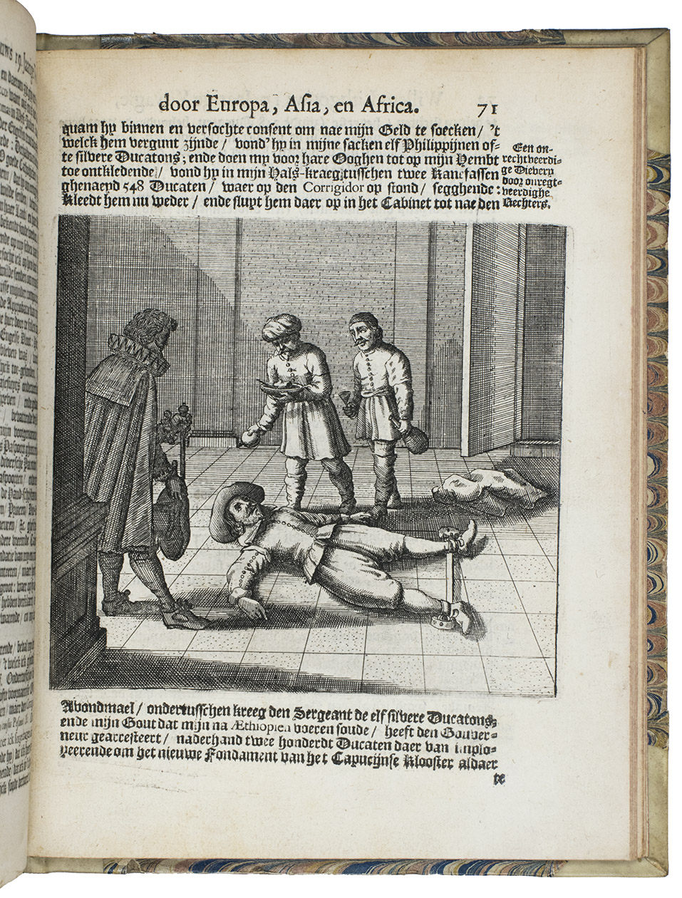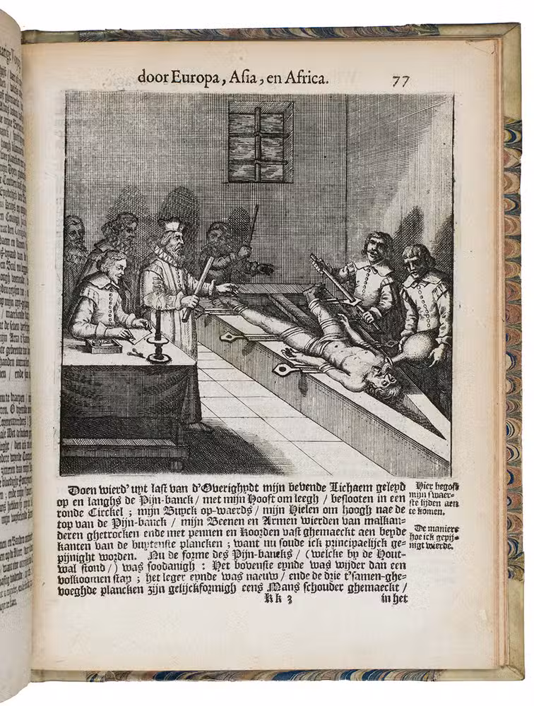 Second Dutch edition of a classic account of three voyages by the Scotsman William Lithgow (1582-1645?), mostly on foot, from Rome to Greece, Crete, Turkey, Cyprus, the Holy Land, Egypt, Malta, continental Europe and North Africa, including the British Isles and the Iberian peninsula. He gives an account of coffee, describes Turkish baths and long Turkish tobacco pipes, pigeon post between Aleppo and Bagdad and the hatching of chicken eggs by artificial incubation, all largely unknown in Europe when he wrote.