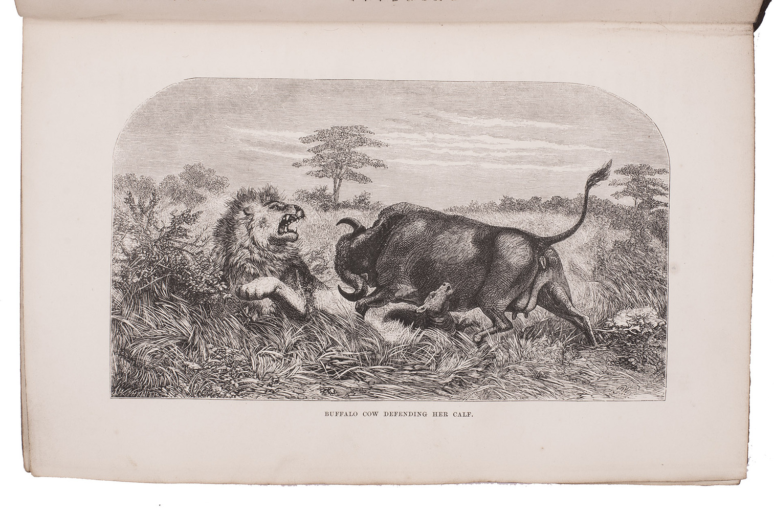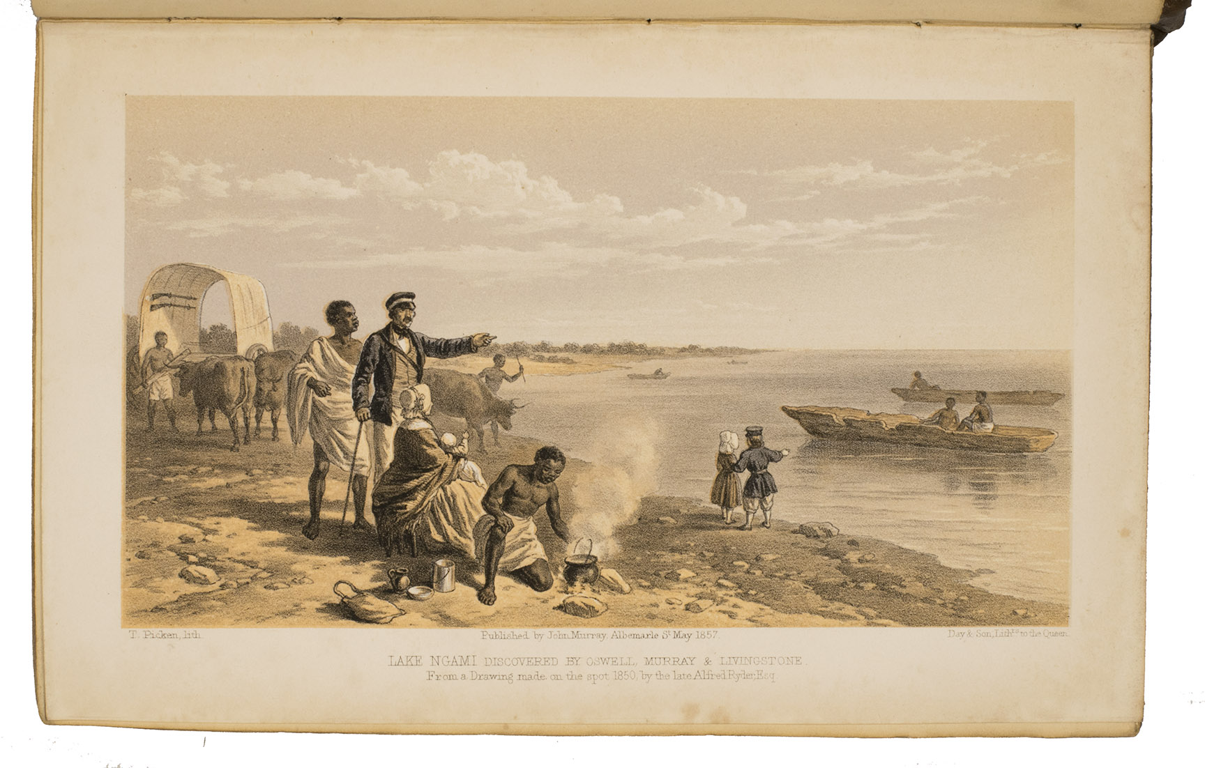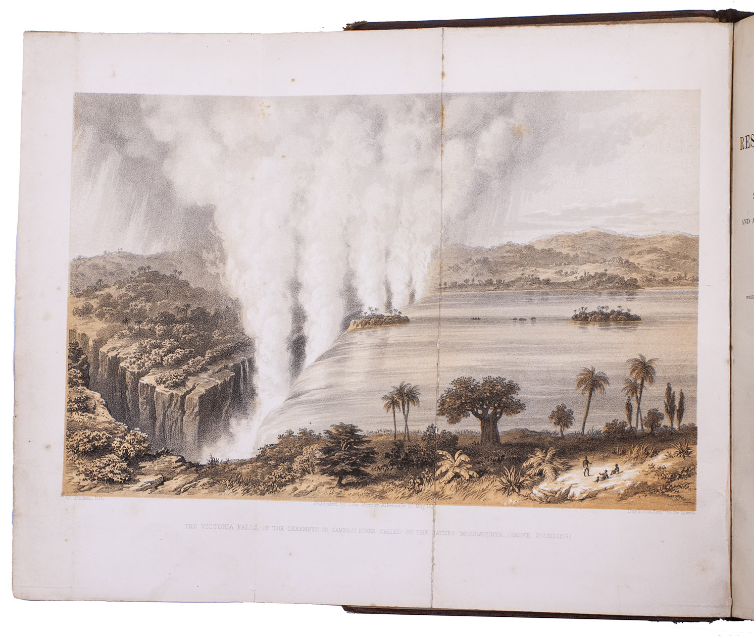The map included at the end shows this impressive journey. From Quelimane Livingstone sailed back to England. The folding frontispiece depicts Victoria Falls, based on the sketch that Livingstone brought back, the first published view, apparently produced for Livingstones book though Murray appears to have issued it separately in May 1857, a few months before the book appeared; the other plates show many wild animals and natives in their villages.