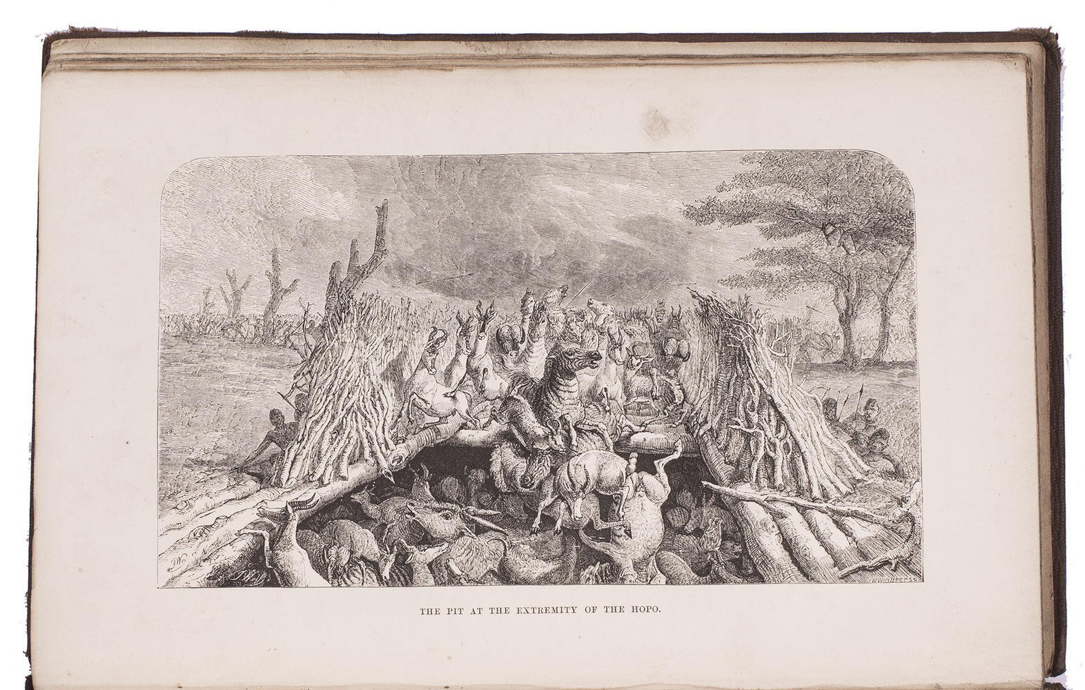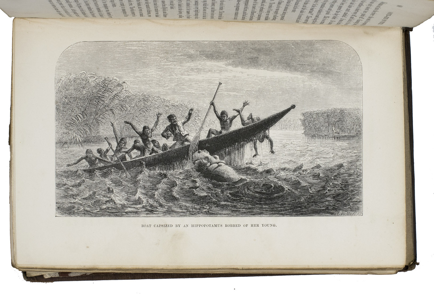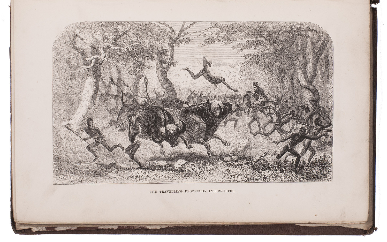 The map included at the end shows this impressive journey. From Quelimane Livingstone sailed back to England. The folding frontispiece depicts Victoria Falls, based on the sketch that Livingstone brought back, the first published view, apparently produced for Livingstones book though Murray appears to have issued it separately in May 1857, a few months before the book appeared; the other plates show many wild animals and natives in their villages.
