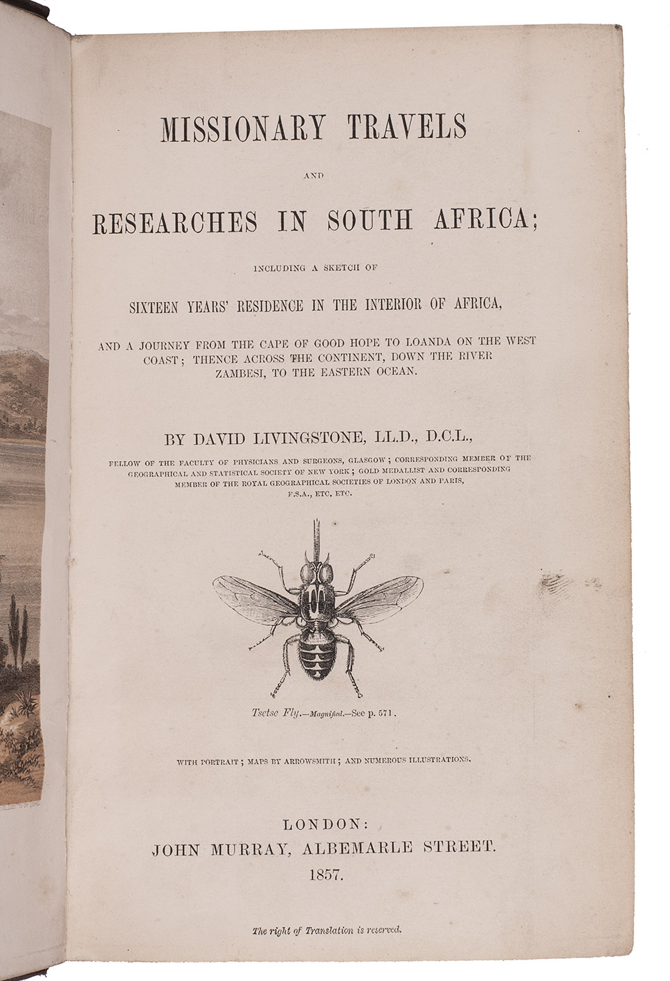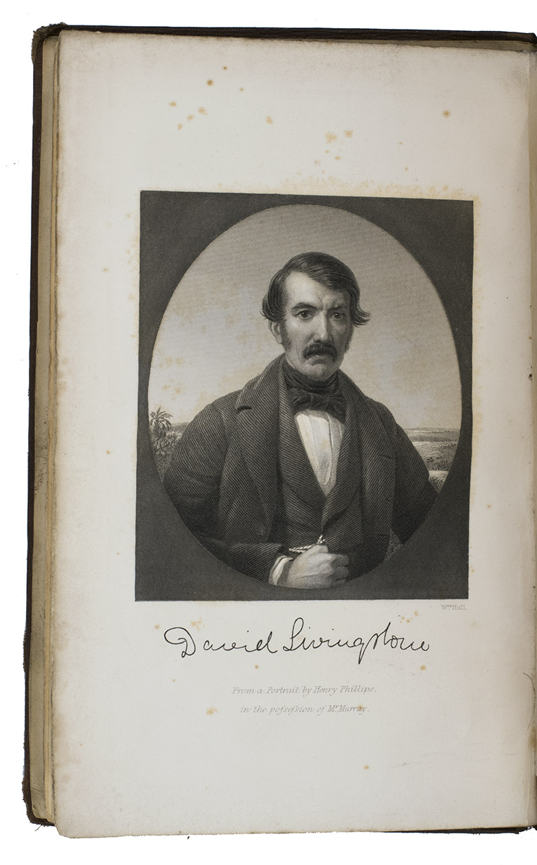 First edition of the famous account of the first mission and expedition through southern Africa undertaken by the Scottish physician, missionary and explorer David Livingstone (1813-1873). The account narrates chronologically his travels and experiences, including numerous descriptions of African tribes and chiefs, deserts, rivers, lakes, forests, cities, diseases, animals, trees, etc. Livingstone arrived in July 1841 at Kuruman in southern Africa. " In 1841-43 he travelled a considerable distance to the north of Kuruman and selected for his future operations the valley of Mabotsa (Mabotse)" (Howgego). He changed station several times in the following years and was the first European to locate Lake Ngami (Botswana) in 1849. In 1852 Livingstone left Cape Town travelling north, trying to find a suitable location on the Zambezi for a missionary station, and travelled further to Luanda (Angola), where he arrived in 1854. He decided to travel back to Lintanti (Botswana) and further eastward, becoming in 1855 the first European to see the waterfall he named Victoria Falls. From there he continued his journey to the east by canoe and arrived in Quelimane (Mozambique) in May 1856.