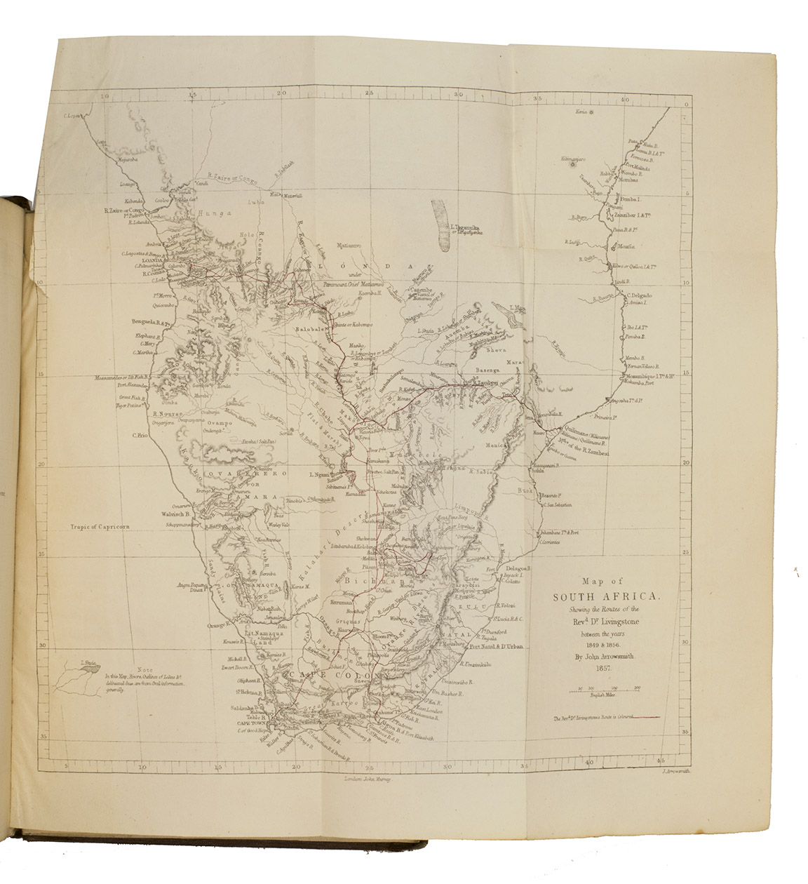 London, John Murray (back of title-page: W. Clowes and sons), 1857. 8vo. With a folding tinted lithographed plate as frontispiece, a wood-engraved illustration on the title-page, a lithographed portrait of Livingstone, 20 lithographed plates, 2 tinted lithographed plates, a folding lithographed plate with a geological cross section, a lithographed folding map of southern Africa, a lithographed folding map pasted on cloth, with Livingstone's route from west to east Africa highlighted in red, and many wood-engraved illustrations in text. Original publisher's blind-blocked brown cloth. IX, [1], 687, [1], 8 pp.