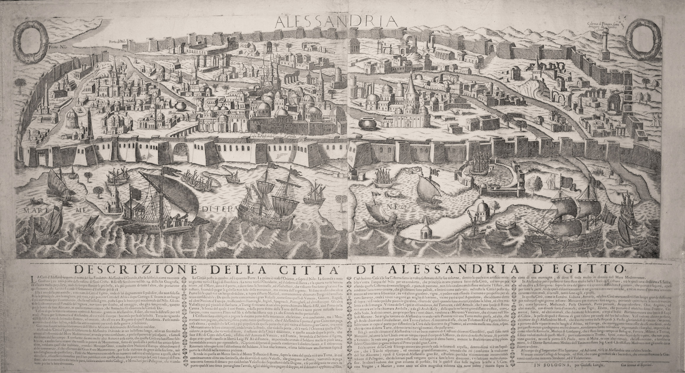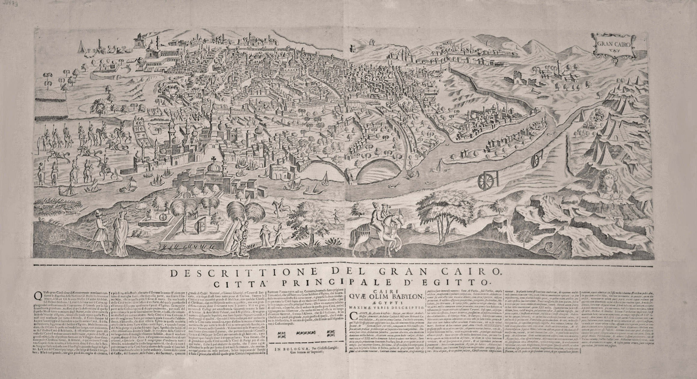 Unrecorded in the standard bibliographies and without counterpart in western libraries: unique, large-scale views of Cairo and Alexandria. The Muslim influence may be discerned in the people's clothing in the foreground as well as in both cities' architecture. On the river Nile, the views depict numerous trade boats and sailors. The Italian (and, in the case of Cairo, Latin) letterpress text pasted under the engraving provides mostly historical and geographical information.