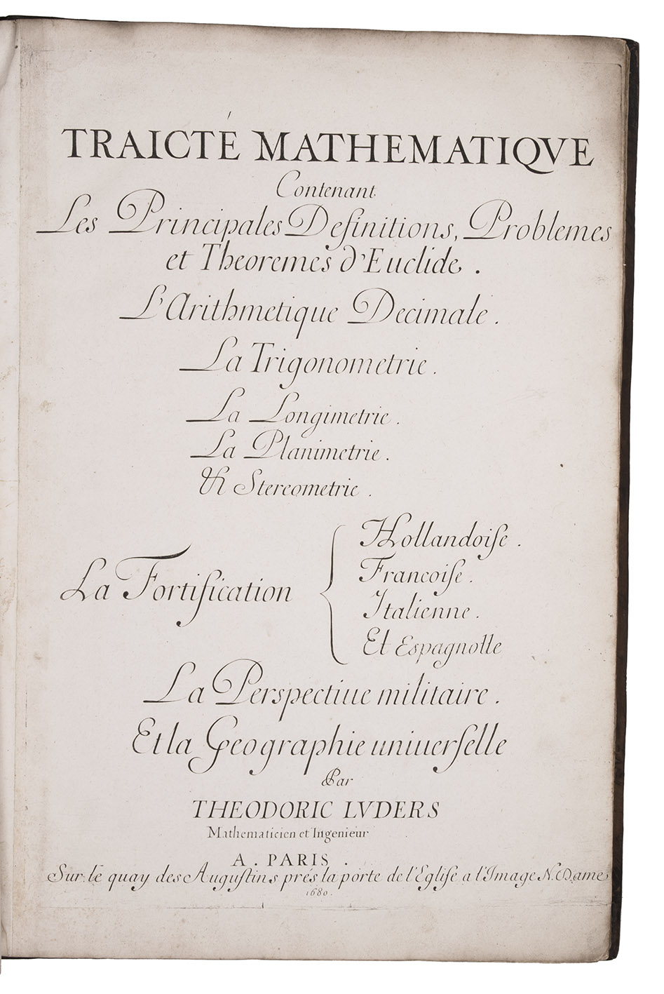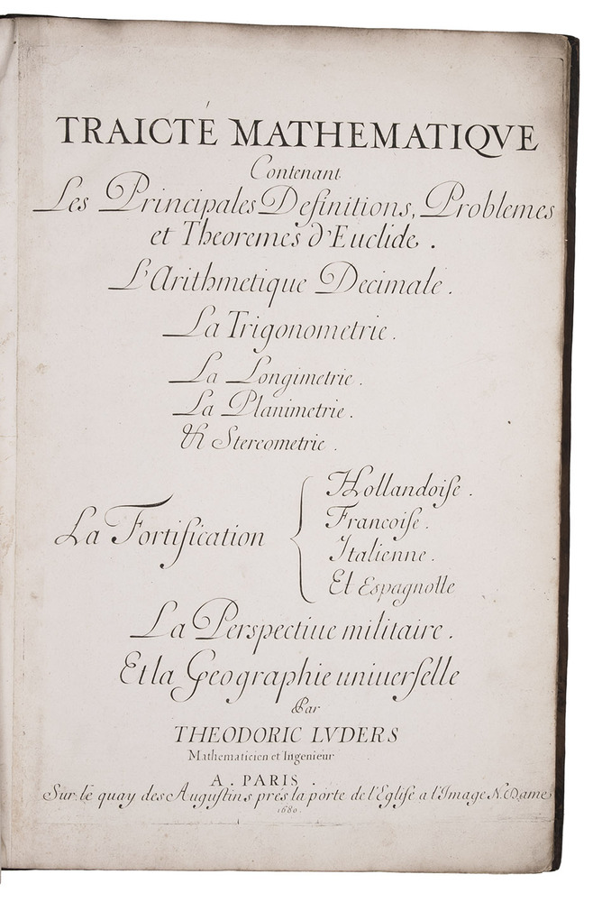 Traicté mathematique contenant les principales definitions, problemes et theoremes d'Euclide. l'Arithmetique decimale. . . . La fortification Hollandoise. Francoise. Italienne. Et Espagnolle.