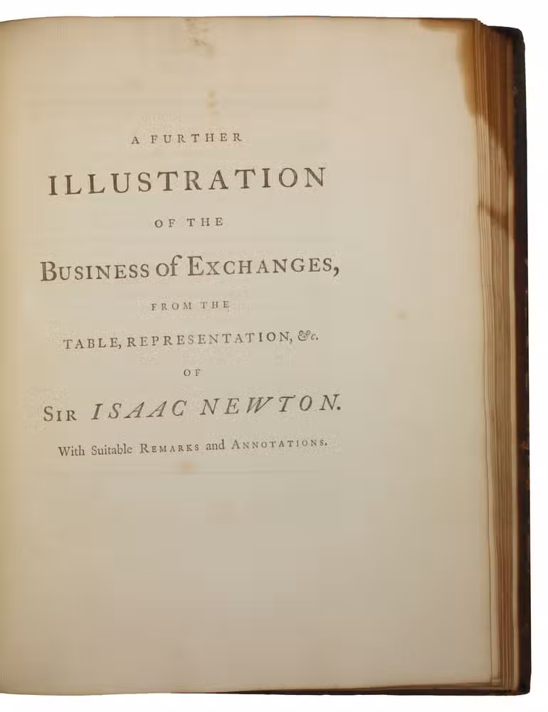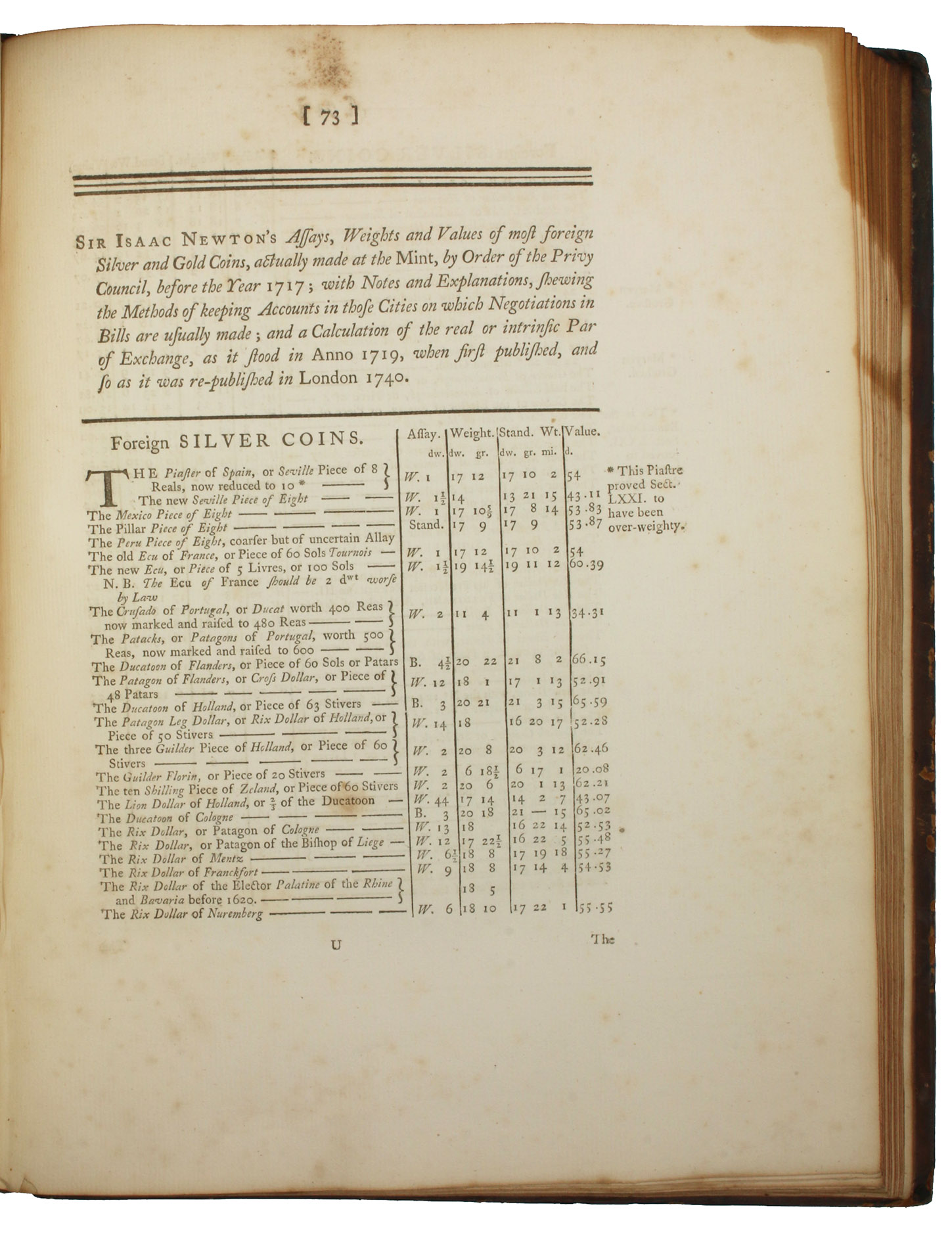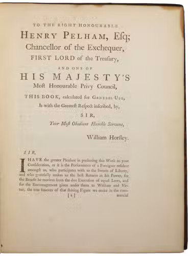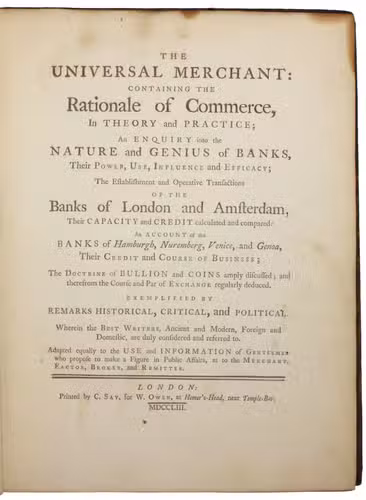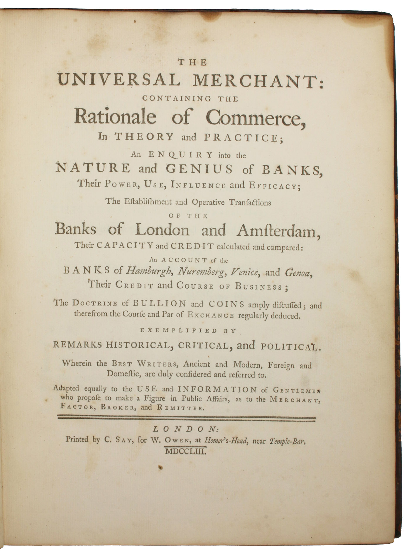 First edition of one of the earliest books to define modern banking in English, used as an important reference work by Adam Smith during the research for and writing of The Wealth of Nations, especially regarding the estimates of the precious metals imported into Europe; Smith cites its author as "Mr Meggens." Nicolas Magens (1697-1764) was a prominent 18th-century merchant, banker, and shipowner, and a pioneering figure in international trade. A native of the Duchy of Holstein, Magens moved to London in the 1730s, where he married a British wife and was naturalised in 1737 by a Private Act. Magens became particularly involved in the trade between Britain and the colonies in North America, and indeed was a leading proponent of the establishment of a free trade agreement between Britain and the American colonies.