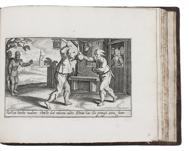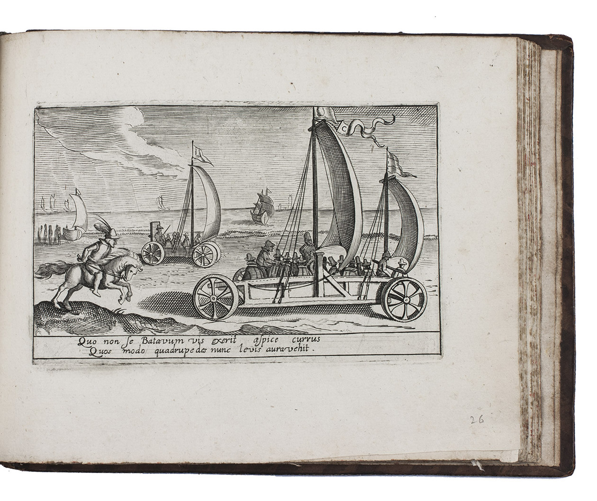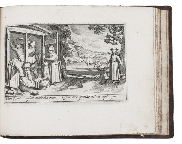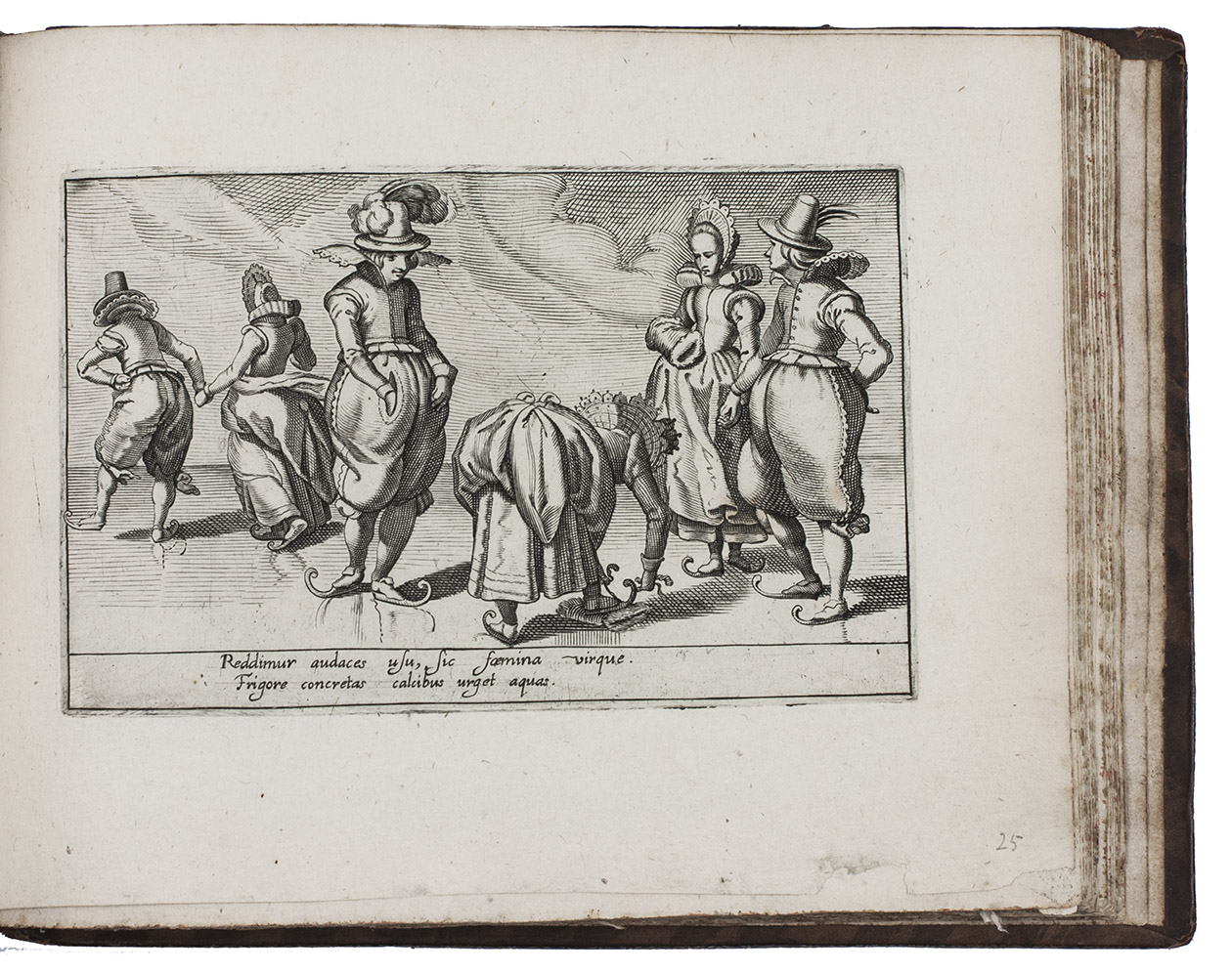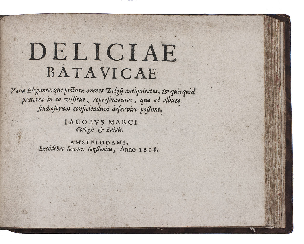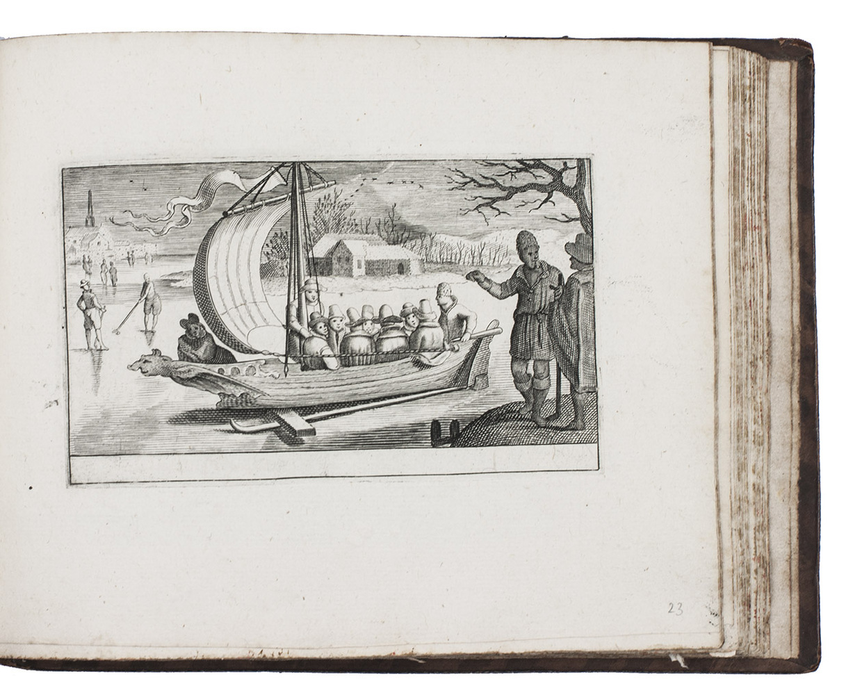 The most complete copy we have seen of the 1618 edition of a rare work of noteworthy sights, views, and scenes from daily life and from trade and industry in the Netherlands (primarily Holland). It was intended in part for students to use as an album amicorum. The plates include salting and smoking haring, ship-building, making hemp rope ("cannabis" in Holland in 1618!), Dutch peasants, ice skating, wind-powered and horse-drawn ice sledges, wind-powered carts on the beach and many more. One copy of this edition at Amsterdam University has exactly the same plates as the present, while another copy there, and copies at Leiden University and the Pierpont Morgan Library, have fewer.The heraldic plates vary even more from copy to copy and were probably assembled according to the wishes (and pocketbook) of the buyer. Ours has 8, the Van Stolk copy of the undated edition has 4 and the most complete Leiden copy of the 1616 edition has 7, but each has heraldic plates not in the others. Atlas van Stolk 1027 note (citing copy then in possession of Frederik Muller & Co. with 27 views, perhaps now at Leiden University: Van Stolk's own copy, of the undated ed., has 26 views); STCN (4 copies); WorldCat (5 copies); cf. Hollstein XXXVIII, C. J. Visscher 116a-120a, 122a-123a (8 views); Muller, Hist. prenten, suppl., 1285B (undated ed., 10 views); Simoni, D38 (undated ed. 30 plates incl. arms & views); http://socrates.leidenuniv.nl (1616 ed.).