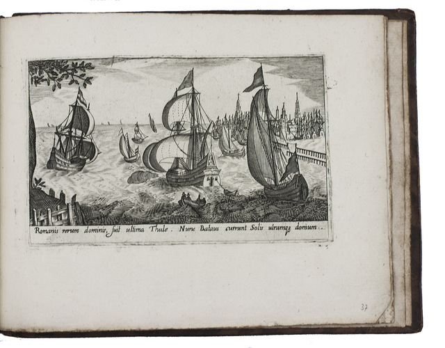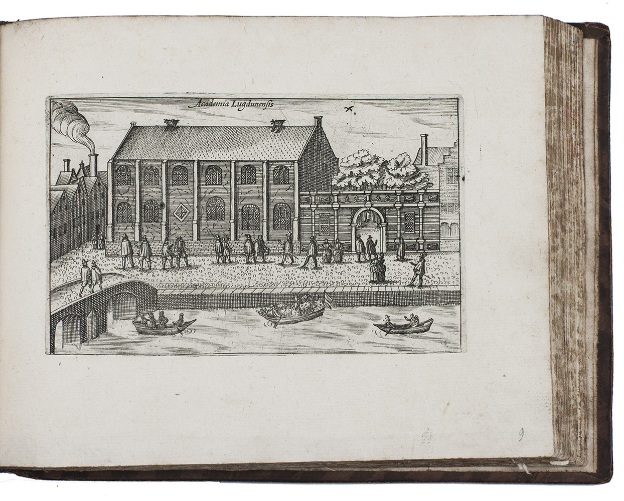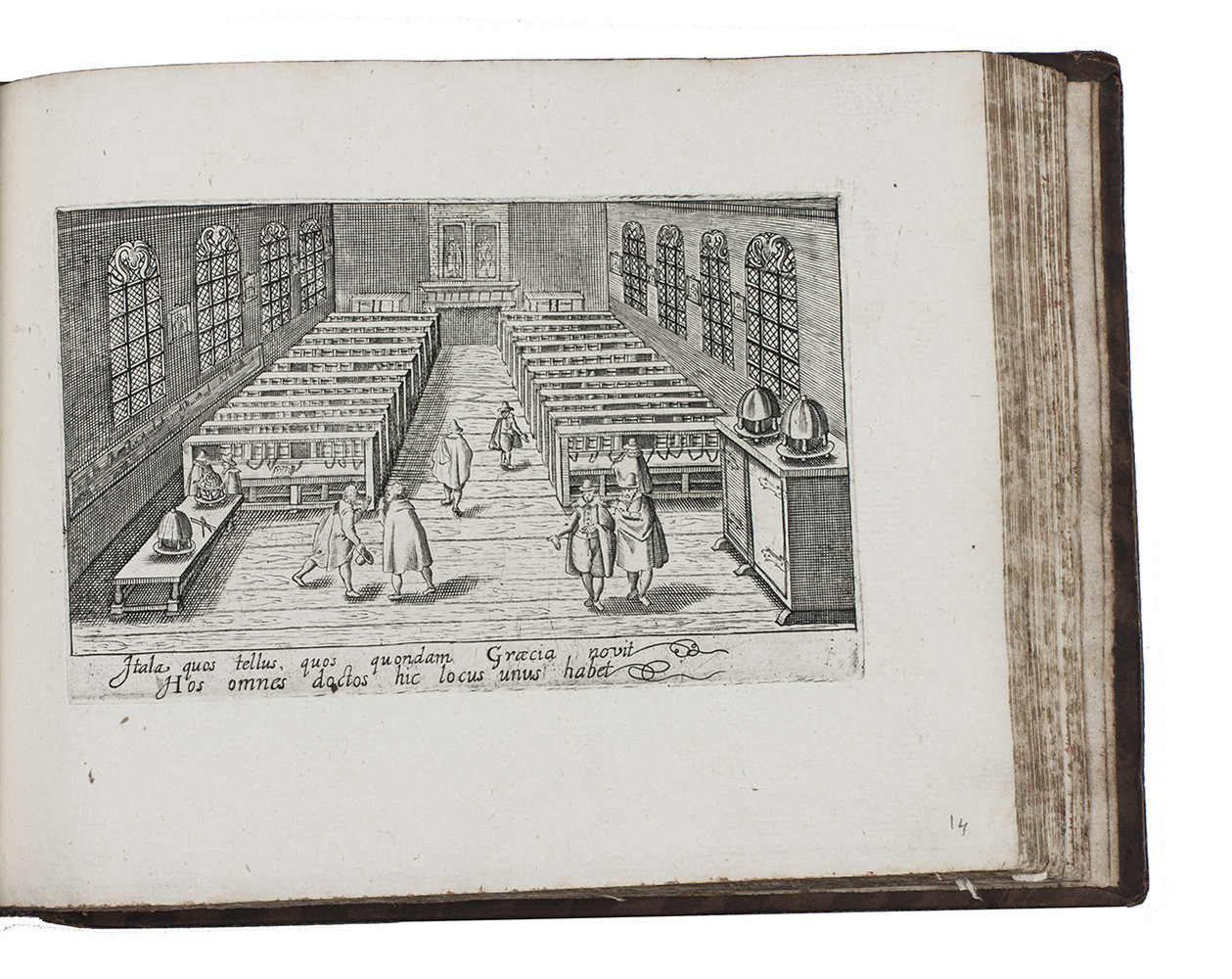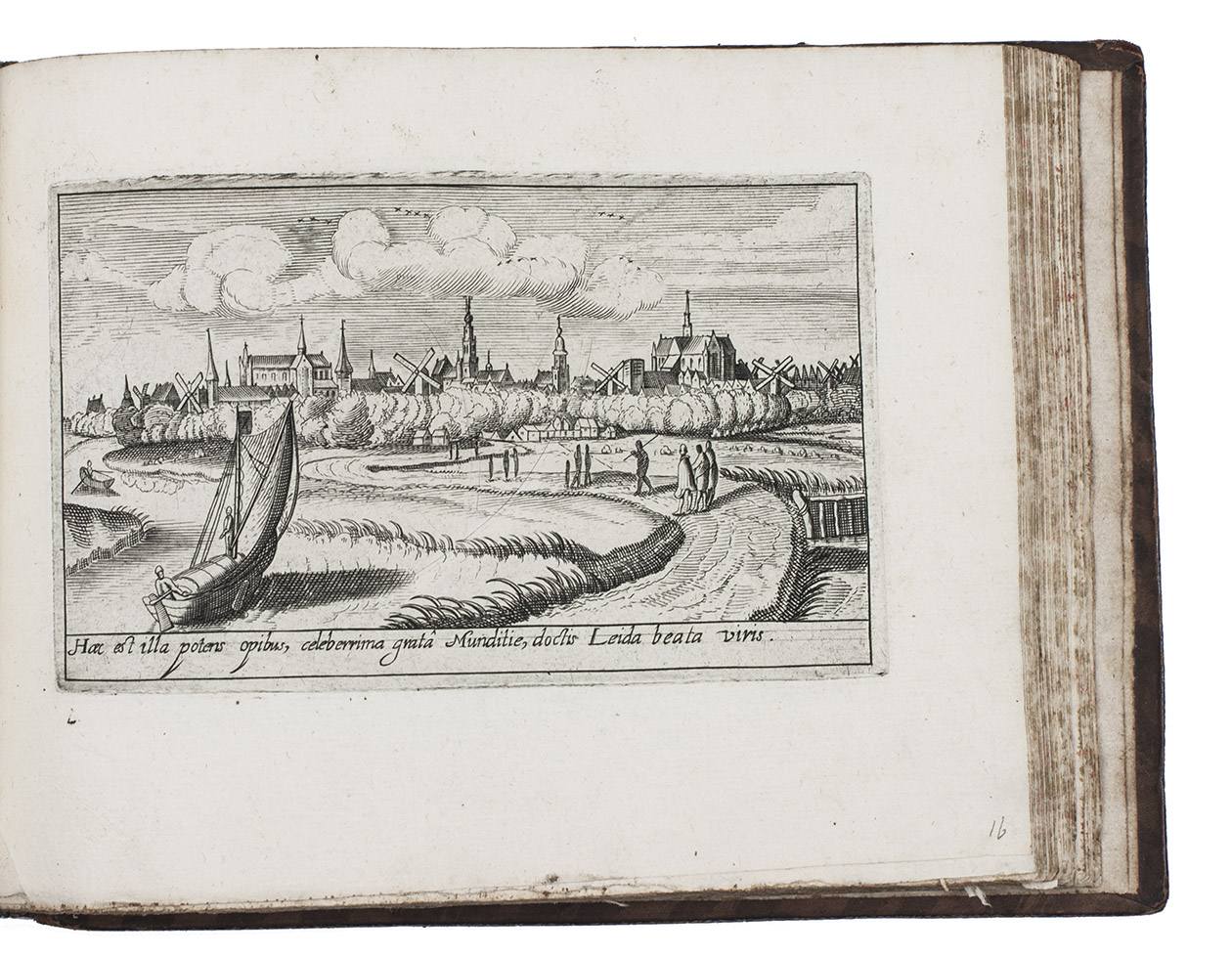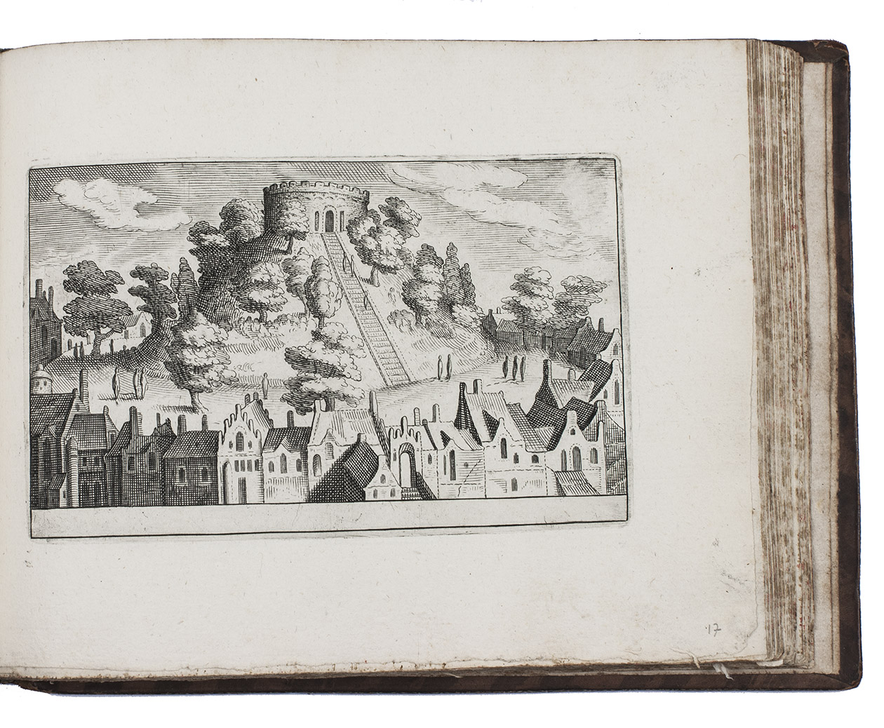 Amsterdam, Johannes Janssonius, 1618. Oblong 8vo (text) & small oblong 4to (plates) (14.5 x 19 cm). With 8 engraved armorial plates. These are followed by 30 engraved views or scenes most with a Latin distich at the foot. Interleaved. Sprinkled calf (ca. 1700), gold-tooled spine. [1], [1 blank], [5], [1 blank] pp. plus plates.