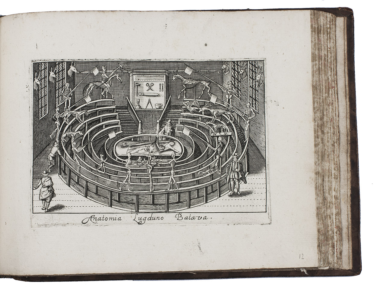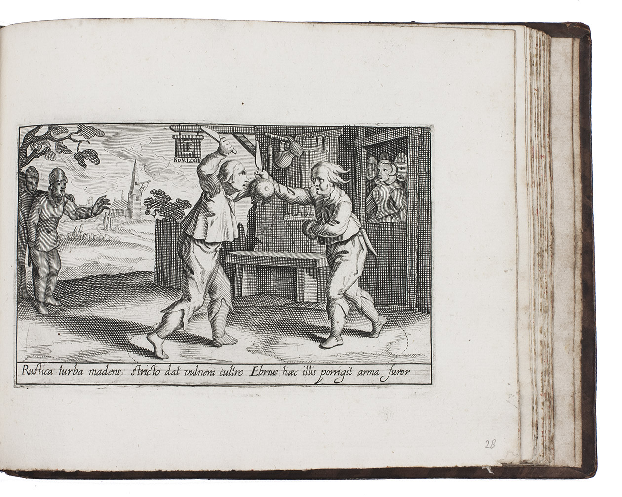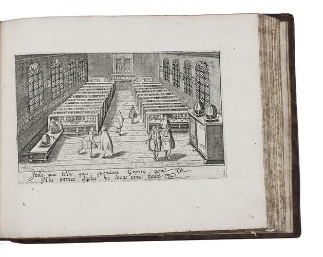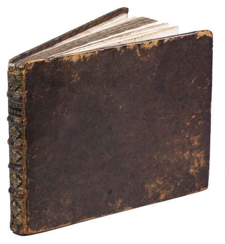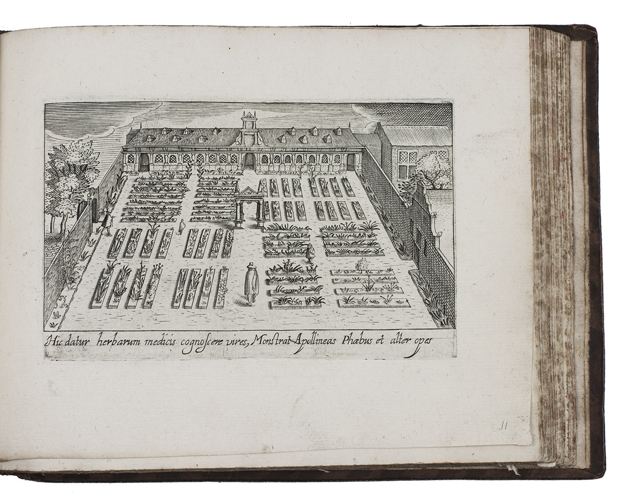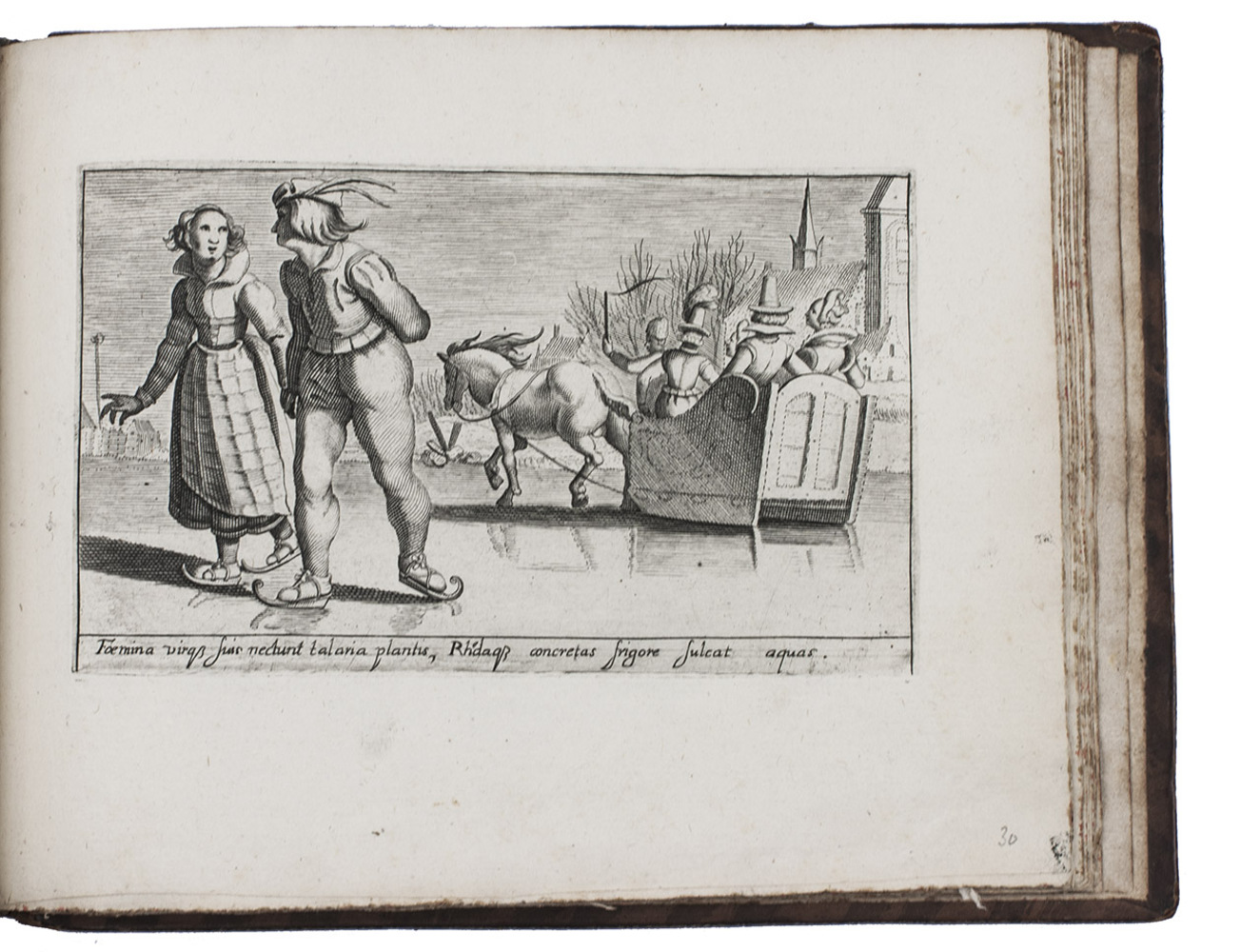 Amsterdam, Johannes Janssonius, 1618. Oblong 8vo (text) & small oblong 4to (plates) (14.5 x 19 cm). With 8 engraved armorial plates. These are followed by 30 engraved views or scenes most with a Latin distich at the foot. Interleaved. Sprinkled calf (ca. 1700), gold-tooled spine. [1], [1 blank], [5], [1 blank] pp. plus plates.