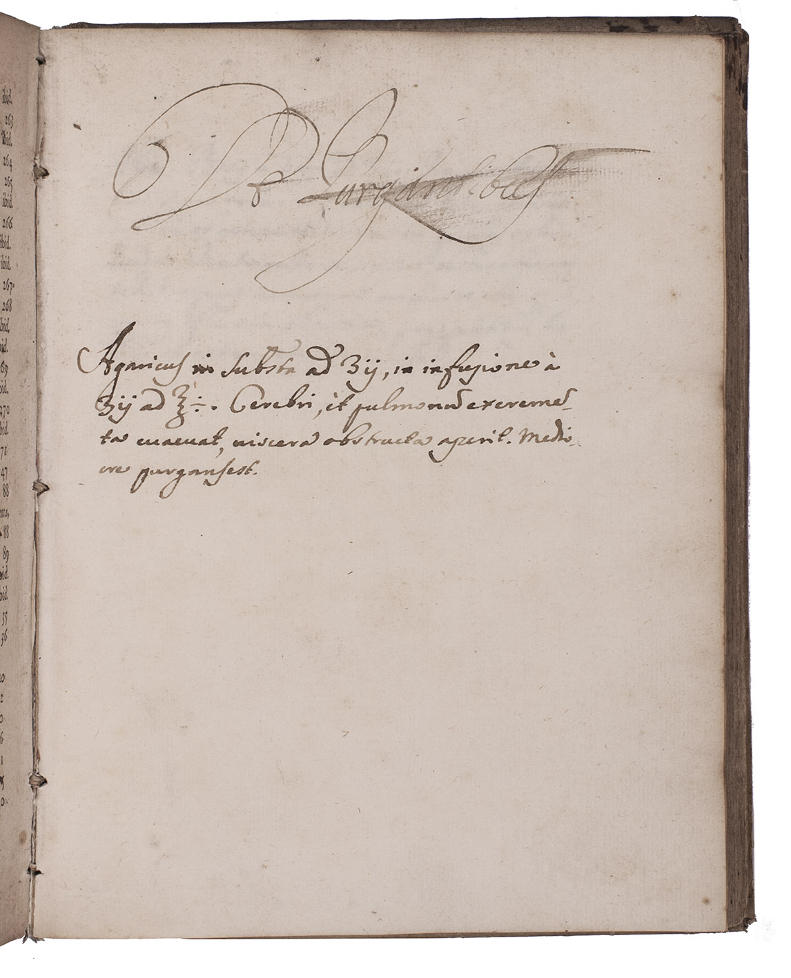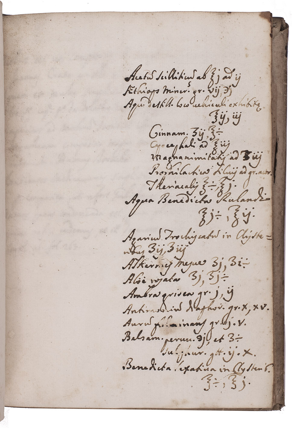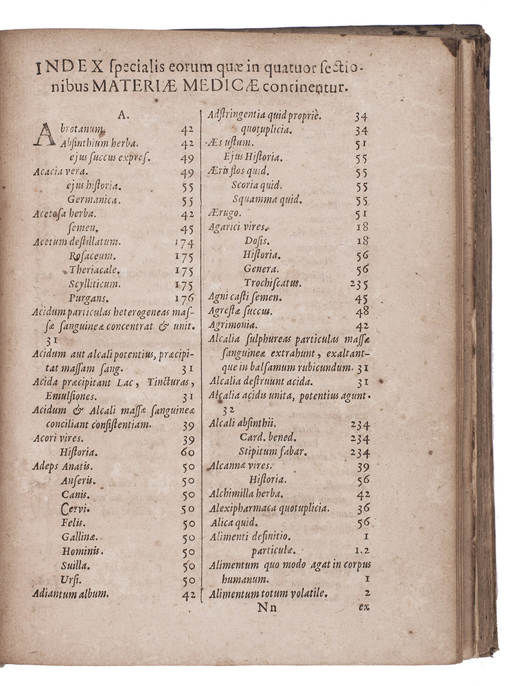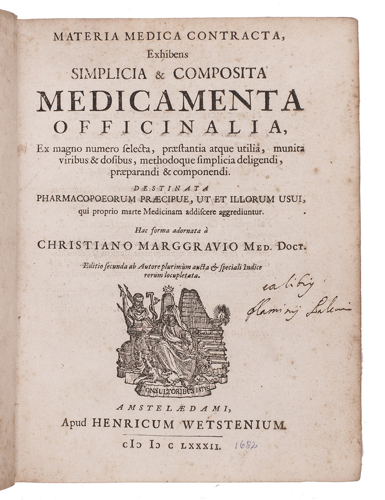 Second and best edition (2nd issue) of a detailed Latin handbook of pharmacology, written by the Leiden physician and lecturer in medicine and chemistry Christiaan Marggraf (1626-1687), first published in 1674 but greatly expanded by the author for the present second edition. The book contains hundreds of medicinal recipes, using ingredients derived from animals, plants and minerals (including metals), and is especially interesting for its attempt to classify medicines in hierarchical tables, just when John Ray in England was pioneering the hierarchical classification of plants that anticipated the Linnaean classification used today. The text is divided into four sections and is based on the physiological chemistry of Sylvius, which was beginning to displace the Paracelsian iatrochemical school, represented by Van Helmont, which had dominated medical chemistry for more than a century. The first section gives a general introduction and discusses the theory of both simple and compound medicines. The second discusses the preparation of ingredients. The third (with the hierarchical tables) and fourth (with most of the recipes) discuss compound medicines. There is also a 3-page table of contents and a 22-page index.