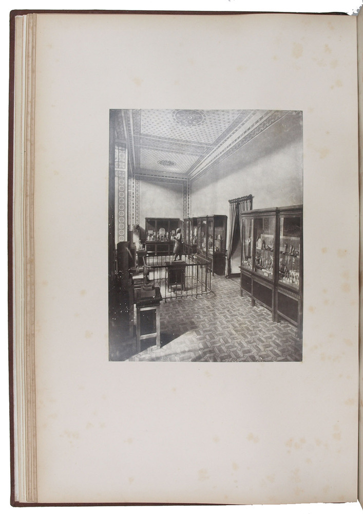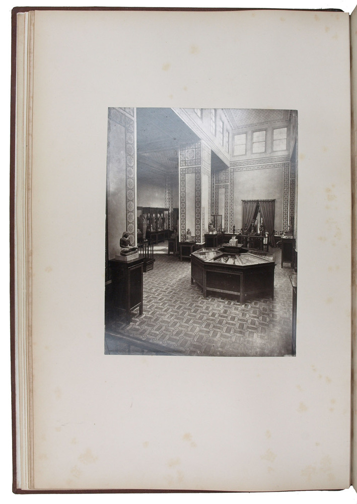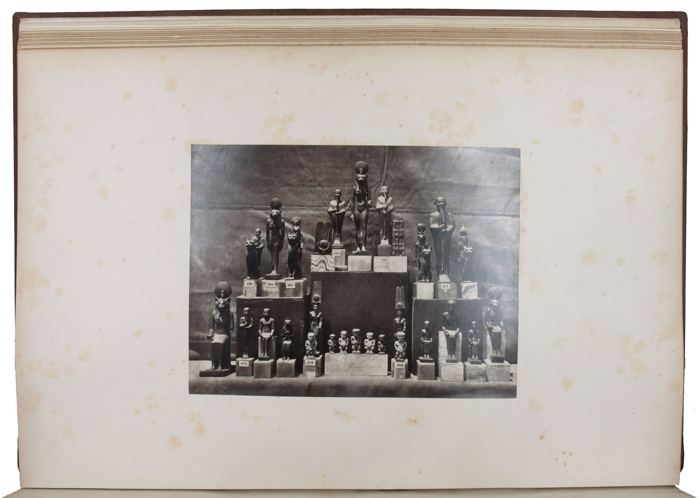 Beautiful photograph album made in Cairo, the first illustrated catalogue of the first Egyptian Museum. The photographs by Hippolyte Délié and Émile Béchard, show the halls and antiques of the Bulaq Museum, founded in Cairo in 1863 by the great Egyptologist Auguste Mariette (1821-1881), who in 1858, following his appointment as head of the Antiquities Service, had moved the banks of the Nile. Mariette obtained permission to settle in Bulaq in the abandoned offices of the River Company. In these dilapidated premises, where he lived with his family, he served as "Director of the Historical Monuments of Egypt and the Cairo Museum", and aided by his faithful assistants Bonnefoy and Floris he converted four rooms of his residence into the Museums first four exhibition halls. The period photographs published in the present Album du musée de Boulaq show the low buildings by the river, which were to be almost completely devastated by the 1878 flood.