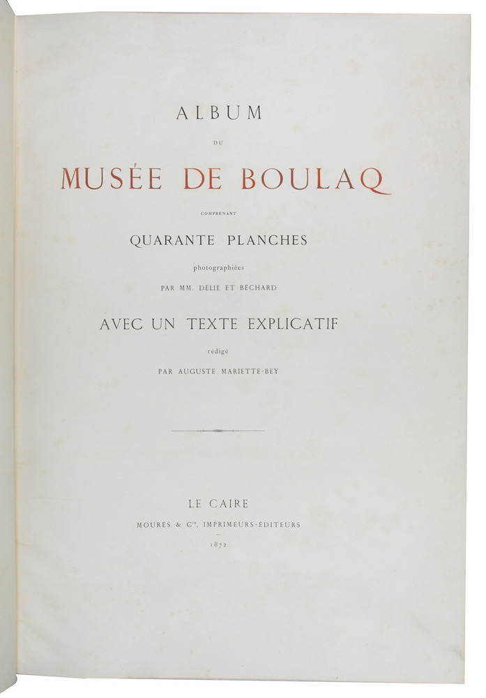 In the preface, dated 1 November 1871, Mariette explains the origins of this monumental album: "Mr. Hippolyte Délié and Mr. Béchard requested permission from the Directorate of the Bulaq Museum to reproduce by photography some of the monuments on display in our galleries. Not only was the application ... explicitly welcomed, the Director of the Museum felt he should promote the work of the great photographers from Cairo, opening the Museums cabinets for them and choosing among the objects it contains those that appeared to him most worthy of inclusion in the proposed album. Mr. Délié and Mr. Béchard have followed, for the classification and arrangement of their proofs, the order adopted in the Notice sommaire, which is for sale at the entrance of the Museum. The three plates showing the interior and exterior of the Museum serve as an introduction to the Album. The monuments are then classified into religious, funerary, civilian, historical, Greek and Roman sections. The photographic Album ... is thus an illustrated catalogue of the Museum. The remarkable execution of the plates allows us also to recommend this album by Mr. Délié and Mr. Béchard to everyone. Travelers will indeed use it as a souvenir of their visit to the Bulaq Museum. Scholars will find the hieroglyphic texts reproduced with such clarity that they will feel they are in the direct presence of the monuments. Finally artists will find no other work on Egyptology as well suited to their study as the beautiful proofs delivered by the apparatus used by Mr. Délié and Mr. Béchard, which will illuminate the difficult problems that relate to the history of art in Egypt".