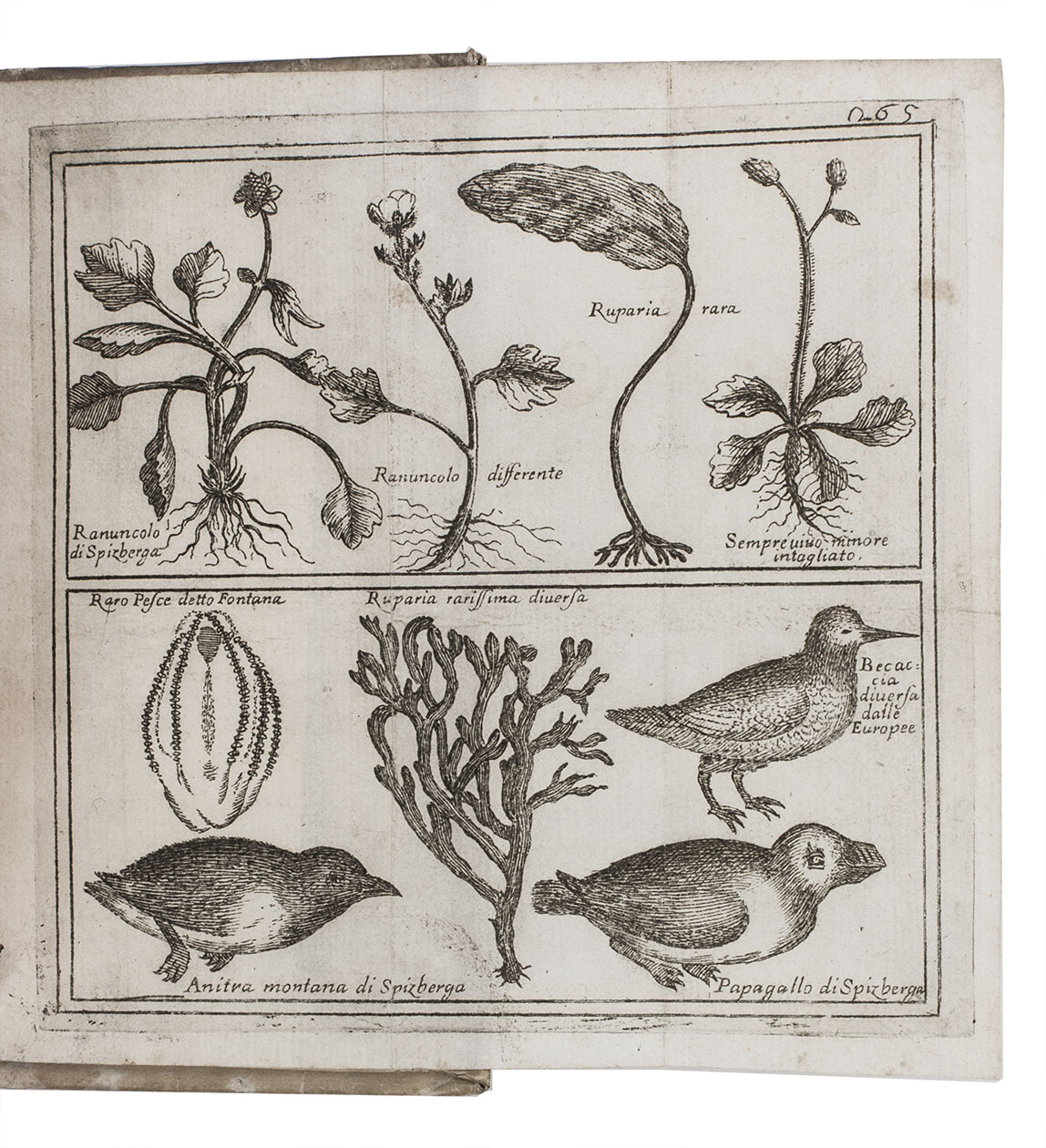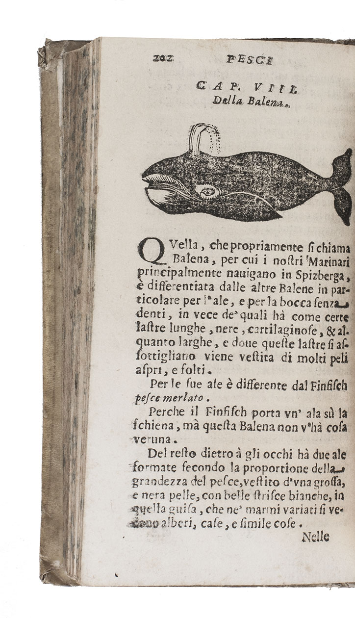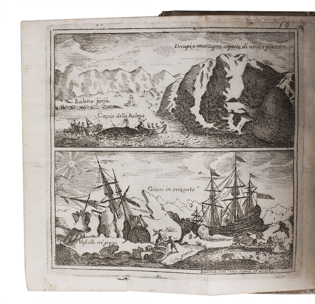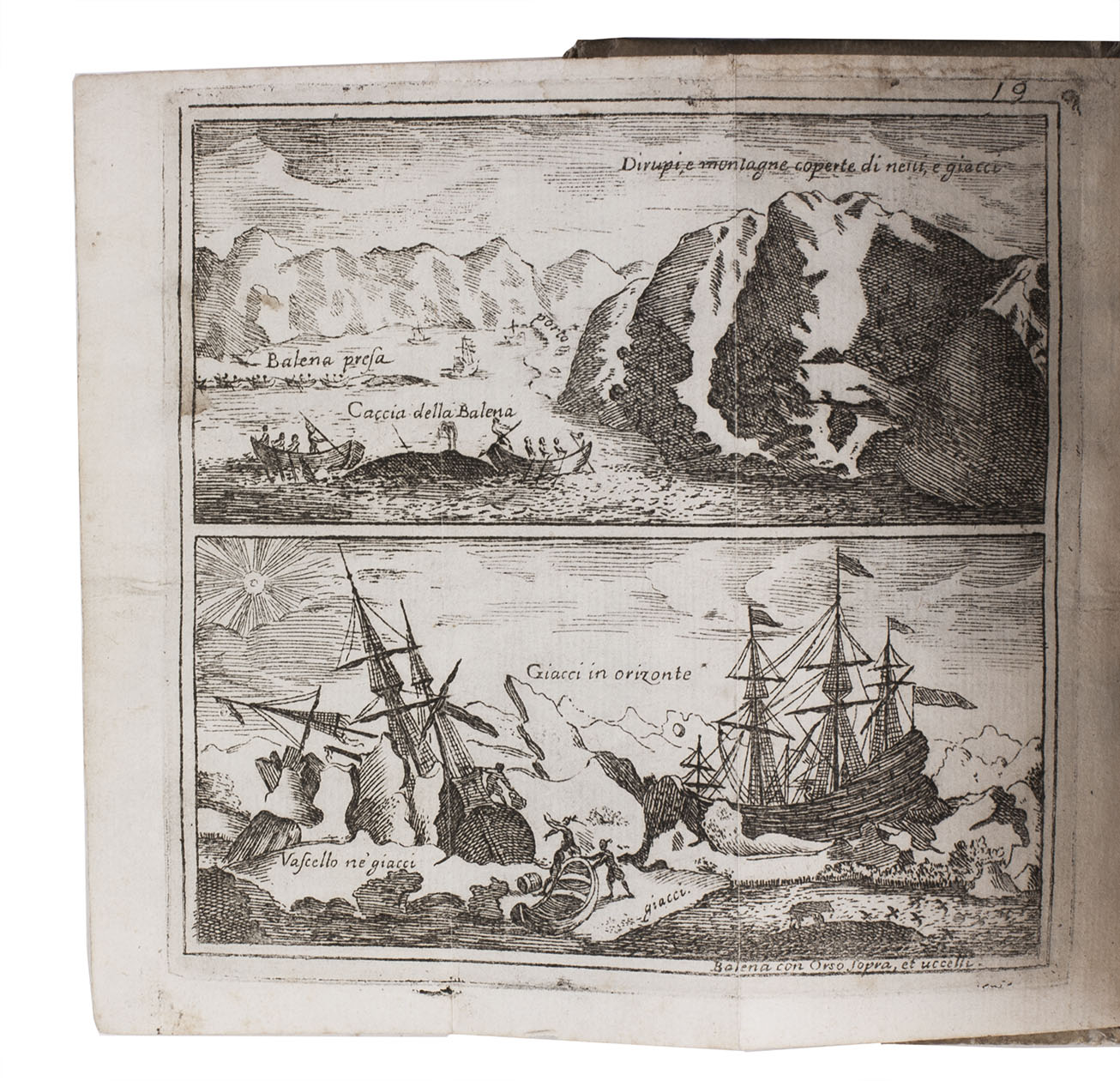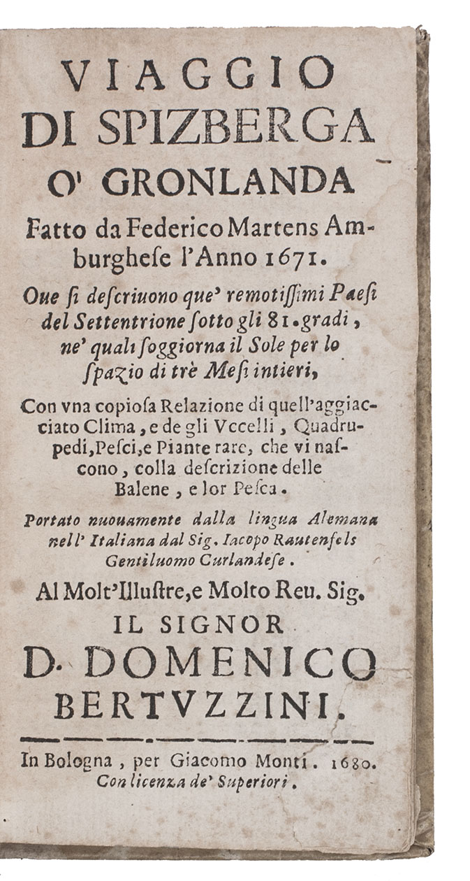 Rare Italian edition of Martens's account of a whaling voyage to Spitsbergen and Greenland which "furnishes the first exact description of arctic zoology" (Wood). In relation to cetology this work is "one of great interest and importance, not only from its early date, but for the good account it gives of the Greenland Right Whale and the Whale fishery" (Allen). Friedrich Martens (1635-1699) sailed as ship's surgeon on the whaler Jonas im Walfisch. His account includes comments on locating whales, the best place to shoot a whale and the best blubber to harvest, as well as noteworthy and early descriptions of arctic wildlife. The folding plates show birds and plants, a whale-hunting scene and a ship trapped in ice. The woodcuts includes two illustration of whales.