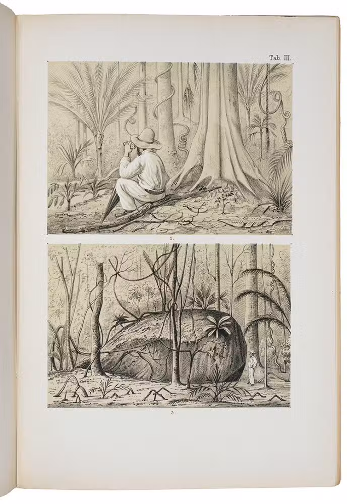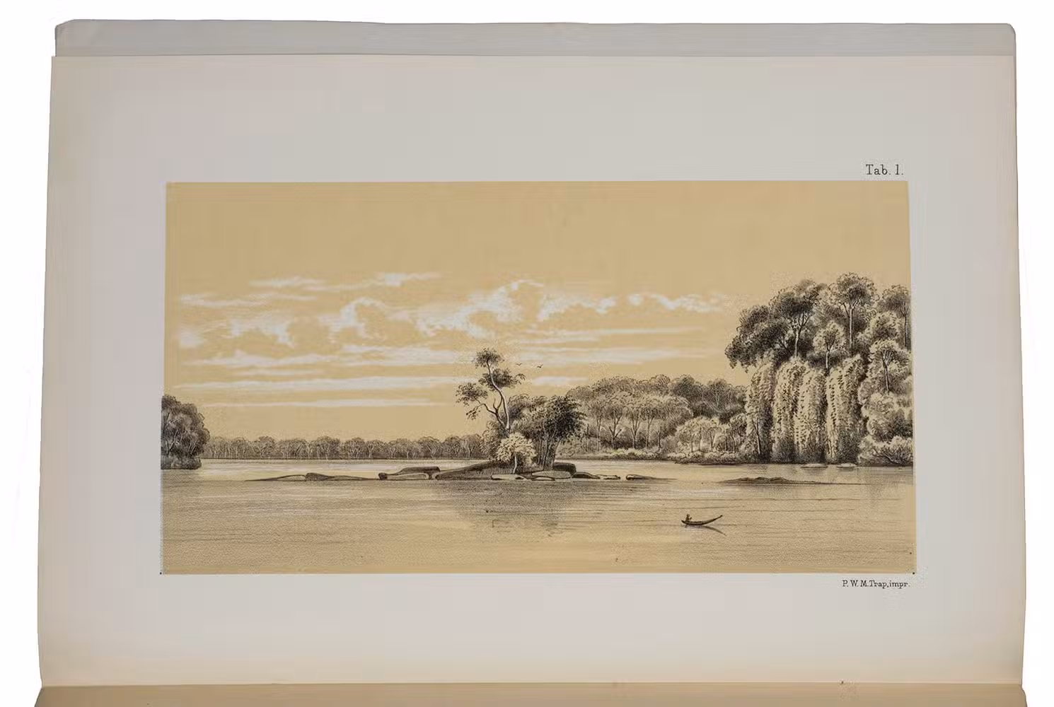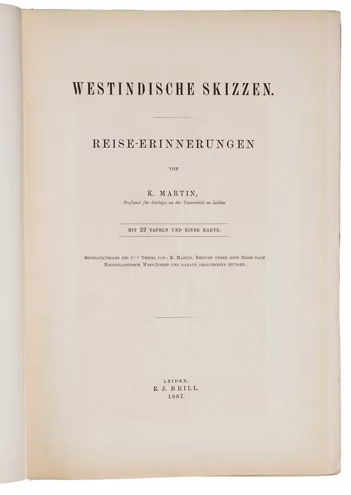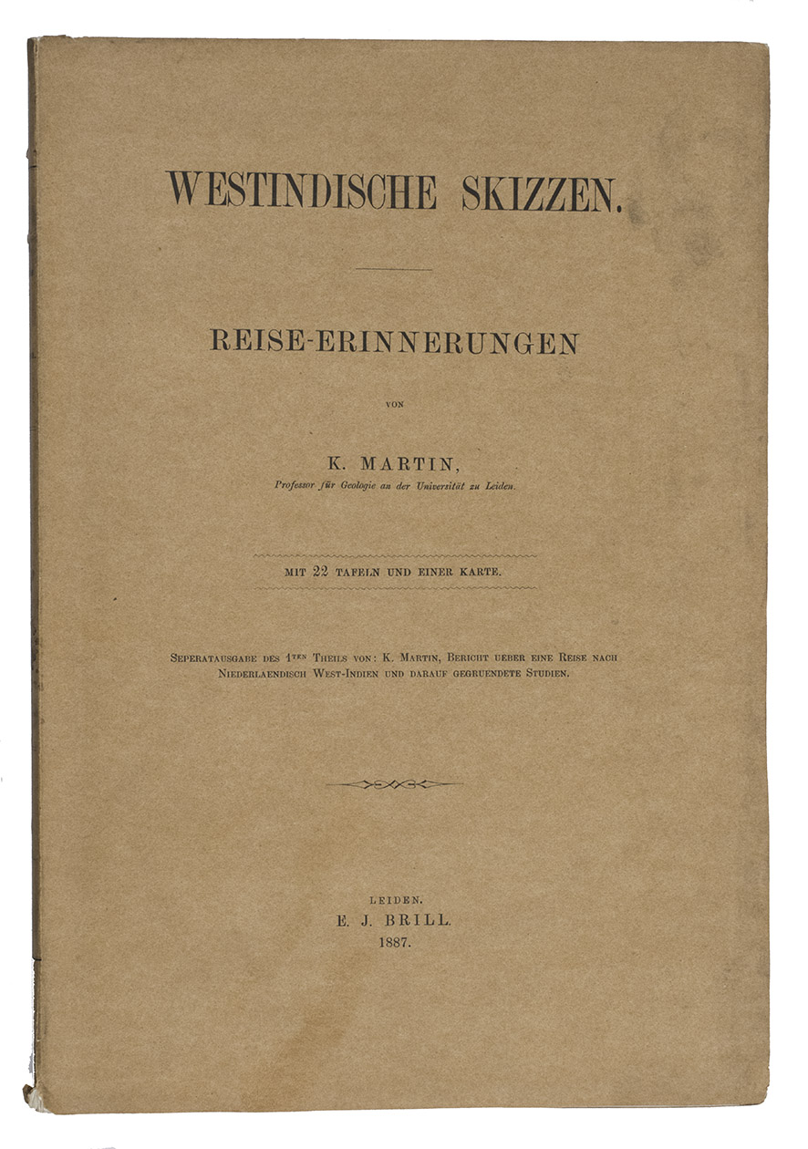 First and only separate edition of the first part of Karl Martin's research voyage to the Dutch West Indies. Johann Karl Ludwig Martin (1855-1942) was a leading German-Dutch geologist and professor of geology at Leiden. He is known for his geological research in the Dutch colonies, mostly the East Indies but the present work comprises only the Dutch West Indies and in particular inner Surinam. The present first part treats the land and people of Surinam. Martin went down the Surinam River, deep into the jungle, encountering native tribes and strange rock formations. Photographs were made, of which 8 are included as collotype plates at the end of the work. They depict mostly the coastal areas and one shows a train riding along a very steep cliff.
