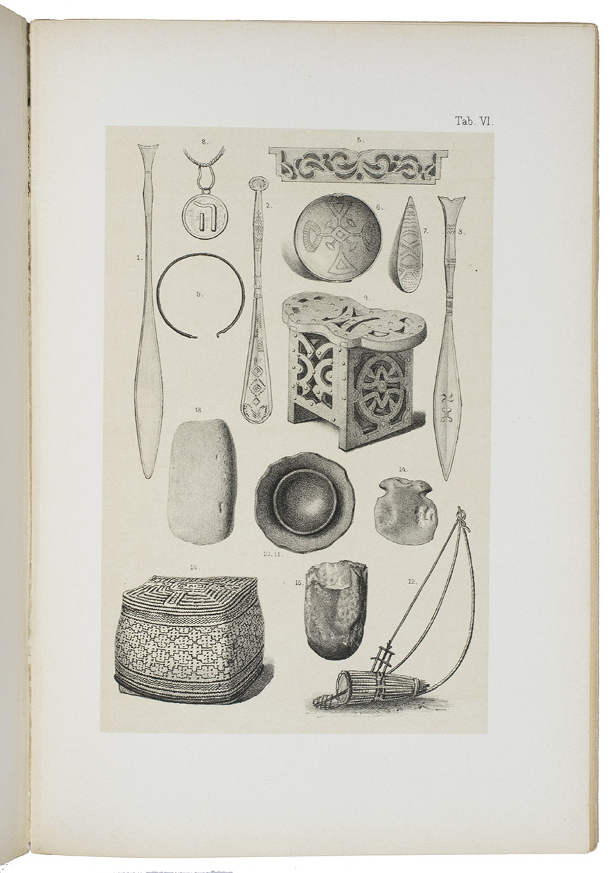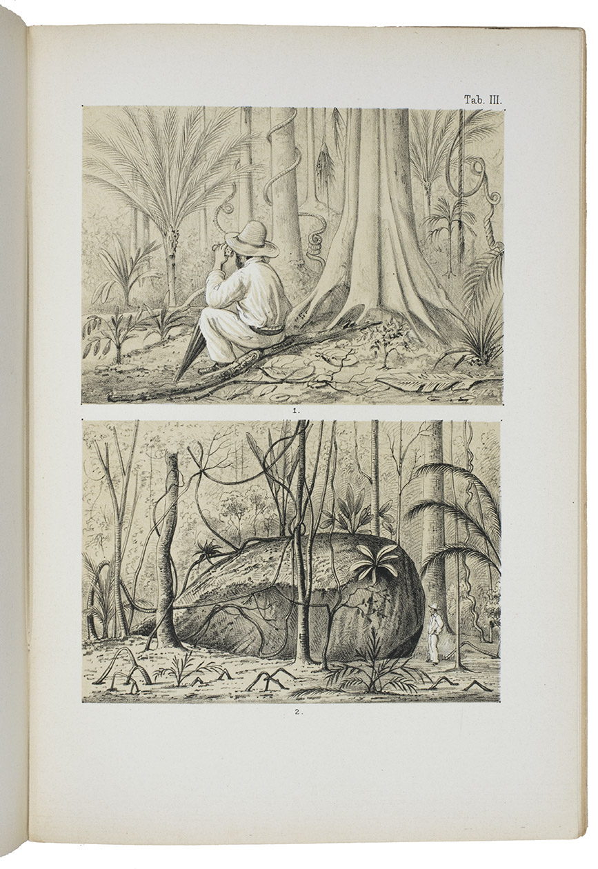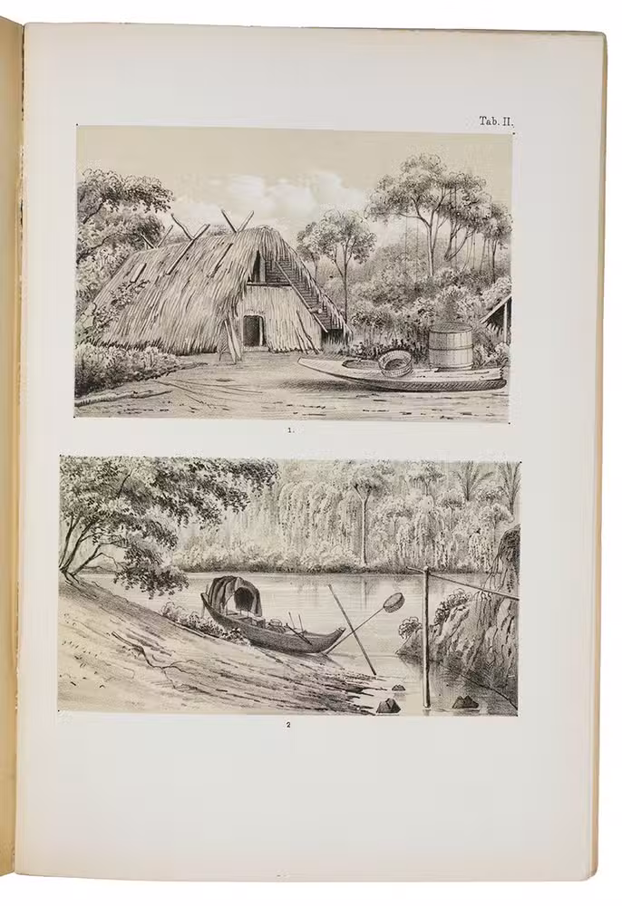 Leiden, E.J. Brill, 1887. 4to. 22 plates, of which 14 chromolithographs and 8 collotypes, and 1 folding lithographed map of the Surinam River by W.L. Loth. Original publisher's printed paper wrappers. VII, [1], 186 pp.