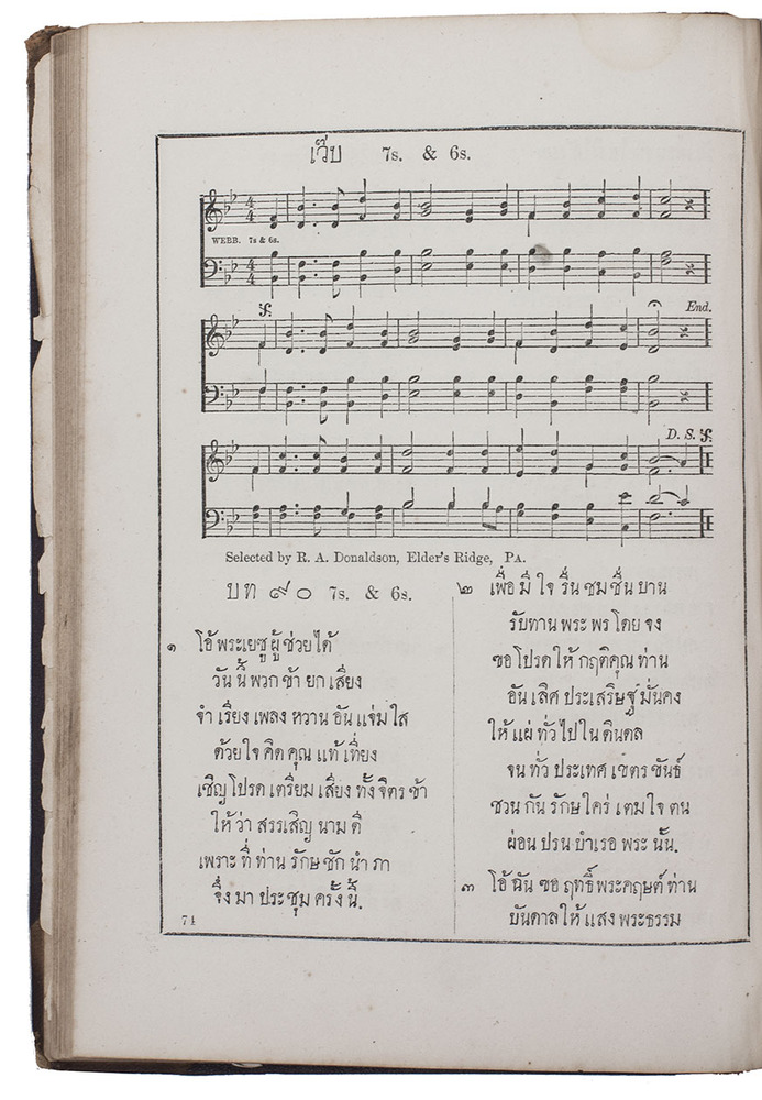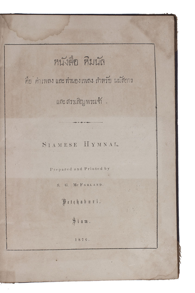 Very rare first edition (first issue) of McFarland's Thai (Siamese) hymnal, one of the first books printed by the mission press at Phetchaburi (Petchabury) in Thailand, with the 86 hymns selected by donors who contributed at least five dollars for the production of the hymnal. Each hymn appears on a single double-page spread (with the music at the head of the left page) except the last, whose text continues on nine additional pages. The texts of the hymns themselves appear only in Thai, but the title, introductory note and hymn titles also appear in English and each hymn gives the name of the person or organisation that selected it in English only. Some of the donors who selected the hymns lived in Thailand (both Europeans and natives) but most lived in the United States. Each hymn also indicates the metre, either with abbreviations for the common, long, short, hallelujah or particular metre, or with an indication of the number of syllables per line. The music was apparently set and electrotyped by J.M. Armstrong in Philadelphia and the electrotype blocks shipped to Phetchaburi for printing, for the Newberry Library copy of the second issue has a manuscript note "Music typography by J.M. Armstrong, Philadelphia, Pa.".