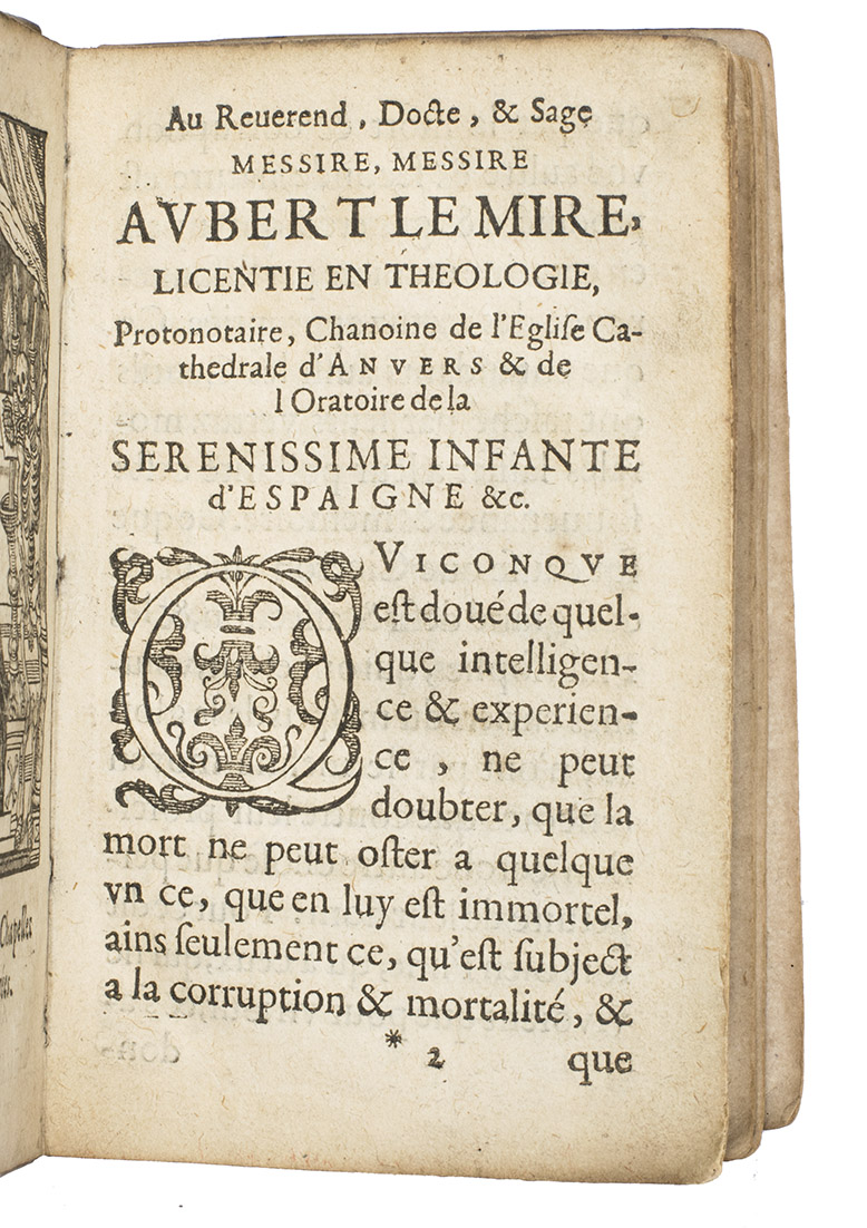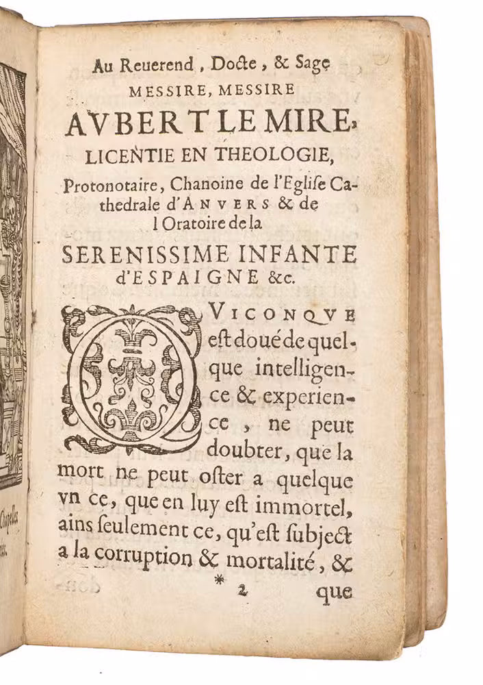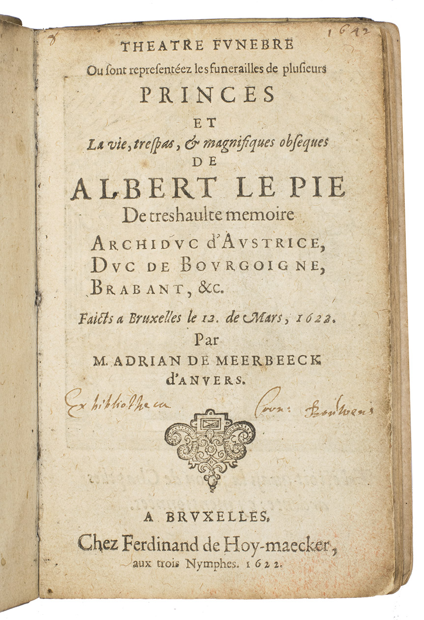 Impetus for the book was the Brussels funeral procession of Albert VII (1559-1621), Archduke of Austria, who in 1598 had married the Infanta Isabella, daughter of King Phillip II of Spain, who appointed them co-governors of the Spanish Low Countries. Meerbeeck dedicated the book to Aubert Lemire, dated 18 June 1622 and Adrian de Meerbeeck (1563-post 1627) wrote the text. In the same year the Ferdinand de Hoeymaker also published an edition in Dutch (Landwehr 72).