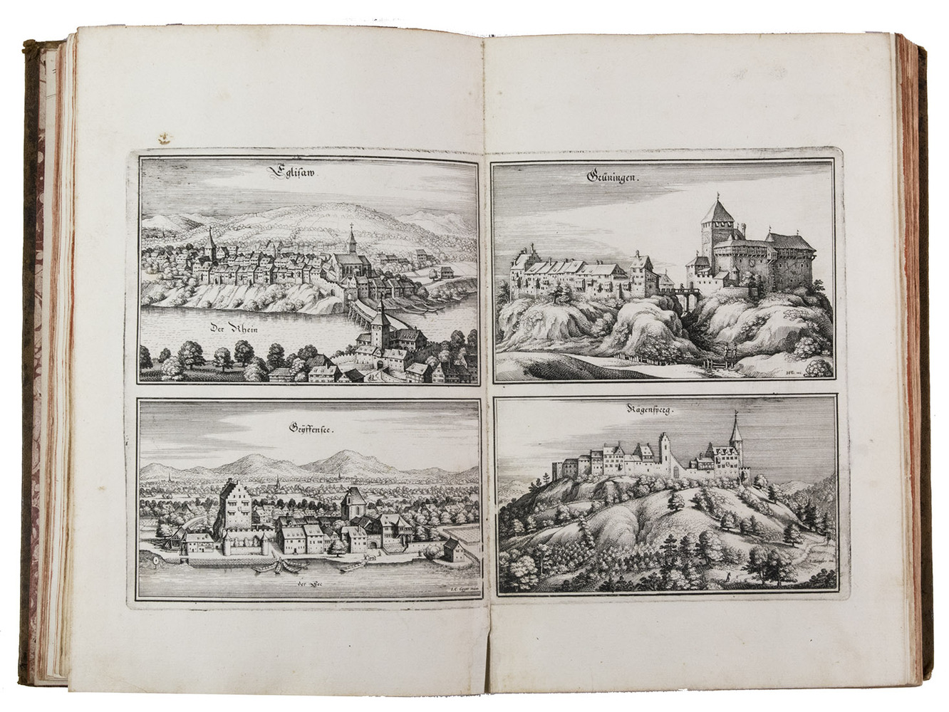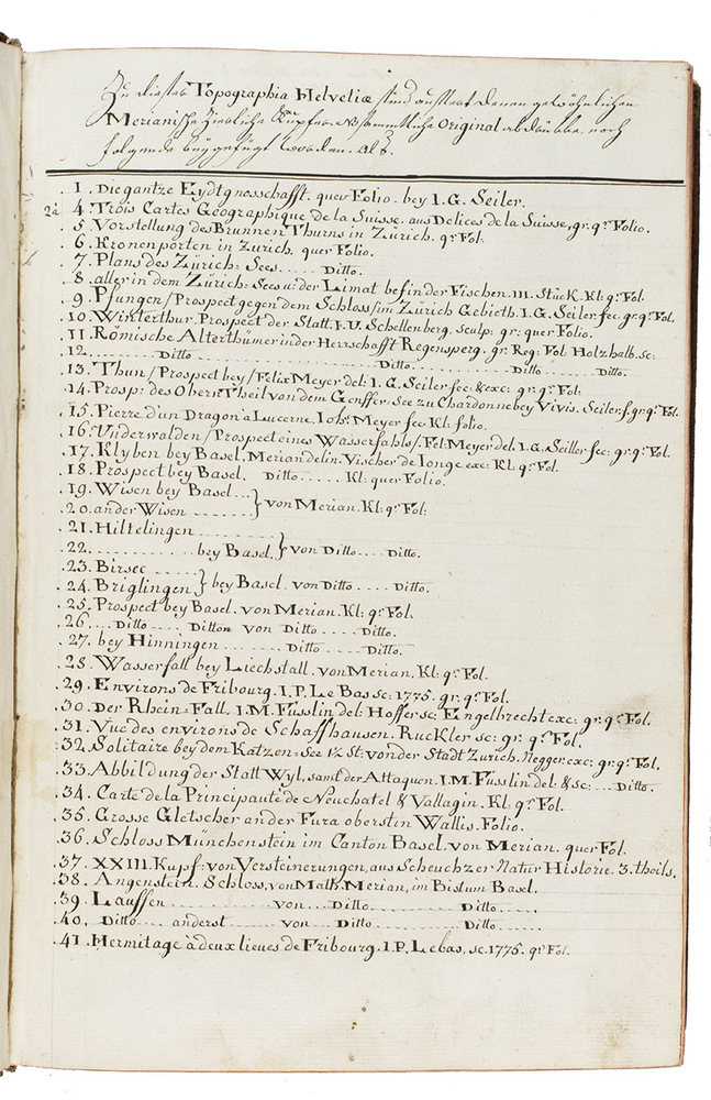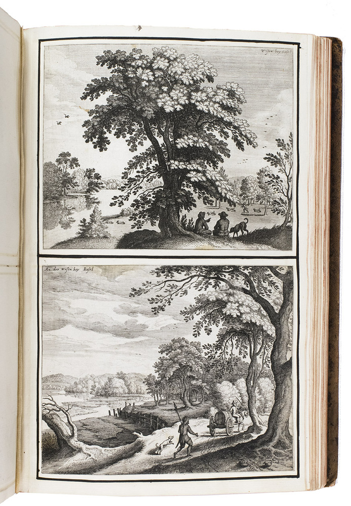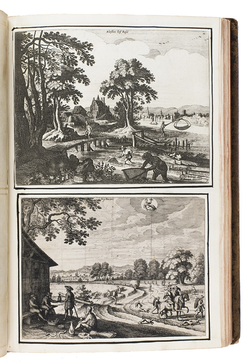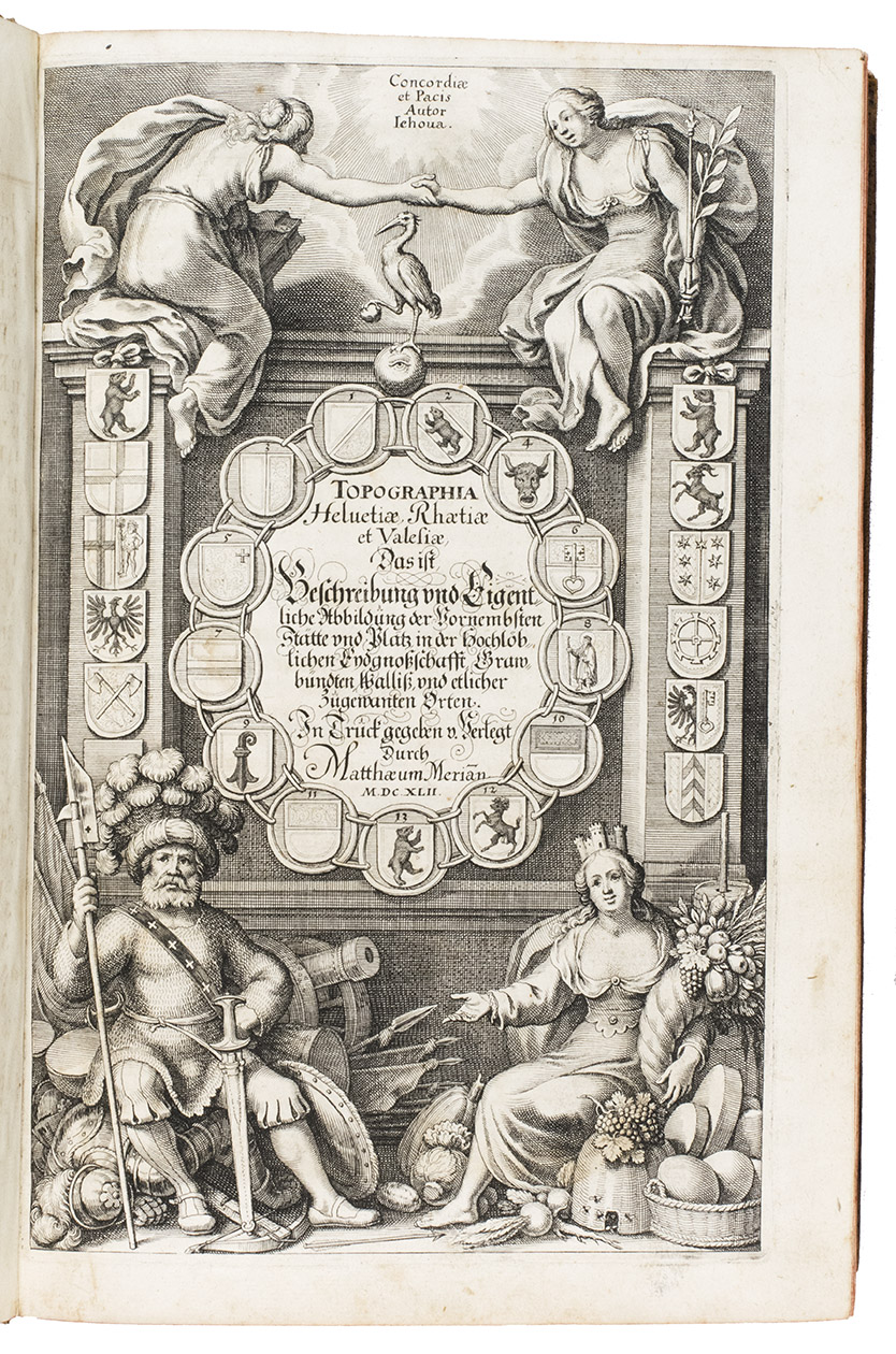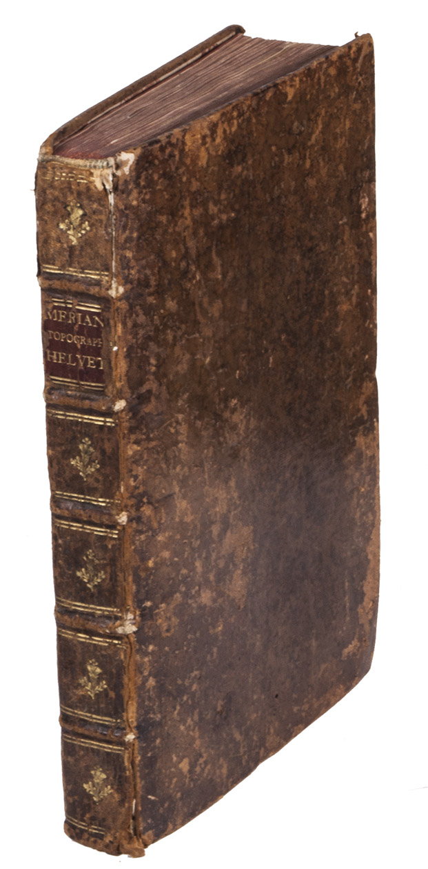 [Frankfurt am Main], Matthäus Merian, 1642. Folio. With richly engraved title-page, 74 (of 76) engraved maps, plans and views on 54 (of 56) plates normally included the 1642 first edition (nearly all double-page) plus 1 large folding plate from the 1653 Anhang, and 67 additional engravings from the 17th and 18th century, including at least 16 by or after Merian. Altogether there are 3 general maps (1 of Germany and surroundings and 2 of Switzerland), 4 detail maps, and numerous city plans and views. Lacking the bird's eye view of Herisau and the second of two views of Neuchâtel. Tanned sheepskin (ca. 1700?), gold-tooled spine. 72, [8] pp. plus engraved plates.