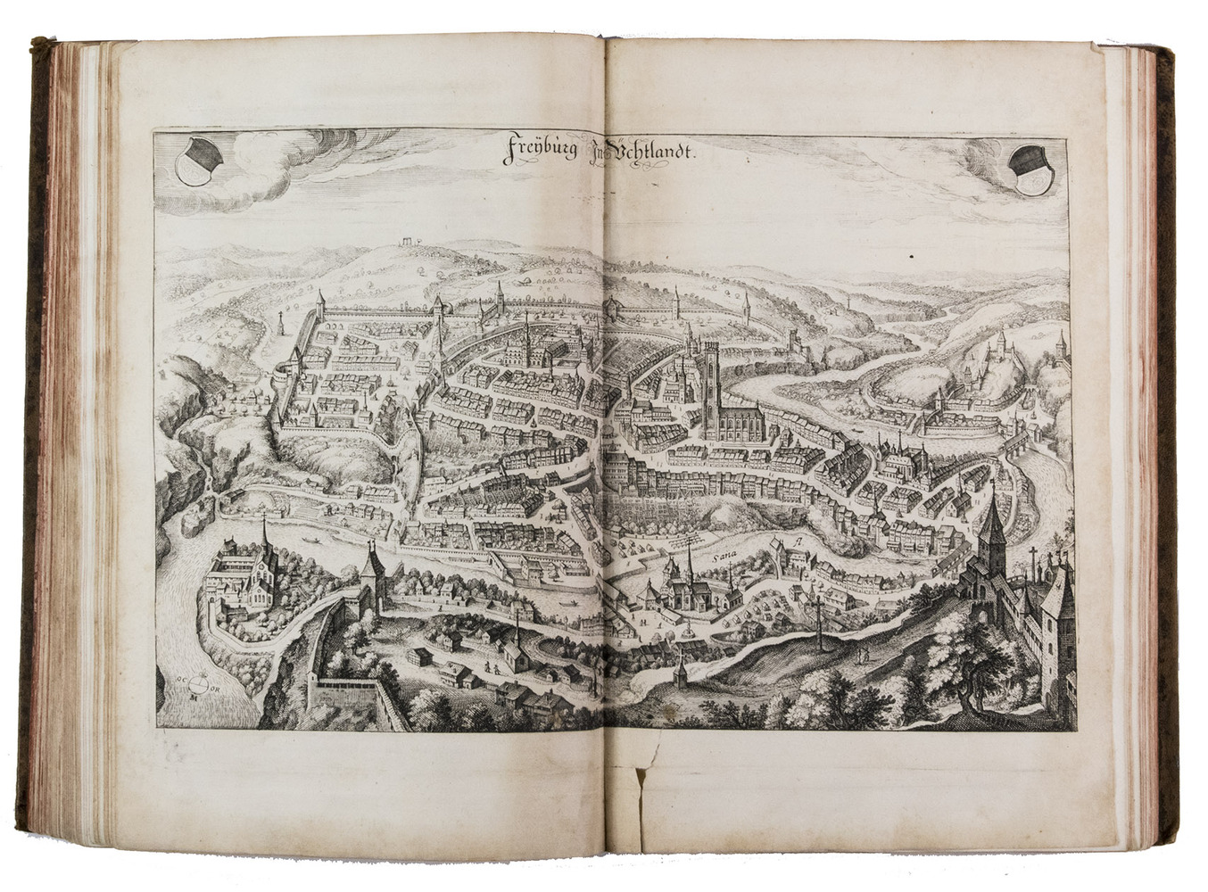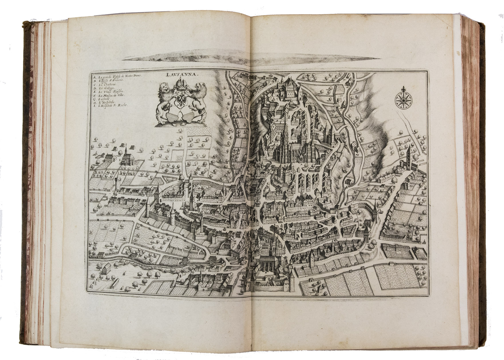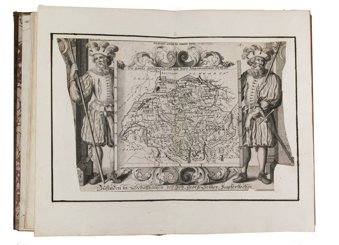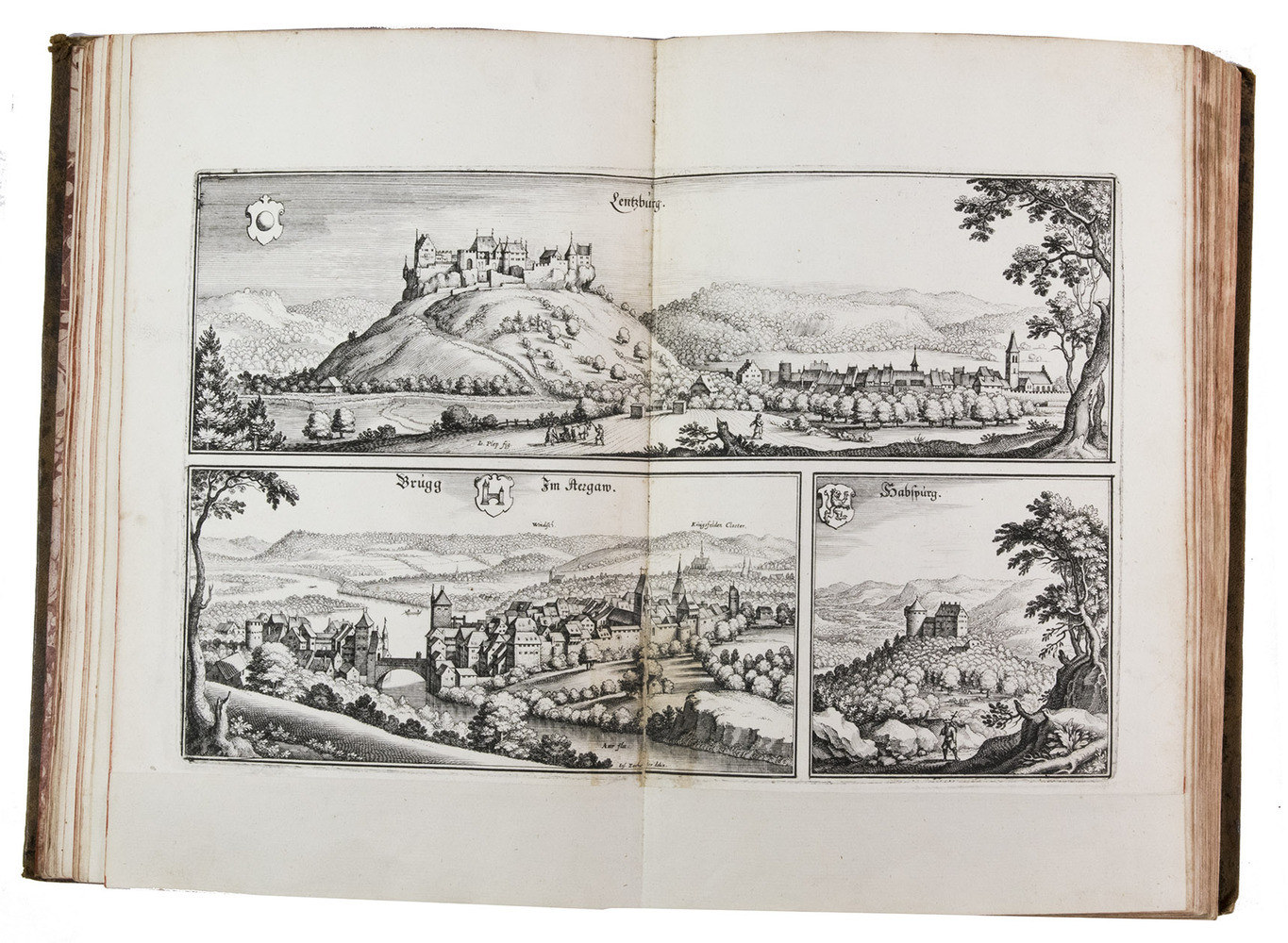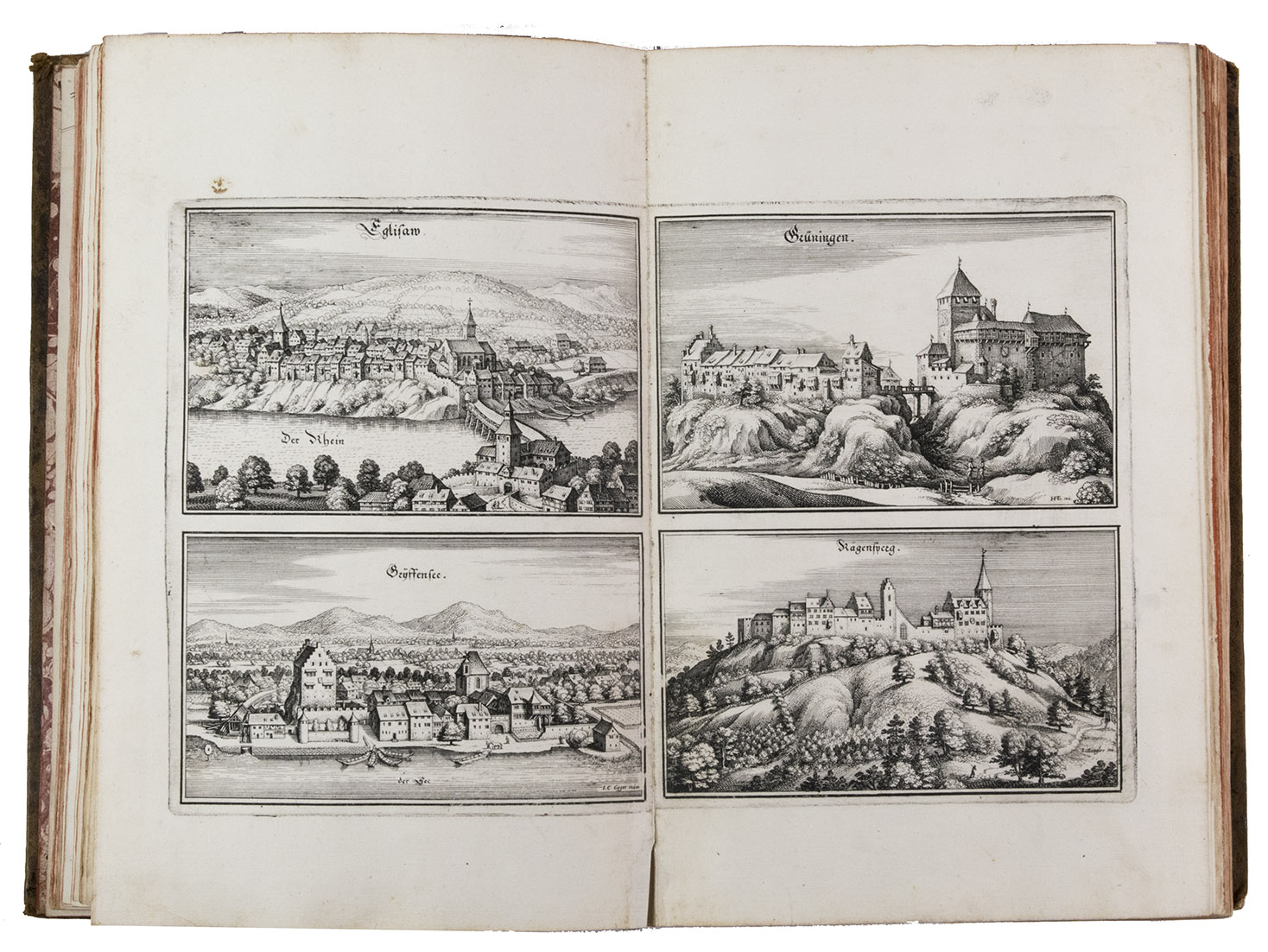 [Frankfurt am Main], Matthäus Merian, 1642. Folio. With richly engraved title-page, 74 (of 76) engraved maps, plans and views on 54 (of 56) plates normally included the 1642 first edition (nearly all double-page) plus 1 large folding plate from the 1653 Anhang, and 67 additional engravings from the 17th and 18th century, including at least 16 by or after Merian. Altogether there are 3 general maps (1 of Germany and surroundings and 2 of Switzerland), 4 detail maps, and numerous city plans and views. Lacking the bird's eye view of Herisau and the second of two views of Neuchâtel. Tanned sheepskin (ca. 1700?), gold-tooled spine. 72, [8] pp. plus engraved plates.